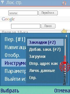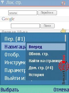 Интерфейс главного меню программы представляет собой браузер, который в полной мере схож с версией этой программы для ПК. Вверху находится строка ввода сайта к которому пользователь хочет перейти, далее следует строка ввода поисковых фраз и топ 10-ти последних запросов. Под всей этой красотой размещаются справочные функции, которые, как видно из представленного выше скриншота, весьма удачно распределены на группы.