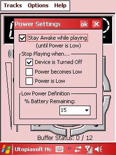 В меню "Tracks" производятся некоторые функции с Utopiasoft Hum MP3 Player, такие как: воспроизведение, стоп, информация об музыкальном файле, следующие исполнение, плэй-лист и выход. В меню "Options" выставляются: повторение, случайные, качества звука, каналов (стерео или моно), дисплей - отображение прошедшего времени или оставшегося, адаптация воспроизведение, настройки буфера и настройки информации о батареи которая не допустит критической разрядки батареи.