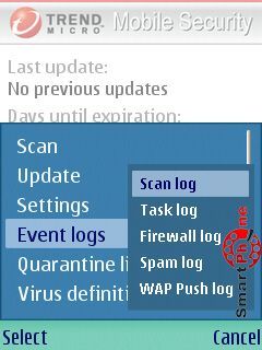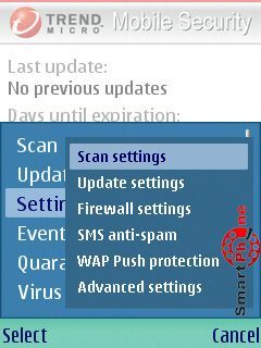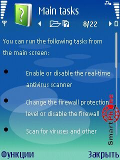 сканирования системы по требованию или в фоновом режиме; наличие "черного" и "белого" списка СМС; возможность блокировки СМС-спама; наличие сетевого монитора (firewall); возможность обновления компонентов программы (ActiveSync, WiFi, GPRS, EDGE, EV-DO ...)