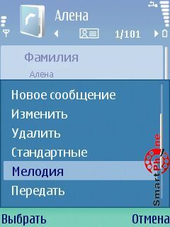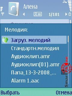 Contacts - с помощью этого операционного пункта мы можем "привязывать" видеофайл к определенному контакту из записной книги. Систематика привязки видеофайла к контакту почти такая же, как и у профилей. Отличие заключается в том, что мы заходим в интересующий нас контакт, выбираем пункт Функции, а в нем функцию Мелодия: