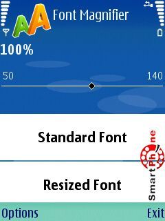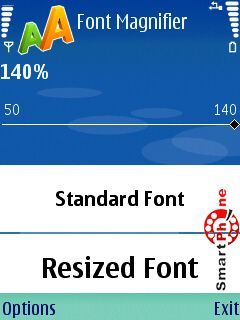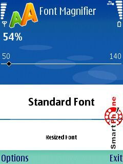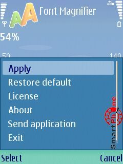 Интерфейс главного меню программы очень прост и представлен пользователю строкой процентовки увеличения/уменьшения шрифта, строкой базового размера шрифта и строкой, отображающей измененный размер шрифта. Изменение размера шрифта мы можем производить с помощью джойстика нашего смартфона (перемещение влево/вправо):