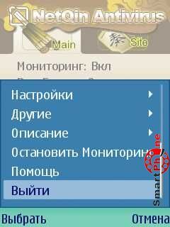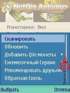 скриншоте, мы можем: активировать сканирование дискового пространства нашего смартфона, на предмет обнаружения вредоносных программ; производить обновление антивирусных баз, программа сама определяет какие компонента антивирусных баз необходимо обновить; добавлять Qin монеты на наш счет; заказать ежемесячную услугу по обновлению антивирусной базы с оплатой по СМС или по карточке пополнения; послать рекомендательное СМС по поводу данного софта нашим близким и друзьям; высказывать свое мнение и предложения разработчикам данного софта, посредством GPRS; работать с основными настройками утилиты; просматривать журнала работы утилиты и выходить из сервиса; получить информацию о данной версии программы, партнерах разработчика,