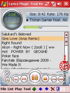 Демонстрация проигрывания песни и отображения ее текста с подсветкой. Нужно нажать стилусом Tool > Options. Для отображения текста музыкальной композиции необходимо создать одноименный файл в формате lrc или txt со словами песни и переписать его в ту же папку, где хранится песня. Имеется подсветка текущей строки воспроизведения.