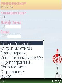 скрытый список, программа запрашивает пароль доступа; просматривать открытый список контактов программы, который не защищен