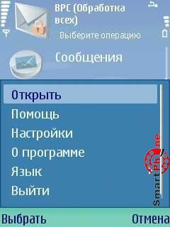 (с помощью данного пункта мы можем выйти из программы в главное меню смартфона). В случае входа в папку с сообщениями на месте пункта Открыть появляется