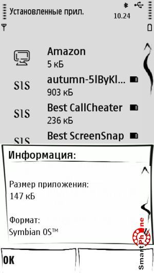 Как и большинство программ для смартфонов, утилита устанавливается путем распаковки SIS-файла. При этом все, что нужно, распаковывается в соответствующую папку, а в диспетчере приложений появится элемент для деинсталляции: