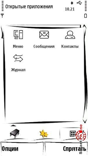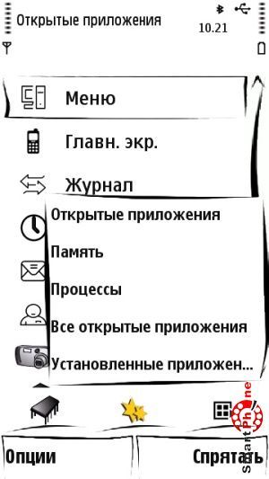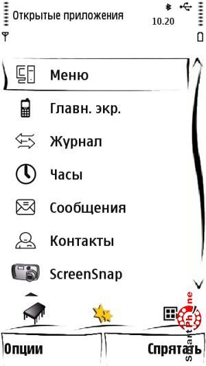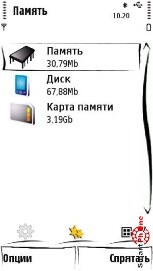 Также внизу главного меню программы присутствуют два пункта: слева пункт Опции (содержит в себе все необходимые функции для адекватной работы с утилитой). Справа находится пункт Спрятать (позволяет свернуть программу и перейти в главное меню нашего смартфона).