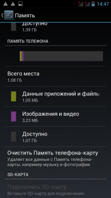 Встроенной памяти 4 ГБ, из них пользователю доступно около 2,5 ГБ. Ее можно расширить с помощью карт MicroSDHC объемом до 64 ГБ. Аналогично доступу к SIM-картам, замена карты памяти возможна только при снятом аккумуляторе.