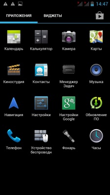 Смартфон работает под управлением операционной системы Android 4.1.2. Производитель не устанавливал поверх нее других оболочек. Стандартный перечень приложений дополнен программами AutoClear, Root Explorer, Superuser и фонариком.
