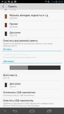 Расширение предусмотрено при помощи карт памяти до 32 ГБ включительно. Кроме того, пользователь может подключить USB-флешку и даже внешний HDD. В ситуации с последним придется набраться терпения - устройство его распознает не сразу, а секунд через 15-20 не менее. Зато после этого, скажем так, подготовительного этапа, работа вполне стабильна.