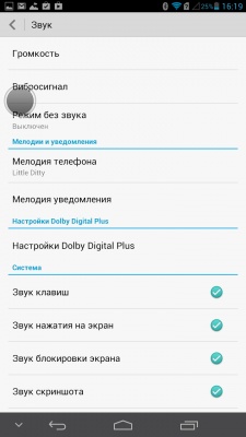 В настройках реализовано множество манипуляций с присвоением мелодий на различные уведомления. Кроме того, здесь регулировка громкости звука плюс настройки DOLBY DIGITAL PLUS - специального кодека для медиа данных.