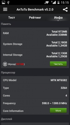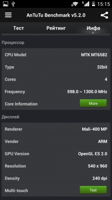 В качестве процессора здесь используется бюджетное решение от MediaTek MT6582, состоящее из 4 ядер Cortex A7 с частотой 1.3 ГГц и видеоускорителя Mali-450MP2. Объем оперативной памяти - 1 ГБ.