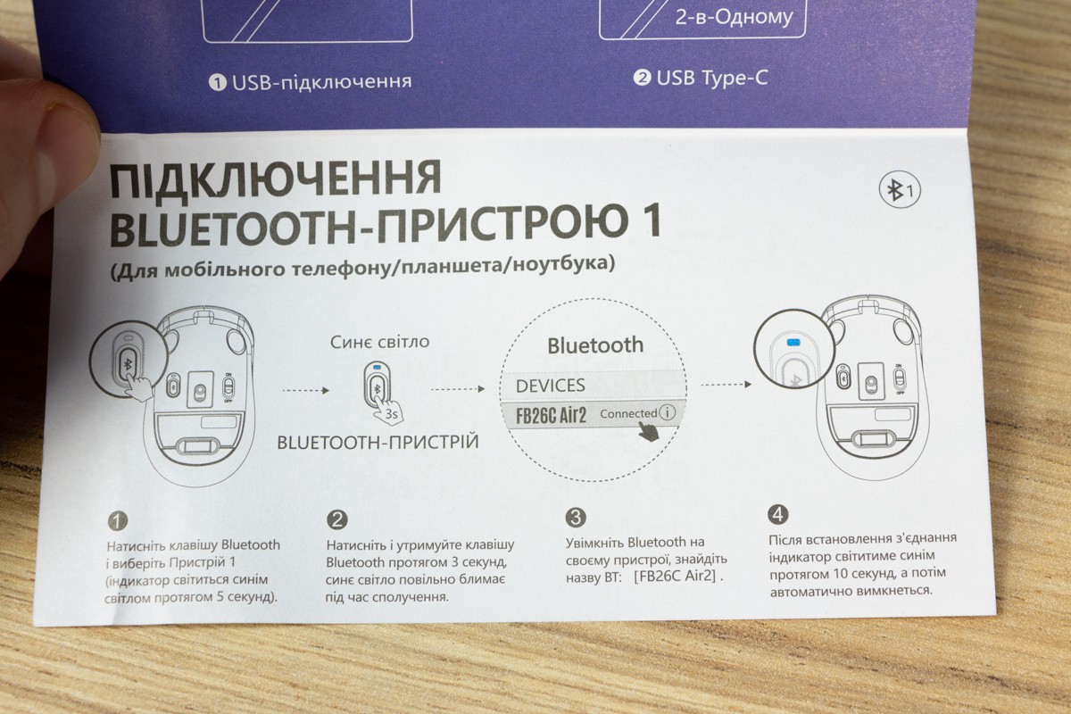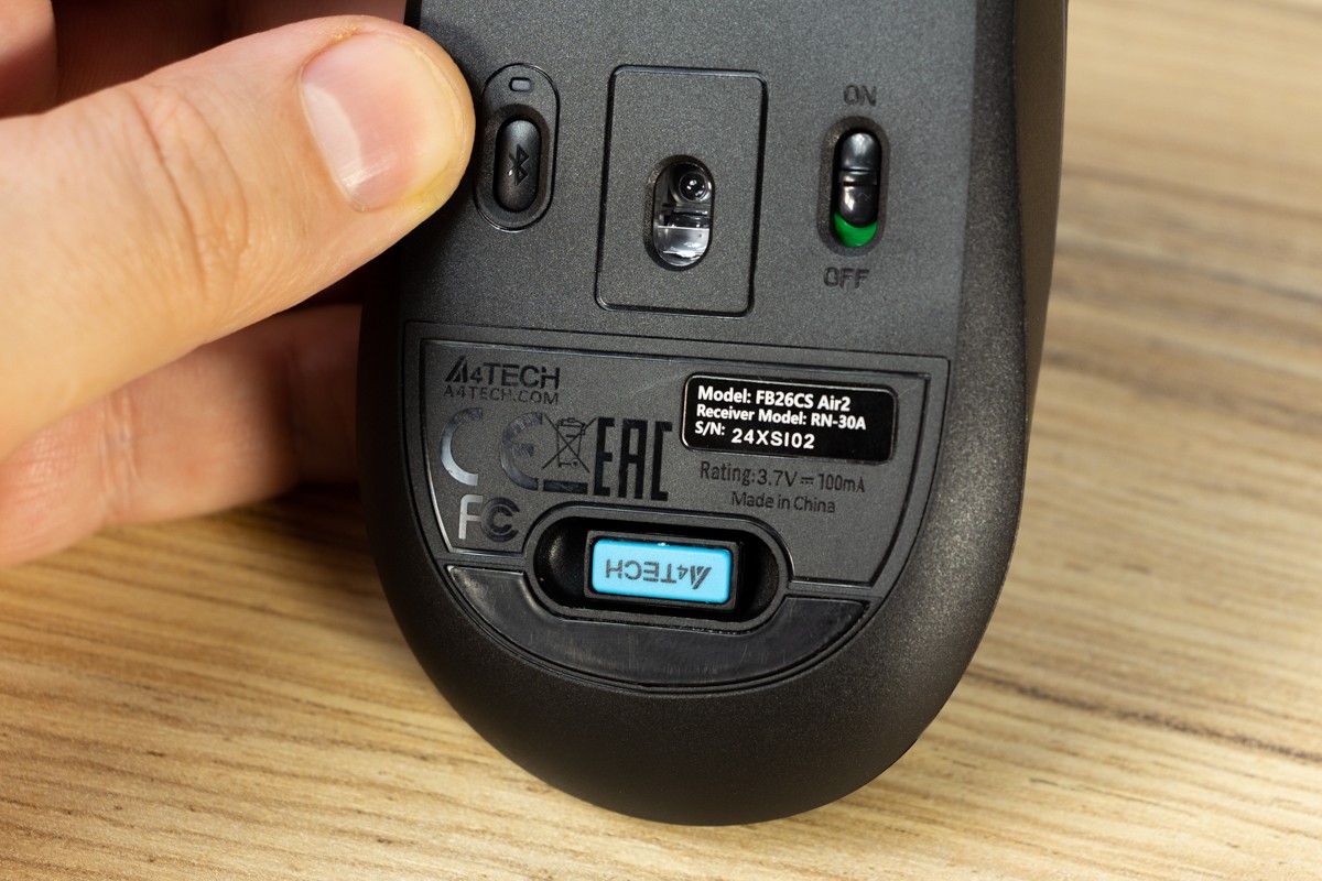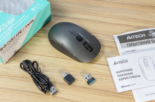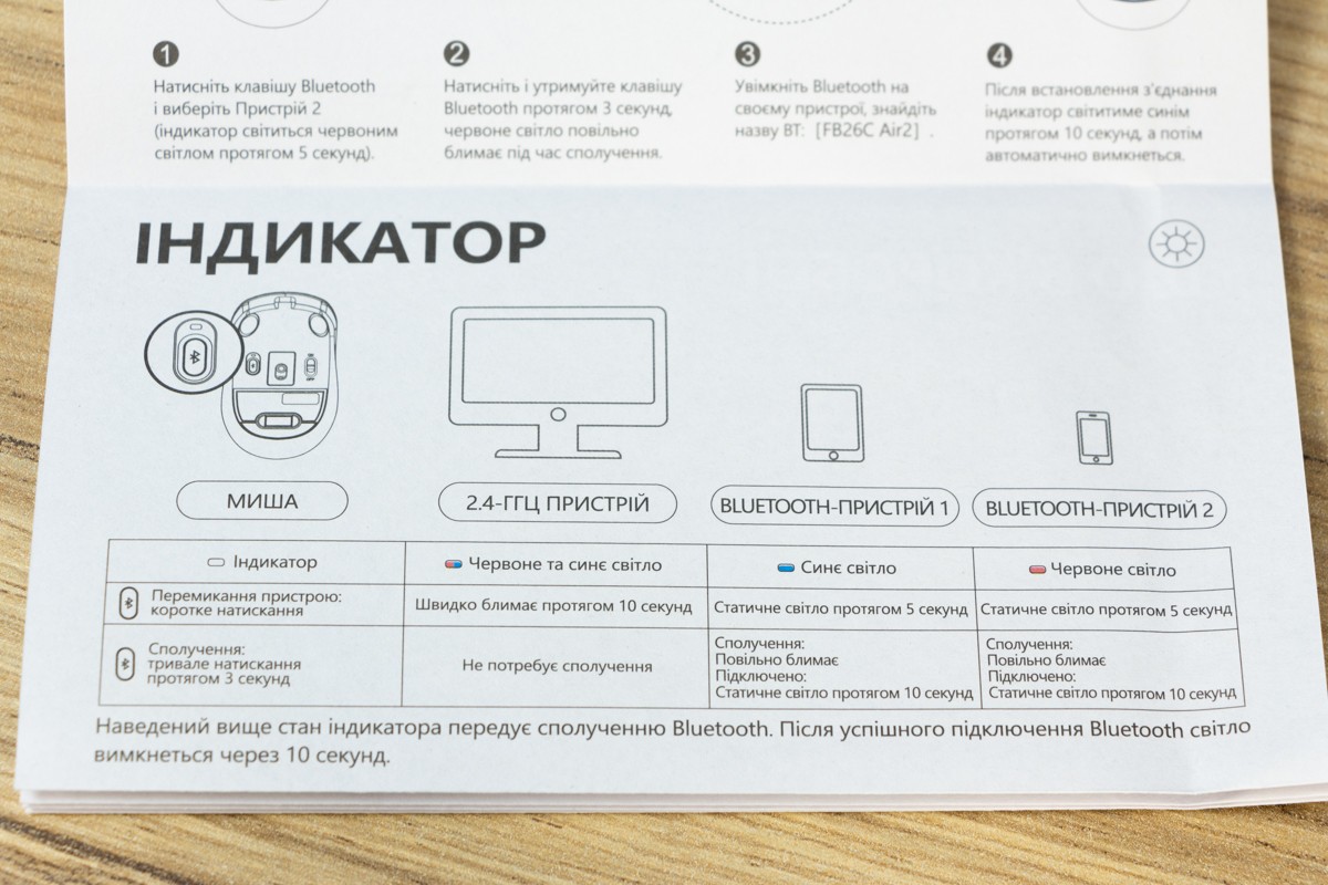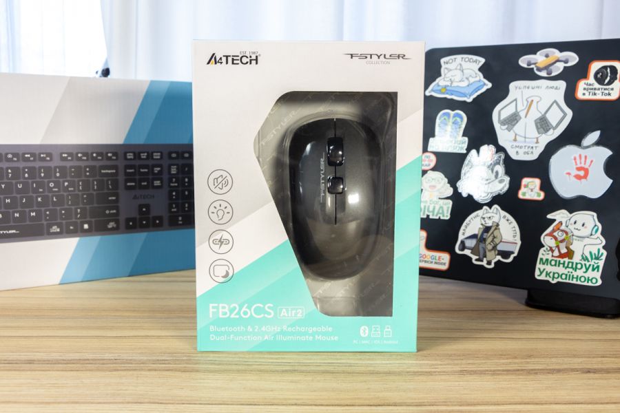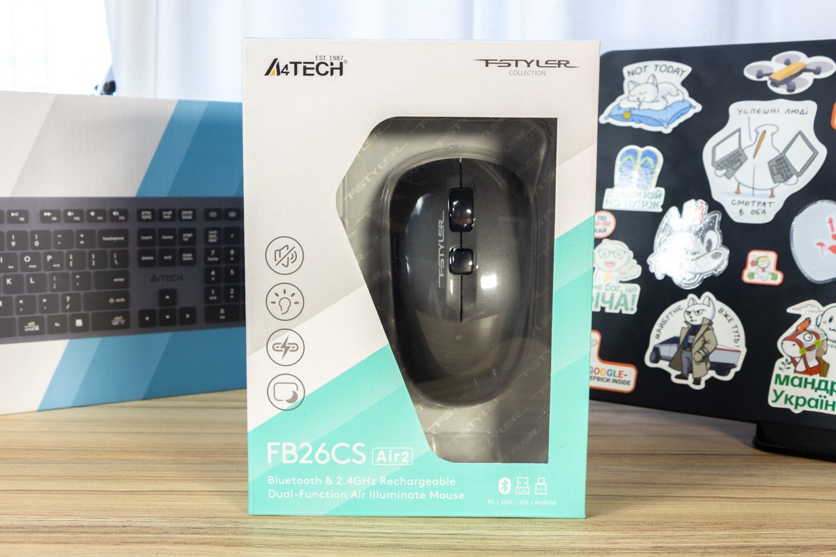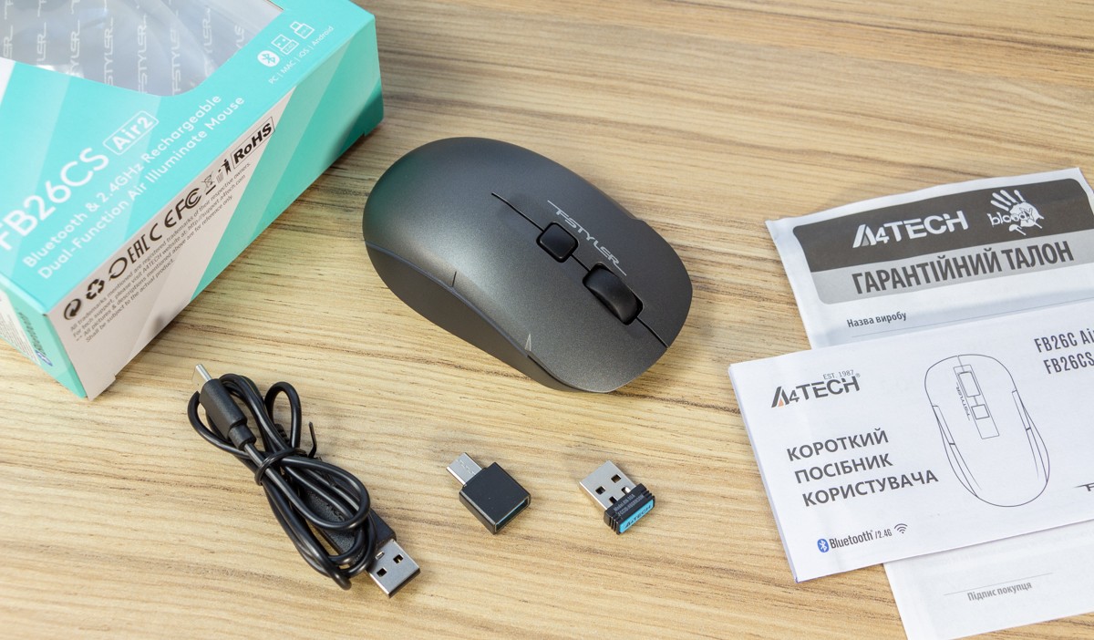 Огляд A4Tech FB26CS Air2: бездротова миша з фунцією Desk+Air з підключенням по Bluetooth і 2.4 ГГцA4Tech FB26CS Air2 - новинка серед бездротових миш середнього цінового сегмента в лінійці Fstyler, яка поєднує в собі завнішню простоту, комфорт у використанні та якісні матеріали і збірку. Мишу можна підключити до 3-х пристроїв одночасно, вона доступна по ціні та вміє трішки “літати”. Що це значить та наскільки FB26CS Air2 хороша для повсякденного користування розповідаю в огляді. КомплектаціяЗ напівпрозорої коробки при розпакуванні власник дістане мишу, інструкцію українською мовою, кабель USB Type-C, USB-адаптер 2,4 ГГц та перехідник USB-A на Type-C для адаптера. Останній іноді може бути потрібен власникам компактних ноутбуків. Дизайн та КорпусМиша A4Tech FB26CS Air2 зовні виглядає простою та ненав’язливою в плані дизайні. Яскраві елементи та написи на корпусі відсутні. Миша отримала симетричний дизайн, що робить її зручною для користування як правою, так і лівою рукою. Корпус виготовлений з чорного та сірого матового пластику, а між ними на боках додано вставки з прозорого. Матеріал стійкий до забруднень, а за два тижні активного користування не назбирав на собі подряпин та потертостей. Під прозорим пластиком захована біла підсвітка. Її можна активувати або вимкнути, утримуючи кнопку DPI протягом трьох секунд. Підсвітка корисна при роботі в умовах недостатнього освітлення. Окрім двох основних кнопок та коліщатка прокрутки, зверху на корпусі передбачена невелика чорна пластикова кнопка зміни DPI. Пара великих “робочих” кнопок майже безшумні. Це додає комфорту та дозволяє працювати з пристроєм навіть у спальних кімнатах. Коліщатко широке та прогумоване зверху. Воно невеликого діаметра, але в користуванні зручне. Між кнопками правої і лівої клавіш є зручне заглиблення, що дозволяє швидко наосліп “знайти” коліщатко та кнопку зміни DPI. На нижній частині миші розташований перемикач увімкнення/вимкнення, кнопка для вибору режиму з’єднання та слот для зберігання адаптера. На передній частині миші з самого низу по центру знаходиться порт USB Type-C для заряджання. Навіть попри те що одного разу прийшлось користуватись мишею з підключеним кабелем (пристрій підзаряджався), кабель, який “лежав” на килимку, не заважав роботі. Окремо відзначу, що відсутність дроту забезпечує високу мобільність, що робить мишу ідеальною для роботи з планшетом або ноутбуком, в тому числі і з одночасним підключенням до цих двох пристроїв. Модель FB26CS Air2 це вміє, причому одночасно може бути підключена до 3-х пристроїв. Режими роботи Миша підтримує два способи підключення – через ресивер або Bluetooth. По-перше, це дозволяє легко перемикатися між пристроями, якщо працюєте з декількома одночасно. По-друге, підвищує мобільність, бо Bluetooth зараз є майже в будь-якому ноутбуці та у всіх планшетах. Зміна режимів підключення відбувається швидко. Детально процес розписаний в інструкції. Щоб вибрати радіоканал, потрібно кілька разів натиснути кнопку вибору з'єднання, розташовану на нижній частині миші, доки індикатор не почне по черзі блимати червоним і синім кольорами. Після успішного встановлення з'єднання, світловий індикатор згасне через кілька секунд. При Bluetooth підключенні миша відображається на пристроях як "FB26C Air". Для швидкого перемикання між двома пристроями використовується кнопка вибору режиму з'єднання. Синій ін