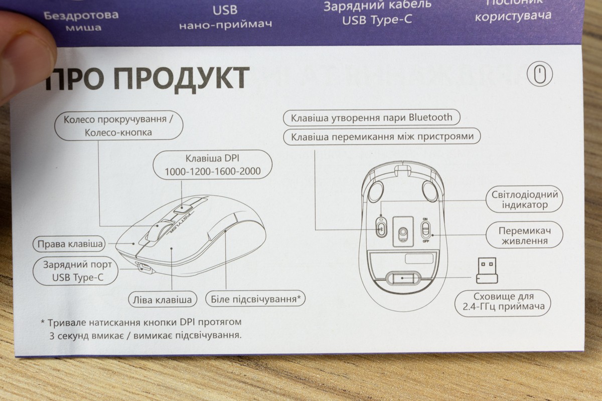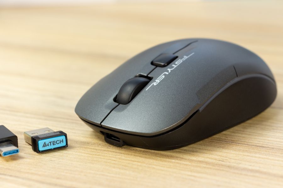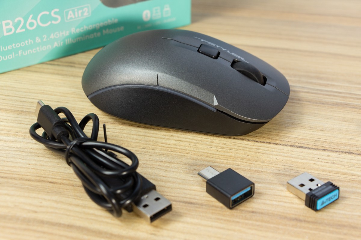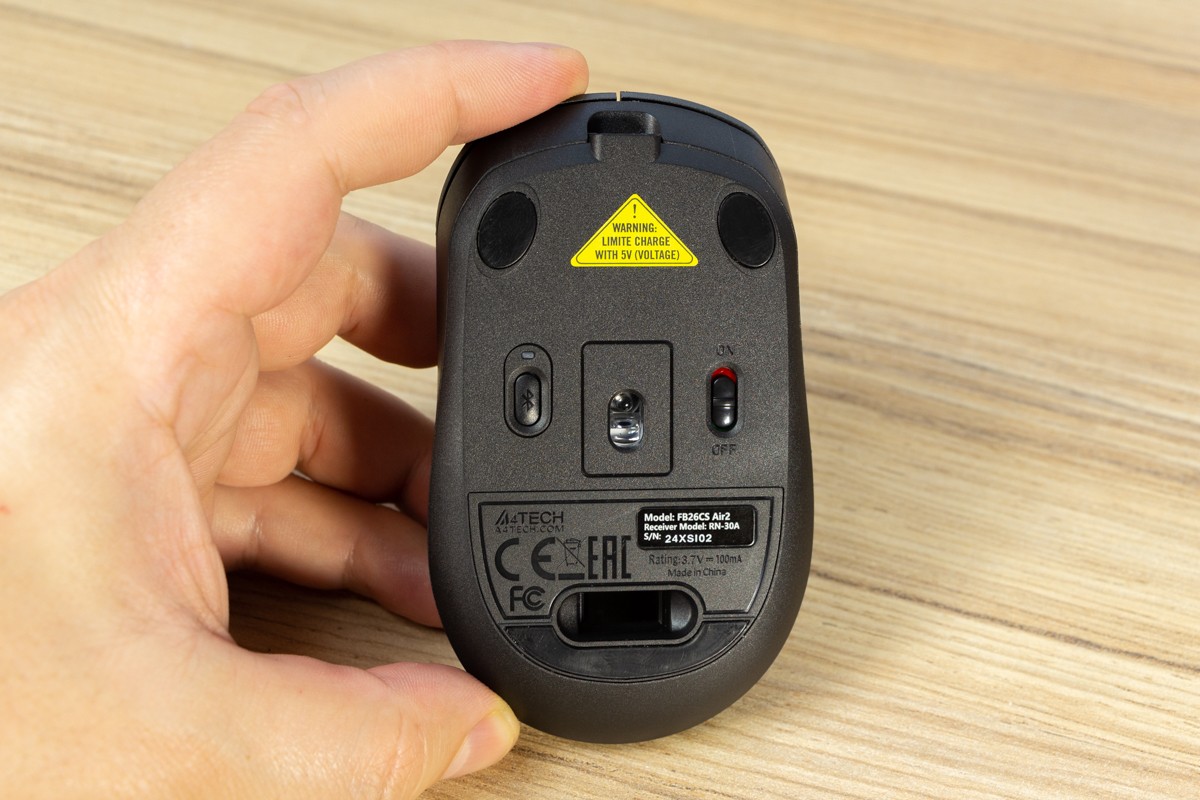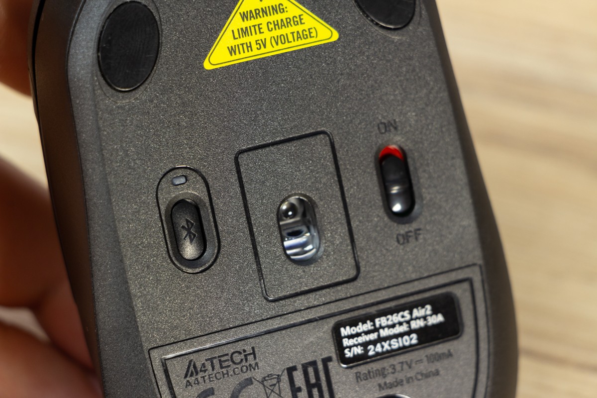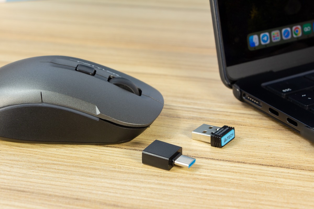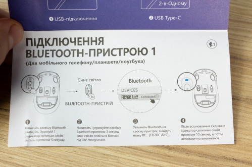 Огляд A4Tech FB26CS Air2: бездротова миша з фунцією Desk+Air з підключенням по Bluetooth і 2.4 ГГцA4Tech FB26CS Air2 - новинка серед бездротових миш середнього цінового сегмента в лінійці Fstyler, яка поєднує в собі завнішню простоту, комфорт у використанні та якісні матеріали і збірку. Мишу можна підключити до 3-х пристроїв одночасно, вона доступна по ціні та вміє трішки “літати”. Що це значить та наскільки FB26CS Air2 хороша для повсякденного користування розповідаю в огляді. КомплектаціяЗ напівпрозорої коробки при розпакуванні власник дістане мишу, інструкцію українською мовою, кабель USB Type-C, USB-адаптер 2,4 ГГц та перехідник USB-A на Type-C для адаптера. Останній іноді може бути потрібен власникам компактних ноутбуків. Дизайн та КорпусМиша A4Tech FB26CS Air2 зовні виглядає простою та ненав’язливою в плані дизайні. Яскраві елементи та написи на корпусі відсутні. Миша отримала симетричний дизайн, що робить її зручною для користування як правою, так і лівою рукою. Корпус виготовлений з чорного та сірого матового пластику, а між ними на боках додано вставки з прозорого. Матеріал стійкий до забруднень, а за два тижні активного користування не назбирав на собі подряпин та потертостей. Під прозорим пластиком захована біла підсвітка. Її можна активувати або вимкнути, утримуючи кнопку DPI протягом трьох секунд. Підсвітка корисна при роботі в умовах недостатнього освітлення. Окрім двох основних кнопок та коліщатка прокрутки, зверху на корпусі передбачена невелика чорна пластикова кнопка зміни DPI. Пара великих “робочих” кнопок майже безшумні. Це додає комфорту та дозволяє працювати з пристроєм навіть у спальних кімнатах. Коліщатко широке та прогумоване зверху. Воно невеликого діаметра, але в користуванні зручне. Між кнопками правої і лівої клавіш є зручне заглиблення, що дозволяє швидко наосліп “знайти” коліщатко та кнопку зміни DPI. На нижній частині миші розташований перемикач увімкнення/вимкнення, кнопка для вибору режиму з’єднання та слот для зберігання адаптера. На передній частині миші з самого низу по центру знаходиться порт USB Type-C для заряджання. Навіть попри те що одного разу прийшлось користуватись мишею з підключеним кабелем (пристрій підзаряджався), кабель, який “лежав” на килимку, не заважав роботі. Окремо відзначу, що відсутність дроту забезпечує високу мобільність, що робить мишу ідеальною для роботи з планшетом або ноутбуком, в тому числі і з одночасним підключенням до цих двох пристроїв. Модель FB26CS Air2 це вміє, причому одночасно може бути підключена до 3-х пристроїв. Режими роботи Миша підтримує два способи підключення – через ресивер або Bluetooth. По-перше, це дозволяє легко перемикатися між пристроями, якщо працюєте з декількома одночасно. По-друге, підвищує мобільність, бо Bluetooth зараз є майже в будь-якому ноутбуці та у всіх планшетах. Зміна режимів підключення відбувається швидко. Детально процес розписаний в інструкції. Щоб вибрати радіоканал, потрібно кілька разів натиснути кнопку вибору з'єднання, розташовану на нижній частині миші, доки індикатор не почне по черзі блимати червоним і синім кольорами. Після успішного встановлення з'єднання, світловий індикатор згасне через кілька секунд. При Bluetooth підключенні миша відображається на пристроях як "FB26C Air". Для швидкого перемикання між двома пристроями використовується кнопка вибору режиму з'єднання. Синій ін