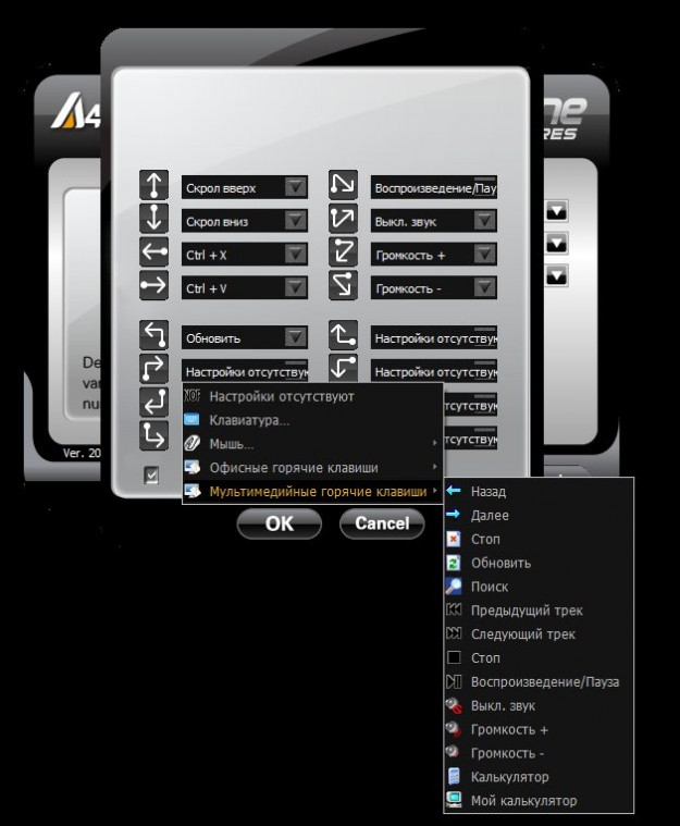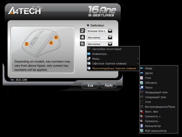 Дія програмується під затиснену праву велику кнопку та рух мишки по певній траєкторії. Вона додає мишам підтримку 16 жестів для виконання гарячих команд в ОС Windows. Це хороше доповнення, шкода що його немає під Mac.