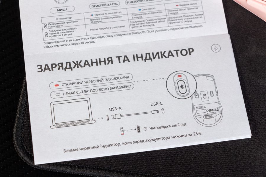 Автономність На відміну від моделей на батарейках, обидві миші на огляді оснащені вбудованим літієвим акумулятором. Заряджання відбувається через USB Type-C (кабель у комплекті), а повний цикл зарядки займає близько 2 годин. Якщо заряд знизився нижче 25%, то індикатор біля перемикача Bluetooth починає блимати червоним. За три тижні використання по 2 години на день я не зміг розрядити цю мишу навіть до цього блимання. А це значить, що заряду після 40 годин роботи залишилось більше четверті. Висновок Мати багато мишок чи одну, але універсальну? Впевнений, що більшість обере другий варіант і без зайвих зволікань зупиняться моделі A4Tech FB50C Plus / FB50CS Plus. По-перше, це компактна та легка бездротова миша, яка орієнтована на щоденну продуктивну роботу. По-друге, вона додає продуктивності, адже дозволяє перемикатись між ноутбуком, планшетом і смартфоном. Для цього не потрібно переставляти приймачі чи по декілька разів підключатись до мобільних пристроїв. Один раз налаштували, один раз натиснули на кнопку на корпусі і ви вже бачите курсор на іншому пристрої.