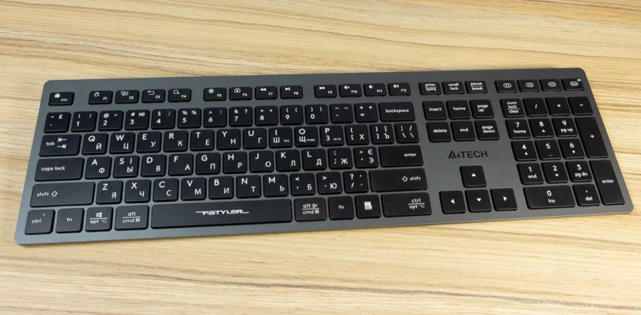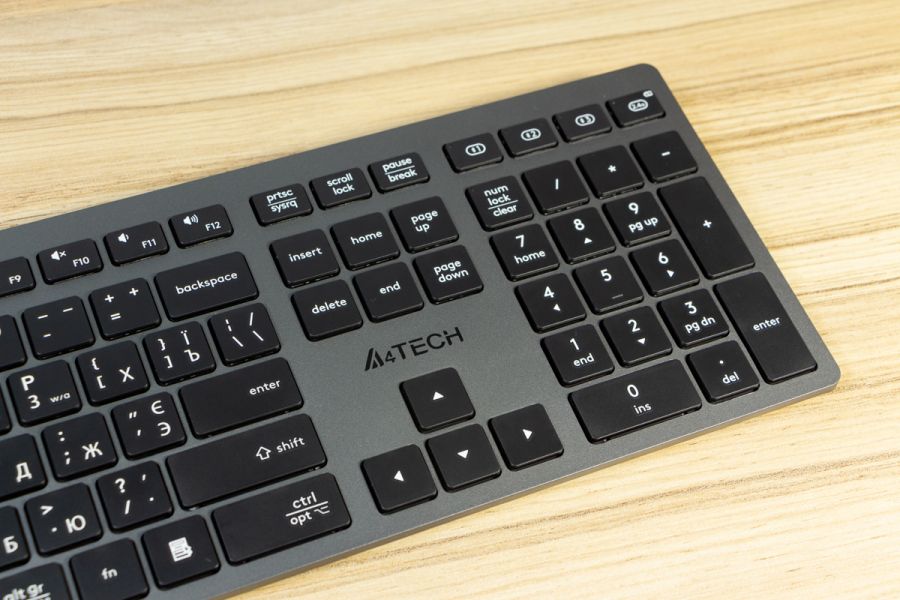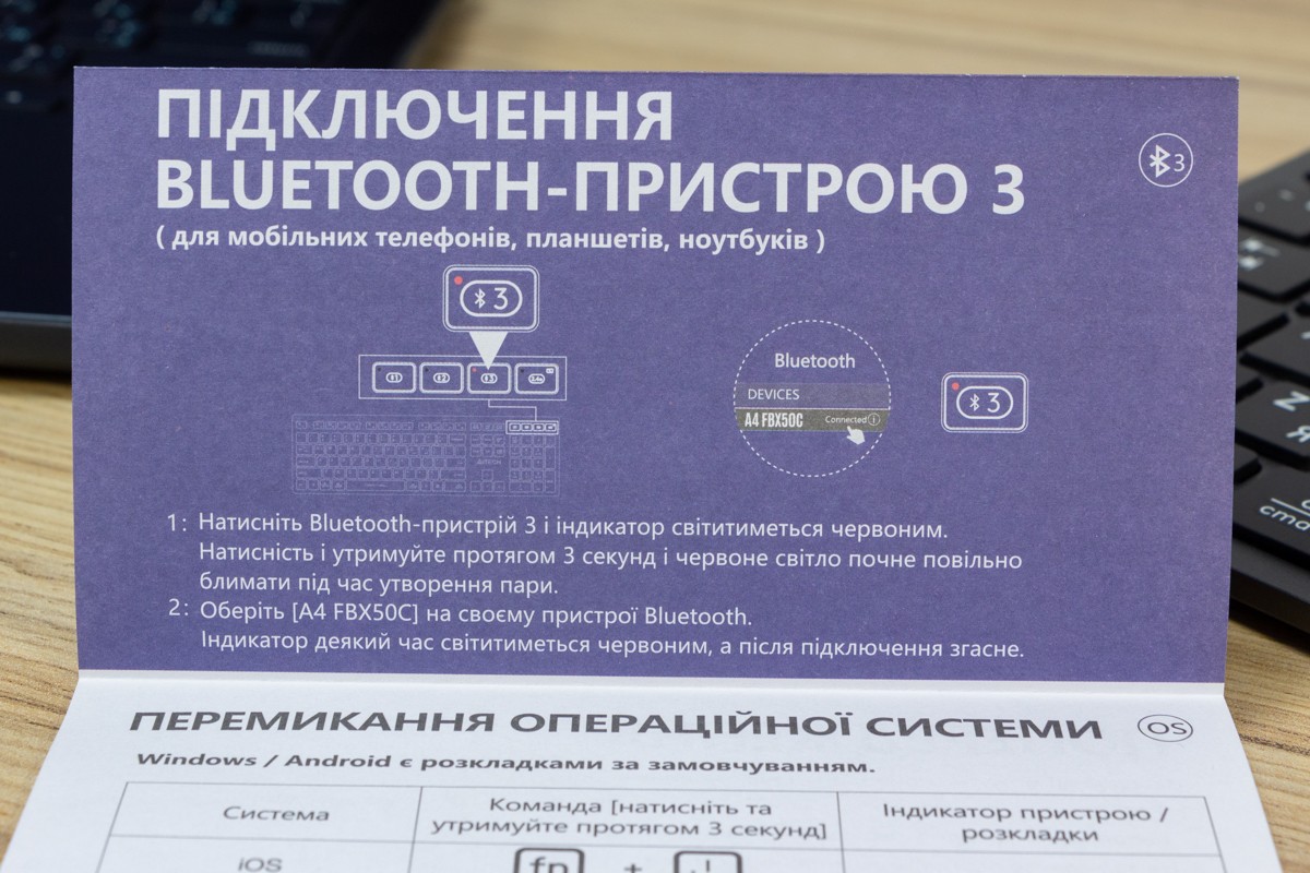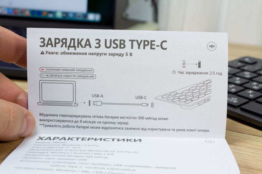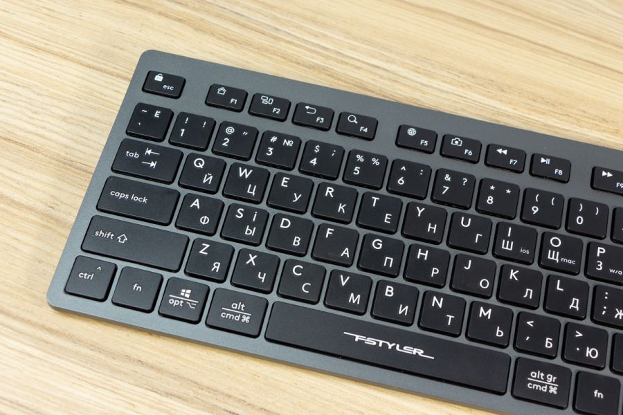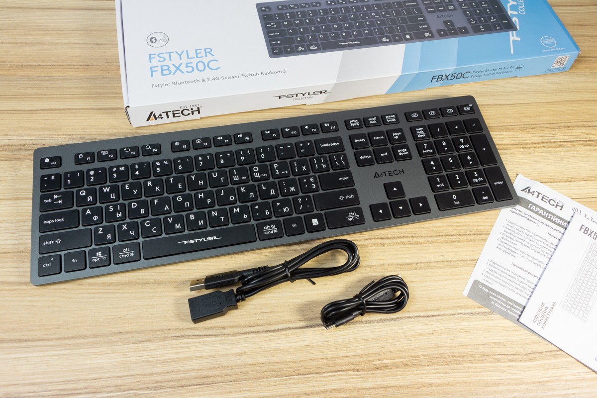 Огляд A4Tech FBX50C Fstyler: бездротова клавіатура в стилі Apple Magic KeyboardЗручна і стильна клавіатура, яку непотрібно підключати по кабелю, - це дуже актуальний аксесуар, особливо для власників компактних ноутбуків та планшетів. Ті у кого є MacBook часто купують Apple Magic Keyboard, але її прайс в понад $100 кусючий, а значить потрібна альтернатива. Низькопрофільна клавіатура з цифровим блоком A4Tech FBX50C за $30, на мою думку, ідеальний замінник, бо хоч і не з металу та виглядає стильно і не обділена корисними функціями. Її можна підключити до 4 пристроїв, заряджати через USB-C порт, а на додаток підтримується сумісність з Windows, Mac, iOS, Android. Подробиці та мої враження далі в огляді. Клавіатура A4Tech FBX50C і миша A4Tech FB26CS Air2 Комплектація В комплекті з клавіатурою отримуємо зрозумілу і детальну інструкцію українською мовою, ресивер, USB кабель-подовжувач, а також кабель USB-C - USB-А для підзарядки. Коробка інформативна і показує з якими характеристиками клавіатуру обрав покупець. Дизайн і Корпус A4Tech FBX50C - красива і витончена клавіатура, якщо ми не беремо до порівняння ігровий сегмент. Корпус зверху з темного пластику, низ чорний, клавіші також чорні. Символи на клавішах білого кольору, тож працювати з клавіатурою комфортно навіть при обмеженому освітленні. Спосіб нанесення позначок - трафаретний друк + УФ. A4Tech FBX50C - клавіатура з ножничним механізмом клавіш.Низькопрофільні клавіші зручні для набору тексту і при цьому дуже тихі. Точка спрацьовування 1.5 мм. На клавіатурі 99 клавіш. Деякі з них мають подвійні функції, що залежить від того до якої операційної системи вона підключена. Відстань між блоками клавіш і самими клавішами зручна для сліпого набору. Корпус клавіатури припіднятий на невеликий кут для зручності набору. На нижній частині передбачені чотири прогумовані ніжки, а от конструктивні елементи для зміни кута нахилу відсутні. На правому боці корпусу передбачили місце для зберігання ресивера, праворуч пусто. Попереду Type-C порт для підзарядки, перемикач увімкнення/вимкнення та кнопка перемикання в режим підключення через адаптер 2,4 ГГц. Збірка без усіляких нарікань. Матеріали підібрані, як для пристрою за $30, цілком правильні. Габарити клавіатури 126 х 420 х 20 мм. Підключення Велика перевага A4Tech FBX50C в тому, що її можна підключати до кількох пристроїв одночасно. Клавіатура підтримує з’єднання з трьома пристроями одночасно по Bluetooth і ще з одним через ресивер 2,4 ГГц. Між підключеними ноутбуками, планшетами та смартфонами можна швидко перемикатися, натискаючи одну з клавіш у верхньому правому кутку. Деталі перемикання доступно показані в інструкції. Але якщо коротко, то потрібно натиснути та утримувати 3 секунди одну з клавіш для утворення пари. А вже потім саме з'єднання відбувається майже миттєво після натискання на відповідний “номер”, а отже можна одразу продовжити роботу на іншому пристрої. Операційні системи Окрім Mac та Windows модель FBX50C можна підключати до Android та iOS. За перемикання розкладки відповідають пари клавіш Fn + I/O/P. Клавіші з подвійними функціями: Режим FN можна розблокувати або заблокувати. Список гарячих клавіш і комбінації клавіш з FN наступний: Автономність Виробник заявляє, що від повного заряду батарея на 300 мАг дасть змогу працювати до 30 днів. Я зарядив клавіатуру до повного, а це займає 2,5 години з 0 до 100%, активно два тижні користувався нею, але розрядити не зміг. Три