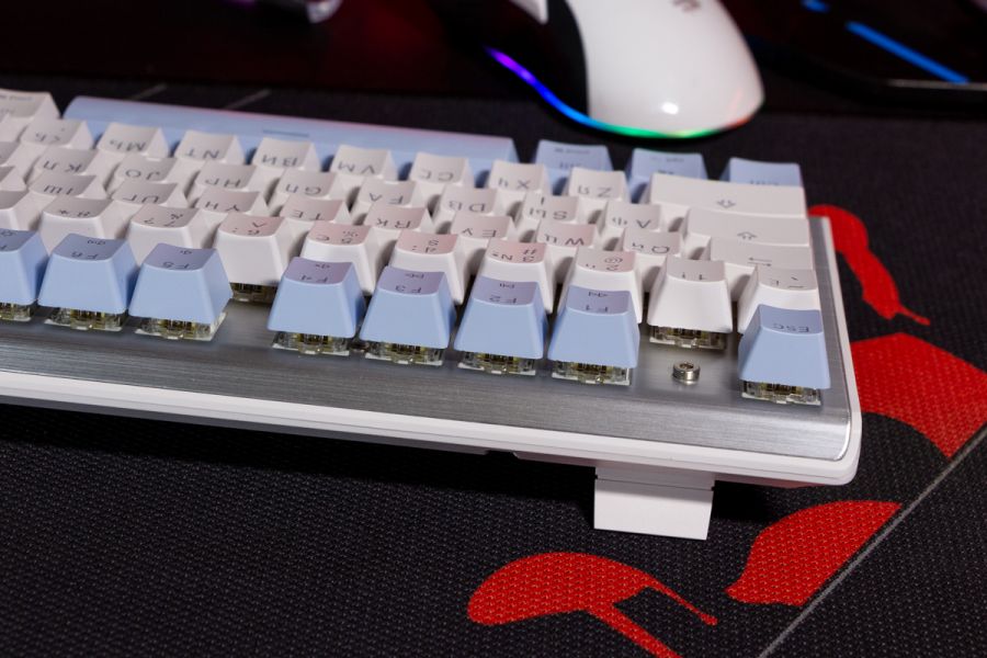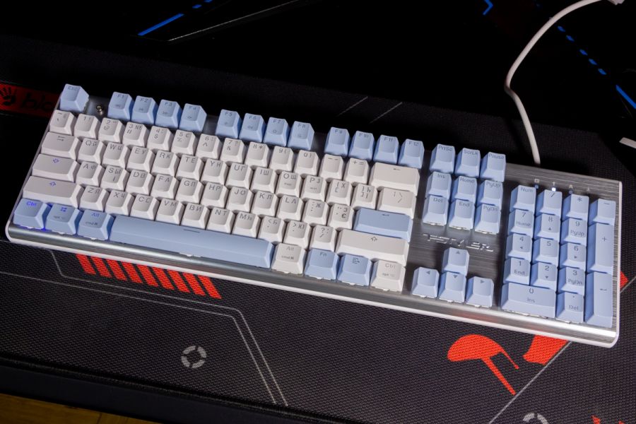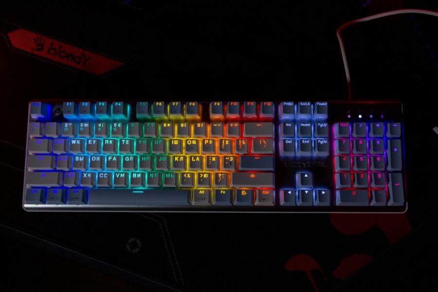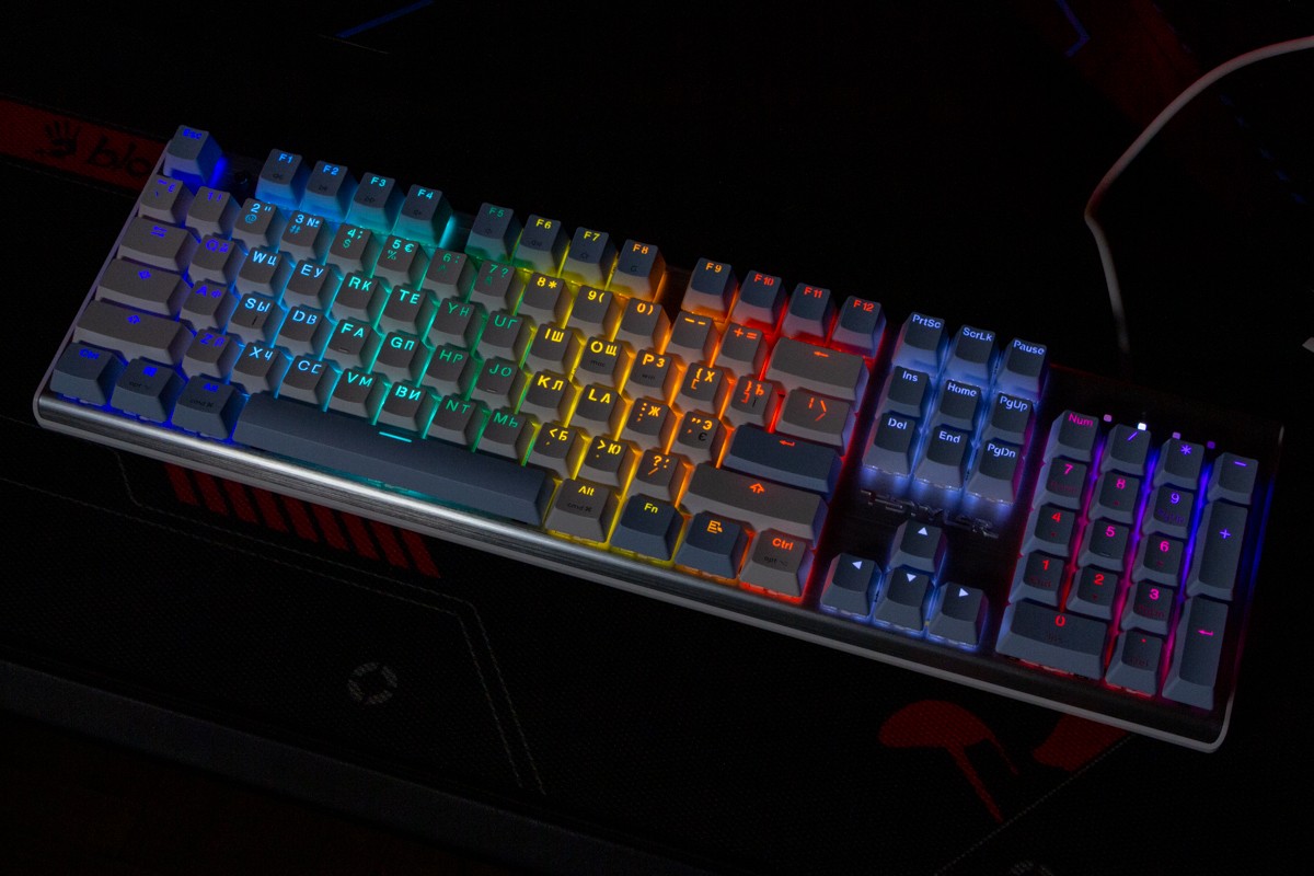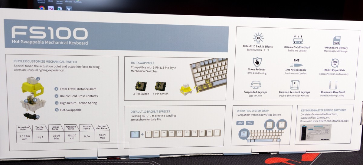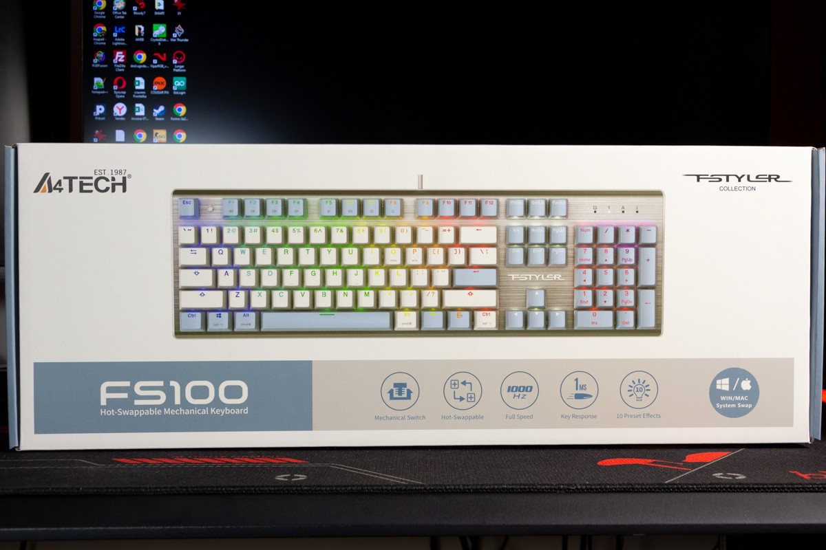 Огляд клавіатури A4Tech FS100: механіка з підсвіткою і металом в дизайніВ цьому огляді детально розповідаю про клавіатуру FS100 від бренду A4Tech з лінійки Fstyler. Без підсвітки її корпус виглядає класично, але якщо її увімкнути і почати натискати на клавіші приходить розуміння що маємо справу з ігровою клавіатурою. Вона при цьому не втратила фішок лінійки Fstyler, таких як можливість працювати під Windows і Mac з їх фірмовими комбінаціями клавіш. Ще у FS100 104 клавіші і є програмне забезпечення для налаштування декількох профілів, частота опитування клавіш 1000Гц, частота відгуку 1 мс та є можливість гарячої заміни перемикачів. Мої враження від пристрою та подробиці по характеристиках далі в огляді. Комплектація Клавіатура A4Tech Fstyler FS100 приїде до вас у коробці на якій детально інформується про характеристики перемикачів та особливості моделі. Всередині коробки лише клавіатура з підключеним нез’ємним кабелем та посібник користувача. Інструменти для зняття перемикачів і кейкапів відсутні. Це не проблема, адже в комплекті їх і немає. А якщо надумаєте докупити, то відразу ж купите інструмент. Кабель підключення заходить в клавіатуру по центру, але через канали вивести і зафіксувати його можна додатково наліво і направо. Кабель в обмотці з гуми, яка, на мій погляд, дуже надійна і довговічна. Довжини в 1,8 м метра вистачить для підключення. Дизайн та Корпус A4Tech FS100 - занадто стильна клавіатура, як для офісної. Адже саме такі моделі раніше мені зустрічались в серії Fstyler. По-перше, присутній алюміній в декорі. З металу панель під клавішами, що як мінімум наштовхує на думку, що виробник подумав про довговічність і витривалість конструкції. По-друге, сподобалось поєднання білого та блакитного кольору кейкапів. Колір ніжний і комфортний для очей, при цьому символи зчитуються добре. Офіційна назва кольору Icy Blue. Клавіатура не шумна навіть при активному наборі тексту. Багатошарова конструкція майже повністю нівелює брязкіт і його наслідки у вигляді відлуння. При необхідності під час гри або набору тексту корпус можна припідняти ніжками, змінивши кут нахилу приблизно на 5 градусів. Це додає комфорту. Також на нижній панелі передбачено три прогумованих ніжки для фіксації на слизьких поверхнях. Зверху над стрілками єдиний з видимих логотипів - Fstyler. Модель FS100 зроблена у форматі 100%, тобто у неї є повнорозмірний цифровий блок без бажання виробника зекономити на площі. І відмінність цієї моделі від також нової FS300, яка виконана у форматі 98%. FS100 отримала англійську розкладку та кирилицею. Українські літери “є”, “ї” та “і” нанесені сірим, що дуже схоже на напівпрозорий пластик яким сформовані базові набори символів. Уточню, що кейкапи виконані за технологією подвійного лиття. Тож загалом з дизайну нічого не випадає і в очах не рябить. Оскільки клавіатура сумісна з операційними системами Mac і Windows, на деяких клавішах присутні дублікати основних символів системи. Серед додаткових клавіш можна відзначити F1-F8 (для мультимедійних функцій) і "O"/"P" для перемикання між системами. Габарити клавіатури 440 х 135 х 36 мм, вага з кабелем 949 грамів. Зрібка виконана на відмінно. Перемикачі В клавіатурі FS100 встановлені перемикачі, які забезпечують рівномірне натискання на всій довжині ходу, приблизно 3 мм. Передбачена можливість гарячої заміни перемикачів з підтримкою 3 і 5-пінових, тож за бажанн