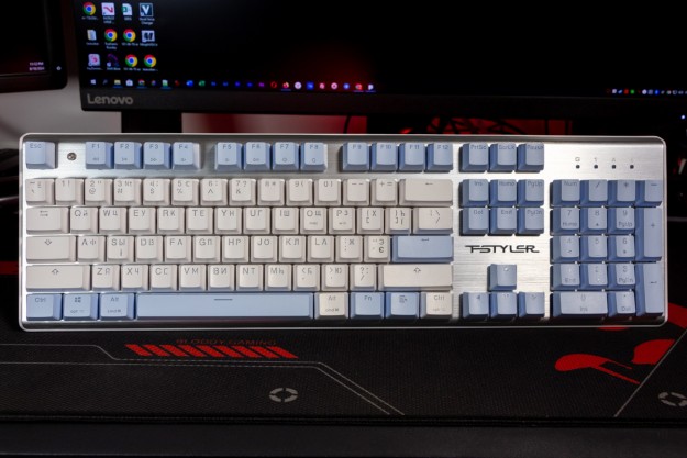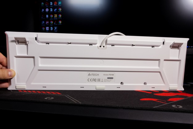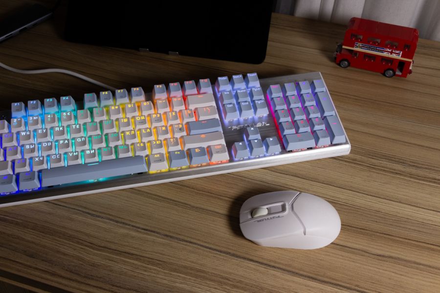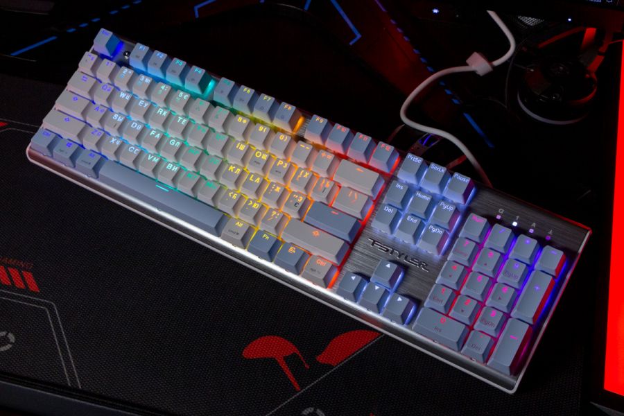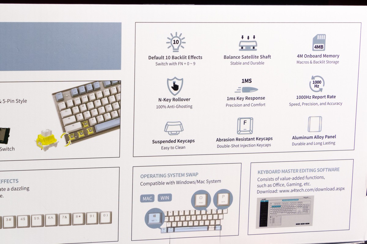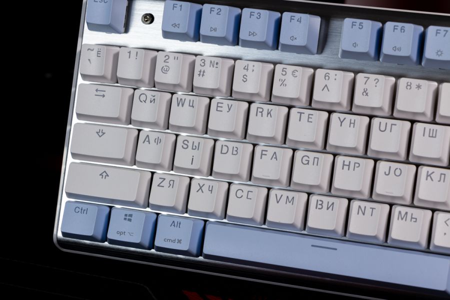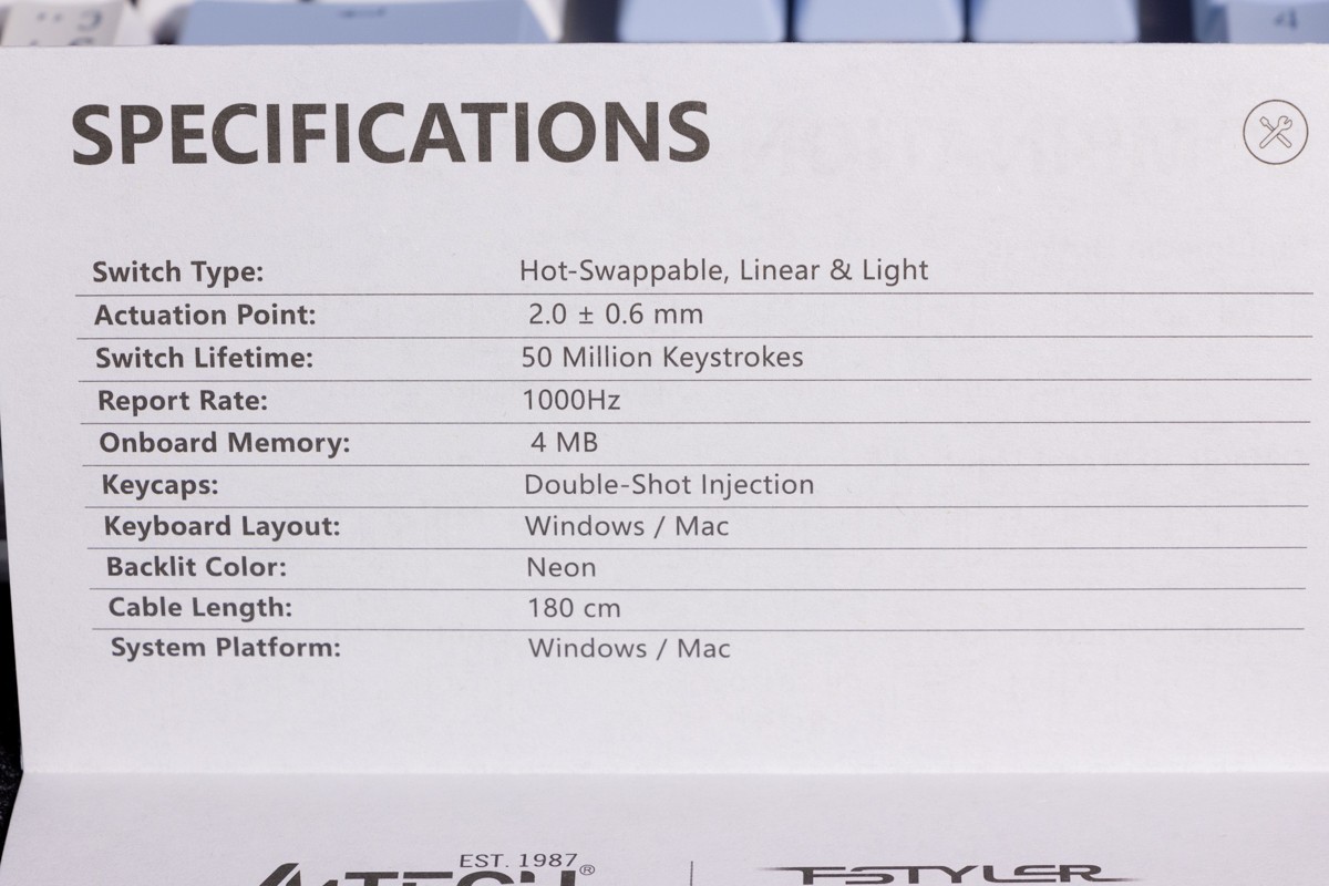 Огляд клавіатури A4Tech FS100: механіка з підсвіткою і металом в дизайніВ цьому огляді детально розповідаю про клавіатуру FS100 від бренду A4Tech з лінійки Fstyler. Без підсвітки її корпус виглядає класично, але якщо її увімкнути і почати натискати на клавіші приходить розуміння що маємо справу з ігровою клавіатурою. Вона при цьому не втратила фішок лінійки Fstyler, таких як можливість працювати під Windows і Mac з їх фірмовими комбінаціями клавіш. Ще у FS100 104 клавіші і є програмне забезпечення для налаштування декількох профілів, частота опитування клавіш 1000Гц, частота відгуку 1 мс та є можливість гарячої заміни перемикачів. Мої враження від пристрою та подробиці по характеристиках далі в огляді. Комплектація Клавіатура A4Tech Fstyler FS100 приїде до вас у коробці на якій детально інформується про характеристики перемикачів та особливості моделі. Всередині коробки лише клавіатура з підключеним нез’ємним кабелем та посібник користувача. Інструменти для зняття перемикачів і кейкапів відсутні. Це не проблема, адже в комплекті їх і немає. А якщо надумаєте докупити, то відразу ж купите інструмент. Кабель підключення заходить в клавіатуру по центру, але через канали вивести і зафіксувати його можна додатково наліво і направо. Кабель в обмотці з гуми, яка, на мій погляд, дуже надійна і довговічна. Довжини в 1,8 м метра вистачить для підключення. Дизайн та Корпус A4Tech FS100 - занадто стильна клавіатура, як для офісної. Адже саме такі моделі раніше мені зустрічались в серії Fstyler. По-перше, присутній алюміній в декорі. З металу панель під клавішами, що як мінімум наштовхує на думку, що виробник подумав про довговічність і витривалість конструкції. По-друге, сподобалось поєднання білого та блакитного кольору кейкапів. Колір ніжний і комфортний для очей, при цьому символи зчитуються добре. Офіційна назва кольору Icy Blue. Клавіатура не шумна навіть при активному наборі тексту. Багатошарова конструкція майже повністю нівелює брязкіт і його наслідки у вигляді відлуння. При необхідності під час гри або набору тексту корпус можна припідняти ніжками, змінивши кут нахилу приблизно на 5 градусів. Це додає комфорту. Також на нижній панелі передбачено три прогумованих ніжки для фіксації на слизьких поверхнях. Зверху над стрілками єдиний з видимих логотипів - Fstyler. Модель FS100 зроблена у форматі 100%, тобто у неї є повнорозмірний цифровий блок без бажання виробника зекономити на площі. І відмінність цієї моделі від також нової FS300, яка виконана у форматі 98%. FS100 отримала англійську розкладку та кирилицею. Українські літери “є”, “ї” та “і” нанесені сірим, що дуже схоже на напівпрозорий пластик яким сформовані базові набори символів. Уточню, що кейкапи виконані за технологією подвійного лиття. Тож загалом з дизайну нічого не випадає і в очах не рябить. Оскільки клавіатура сумісна з операційними системами Mac і Windows, на деяких клавішах присутні дублікати основних символів системи. Серед додаткових клавіш можна відзначити F1-F8 (для мультимедійних функцій) і "O"/"P" для перемикання між системами. Габарити клавіатури 440 х 135 х 36 мм, вага з кабелем 949 грамів. Зрібка виконана на відмінно. Перемикачі В клавіатурі FS100 встановлені перемикачі, які забезпечують рівномірне натискання на всій довжині ходу, приблизно 3 мм. Передбачена можливість гарячої заміни перемикачів з підтримкою 3 і 5-пінових, тож за бажанн