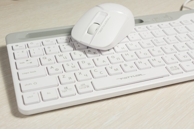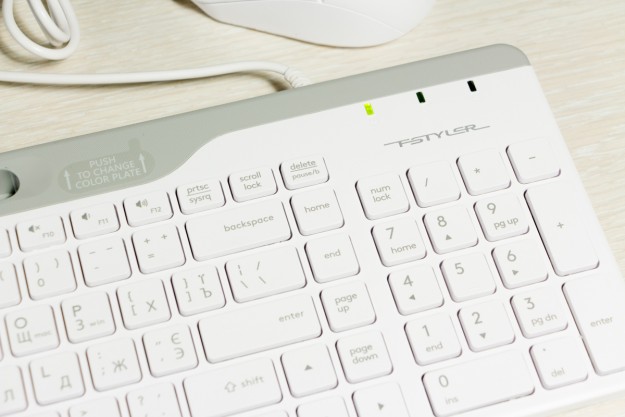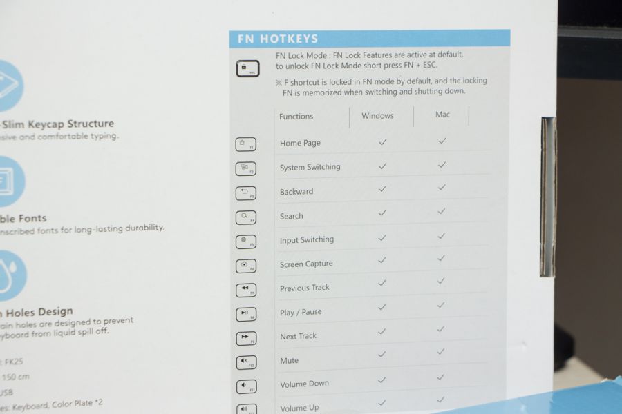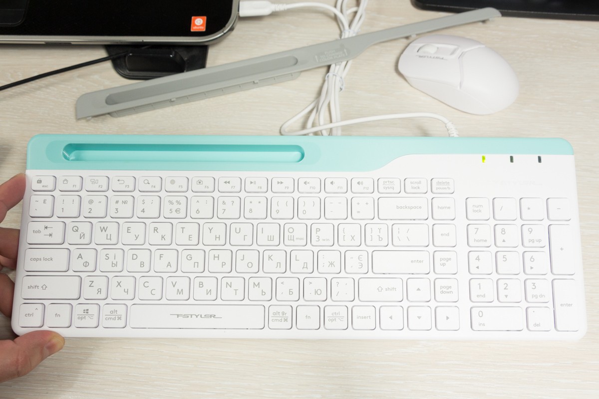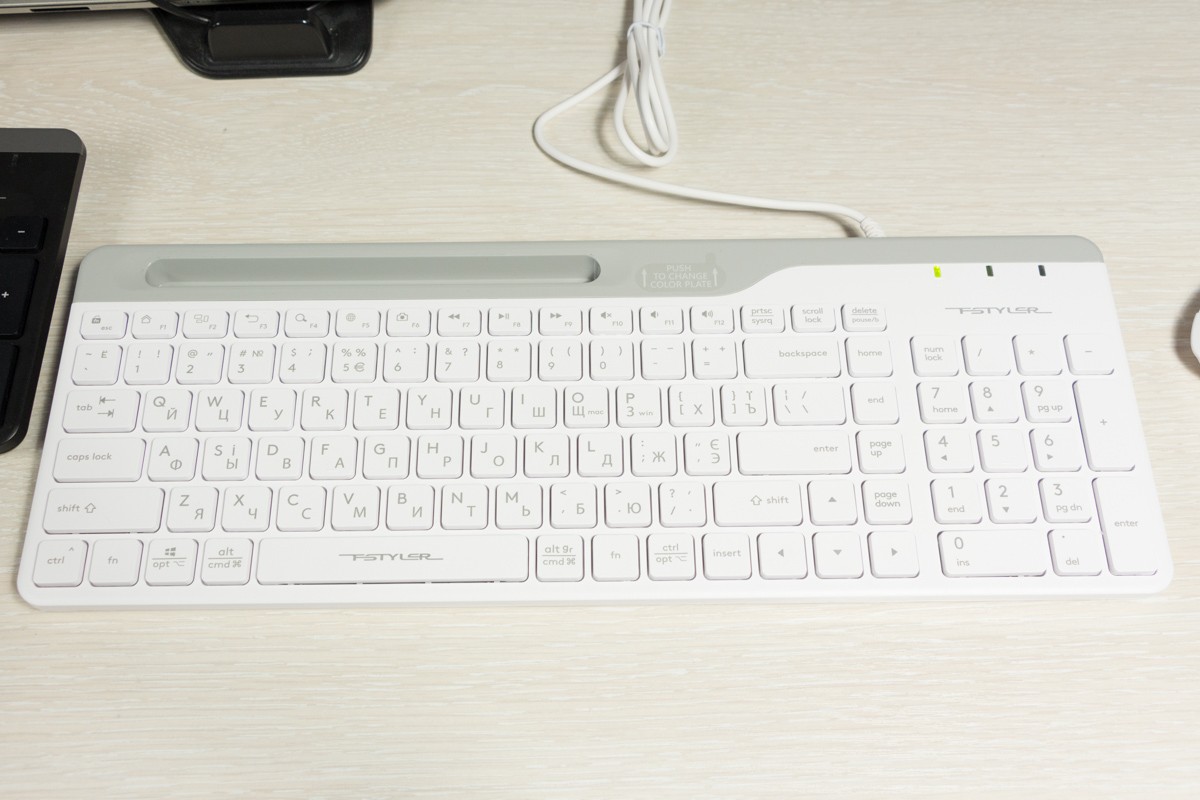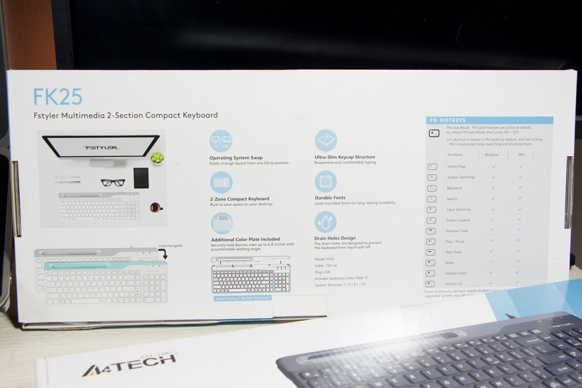 Комплектація A4Tech Fstyler FK25 запакована у міцну коробку з картону. Забарвлення стримане, але інформативне. Усередині для клавіатури передбачений надійний каркас, так що при транспортуванні до вас пристрій не постраждає. В комплект входить клавіатура, змінна кольорова панель та посібник користувача. Дизайн, Корпус, Клавіші A4Tech Fstyler FK25 - повнорозмірна провідна клавіатура. Для огляду та щоденної експлуатації вибрав білий варіант, але на фото можете бачити і чорний. За вартістю обидва варіанти можна порівняти, за можливостями також. Основний колір корпусу є чорним або білим. Додатковий колір приносить змінна верхня панелька. Вперше стикаюся з таким цікавим дизайнерським рішенням. Тому що ця панелька не просто шматок пластмаси, а ще й підставка під смартфон. У неї можна поставити смартфон навіть у чохлі, якщо аксесуар не дуже товстий. Заміна панелі – справа 5 секунд. Зізнаюся, що рішення з кишенькою цікаве та обов'язково записую його у переваги. Продовжу про особливості конструкції. Кути корпусу виконані заокругленими. Поверхня – матовий пластик. На кнопках також обійшлися без глянцю. За будь-якого освітлення позначення зчитується добре. Літери, як українського та російського, так і латинського алфавіту сірого кольору. У чорній версії – білі. Клавіші-стрілки особливо не відокремлювали, але й у розмірах не обмежували. У клавіатурі, що оглядається, передбачені мультимедійні можливості за рахунок подвійних функцій, які призначили на клавіші F1-F12. На клавіатурі мультимедійні кнопки позначили ярликами, що додає комфорту власнику. Використовувати клавіші подвійного призначення можна за допомогою клавіші FN в нижній частині клавіатури. Якщо затиснути FN + ESC, режим мультимедійних функцій блокується для випадкового натискання. На коробці з клавіатурою можна розшифрувати значення мультимедійних клавіш. На клавіші «O» та «P» додали опцію перемикання робочого режиму клавіатури з операційної системи Windows на Mac. Всі клавіші на клавіатурі A4Tech Fstyler FK25 мають заокруглені краї по контуру. Якщо активно набираєте текст і швидко переміщаєтеся пальцями на клавіатурі, клавіші не деренчать і не залипають.