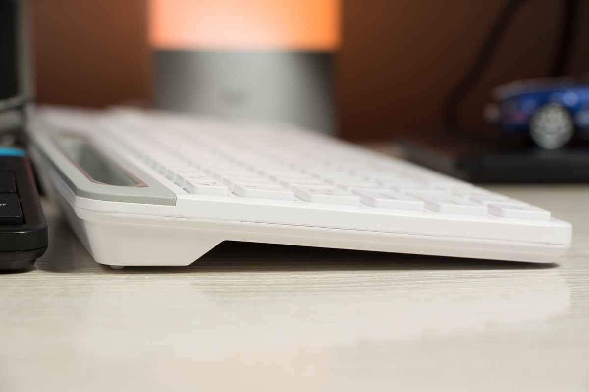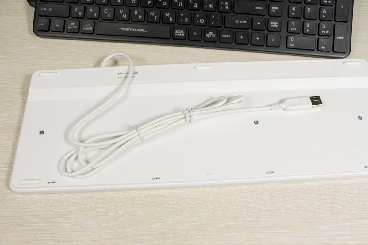 Натискання на тонкі клавіші м'яке та не галасливе. Хід комфортний за висотою і передбачуваний. Я дійсно відчував, що клавіша натиснута чи ні навіть у перший день початку підготовки огляду. Тому що цю клавіатуру використовував як основну два тижня безперервно і для написання оглядів, і при роботі в графічних редакторах, і в програмах монтажу відео. З далекого довгого ребра виходить гнучкий кабель довжиною 1,5 м. На вході він отримав захист для запобігання надмірному вигину та втрати контакту. Обплетення з тканини відсутнє, але гума навколо кабелів не найтонша. На тильній стороні клавіатури все рівно та просто. Найголовніше, чого тут немає – відкидних пластикових ніжок. Але як на мене, корпус спочатку піднятий на висоту, зручну для тривалого набору тексту. Щоб забезпечити стійкість корпусу на столі та виключити ковзання, додали п'ять м'яких прогумованих ніжок. Що буде, якщо пролити воду або чай на клавіатуру? Виробник обіцяє й надалі надійну та повноцінну роботу пристрою. Реалізовано це за рахунок вбудованих канавок щодо відведення вологи. Такий тест не проводив, але певен, що вони працюють ефективно. Висновки Дротова клавіатура A4Tech Fstyler FK25 - пристрій для масового ринку, який вигідно відрізняється від конкурентів можливістю зміни різнокольорових панелей та нішою-підставкою під смартфон. При цьому бюджетне позиціонування не вплинуло негативно на основну функцію - набір тексту. Кнопки тонкі, м'яко натискаються, хід клавіш комфортний, вони швидко повертаються у вихідне положення. На вибір покупцю виробник пропонує чорне та біле забарвлення, плюс змінна панель яскравого кольору, для того, щоб підкреслити або доповнити свій робочий стіл контрастними елементами. Для багатьох буде корисним повний набір мультимедійних клавіш. Підсвічування не передбачене, але це не обов'язково для пристрою вартістю $15. Підбираєте собі клавіатуру у цьому ціновому сегменті – обов'язково зверніть увагу на Fstyler FK25. А якщо зібралися відразу ж докупити підходящу мишку, тоді вам сподобається один з кольорів A4Tech Fstyler FG12S - бездротова, легка і компактна. Огляд мишки читайте тут.