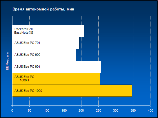 Время автономной работы определённо возросло по сравнению с Eee PC 900. У модели 901 оно увеличилось почти на час, а у 1000 – почти на три. Практически шесть часов в режиме чтения – это очень хорошо. У Eee PC 1000H результаты скромнее – немного более четырёх часов. Но это неизбежная плата за использование более быстрого и ёмкого HDD вместо SSD.
