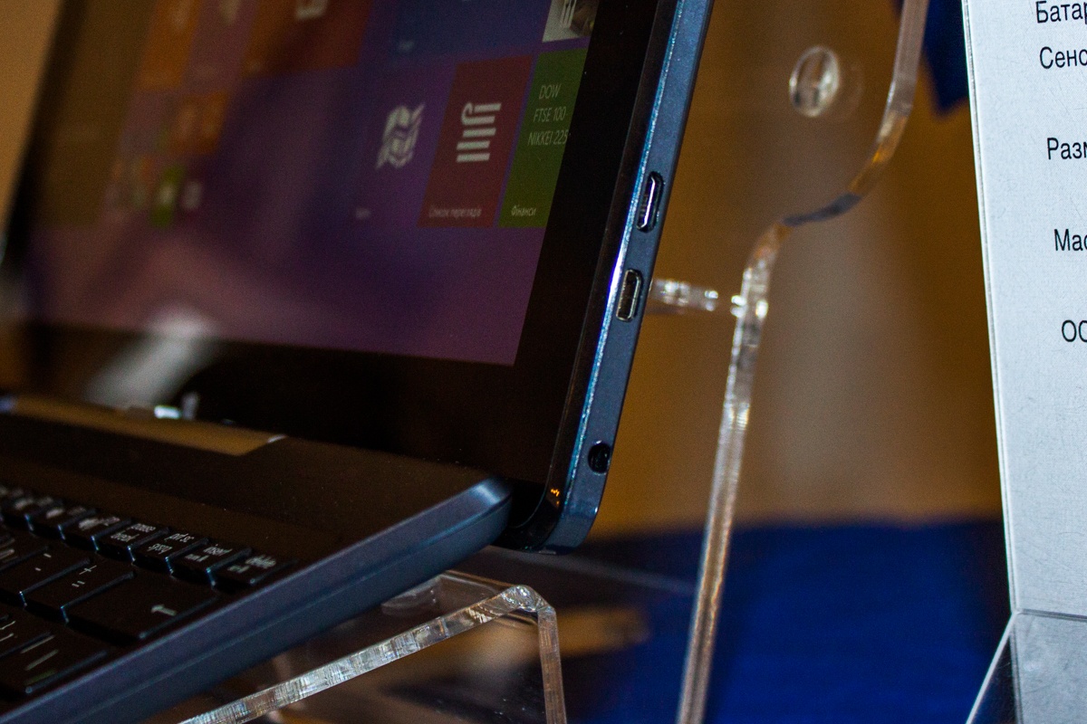 Правую боковую грань планшета разделили между собой разъемы microHDMI и microUSB, слот для карт памяти формата MicroSD и 3,5мм аудиоразъем. Левой достались клавиша «Windows» и качельки регулировки громкости, а верхней кнопка питания.