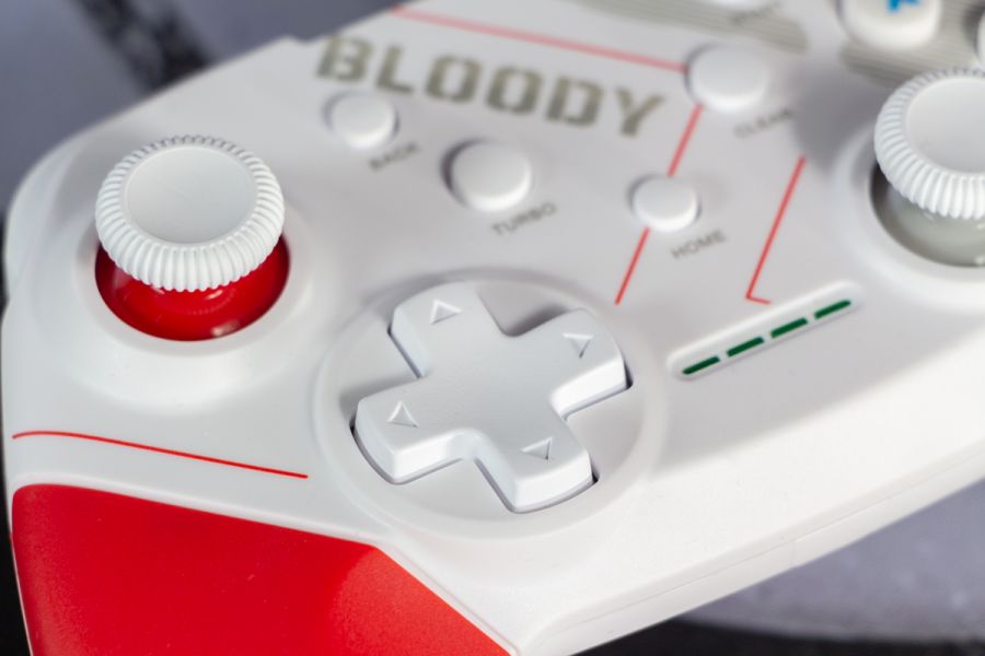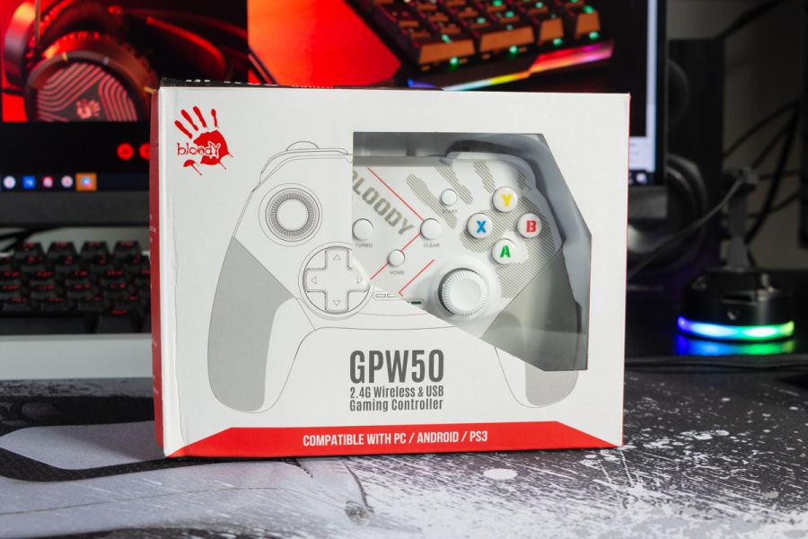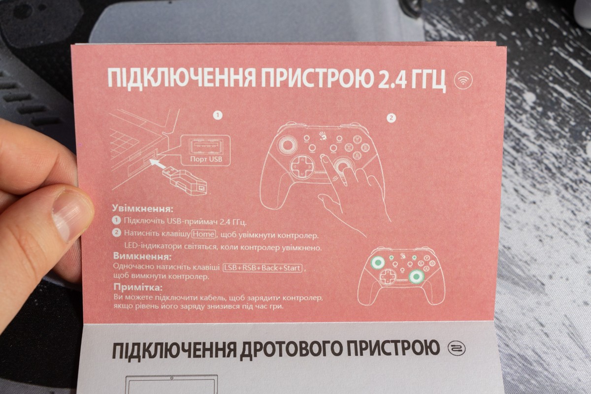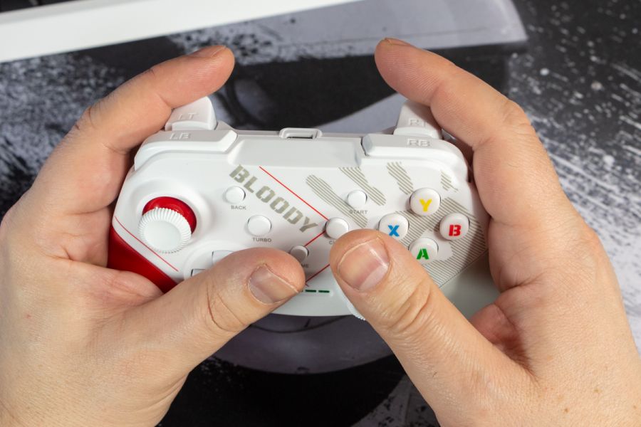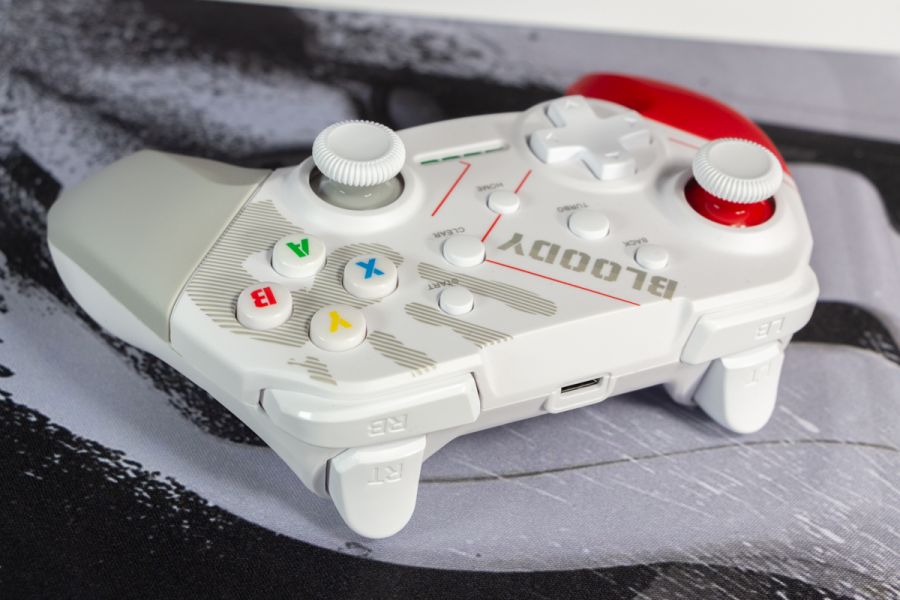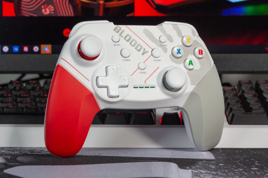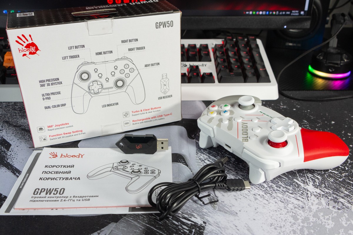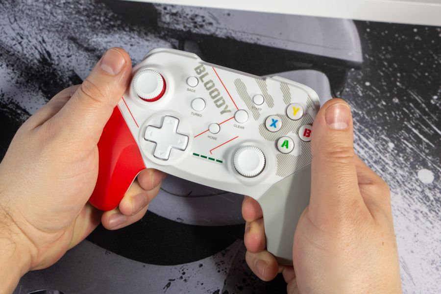 Огляд геймпада Bloody GPW50: яскравий корпус і підключення без дротівУ асортименті виробника ігрових аксесуарів Bloody є не лише клавіатури та мишки, а й спеціалізовані ігрові маніпулятори – геймпади. Найкрутішу модель GPW70, яка має більш пафосний дизайн з прогумованими вставками та RGB підсвіткою, вже оглядав. Цього разу поділюсь враженнями та покажу в дії модель GPW50 в біло-червоному кольорі корпусу Sports White. Подробиці нижче. Комплектація Геймпад потрапляє до власника у картонному боксі з віконцем, завдяки якому можна візуально оцінити пристрій без розпаковки. На зворотному боці упаковки розміщена детальна схема з описом всіх кнопок ігрового контролера Bloody GPW50. В коробці надійно запаковано геймпад, приймач бездротового сигналу, метровий USB A - USB C кабель для підзарядки і дротового підключення, інструкція. Дизайн і Корпус Почну з першого враження, яке сформував одразу як побачив геймпад і тактильно познайомився з матеріалами. У Bloody GPW50 дуже приємний по формі корпус, який виконаний із щільного матового пластику. Пристрій виглядає привабливо завдяки яскравій накладці червоного кольору, органічно вмальованому логотипу та яскравим написам на кнопках. Геймпад оснащений аналоговими стіками, розташованими асиметрично. Схема розміщення кнопок XYAB повторює Xbox. Додатковий комфорт у використанні забезпечують навігаційні клавіші Back, Home і Start. На передній частині геймпада розміщені два тригери та два курки. Між ними місце входу кабелю в корпус. Нижня частина корпусу не містить додаткових кнопок на відміну від моделі GPW70. З одного боку хотілось би більше функцій, а з іншого на геймпаді немає елементів що потребують звикання. А значить маємо стандартне управління та універсальне розміщення перемикачів та кнопок. Пара білих аналогових стіків покриті прогумованим матеріалом, що додає зчеплення з пальцями та надійніший контроль ігрового процесу. Всі інші кнопки гладкі, але над корпусом достатньо виступають і натискаються з зусиллям, що має знизити кількість випадкових натискань. Навіть якщо будете намагатись сильно зкручувати корпус скрипу не почуєте. Тож упевнений, що навіть в руках дуже агресивного геймера GPW50 зможе протриматись дуже довго. Корпус добре справляється з діагональними навантаженнями, не скрипить і створює відчуття цілісності конструкції. В моїх руках геймпад лежить комфортно, пальці дотягуються до усіх кнопок та перемикачів, з над зусиллям ні до чого не доводиться тягнутися. Долоні не втомлюються навіть при тривалому використанні, а завдяки матовому покриттю геймпад не вислизає з рук. Враження та Використання Підключав геймпад до комп’ютера на Windows та Android смартфона, вони без нюансів розпізнали пристрій. При підключенні до ПК загоряється другий індикатор, що сигналізує про активний режим X-input – найпоширеніший і актуальний стандарт. Водночас виробник передбачив можливість перемикання на старіший D-input, який стане в пригоді для ігор з 90-х та емуляторів. Для зміни режиму достатньо утримувати кнопку Home протягом трьох секунд, після чого загоряється перший світлодіод. Геймпад без проблем розпізнається у всіх іграх на ПК, і жодних додаткових налаштувань не потрібно. Спробував і автомобільний симулятор і звичайно ж файтинги. Для обох цих стилів, та й для інших, зручним виявився режим Turbo/Clear, що дозволяє швидко користуватись складними