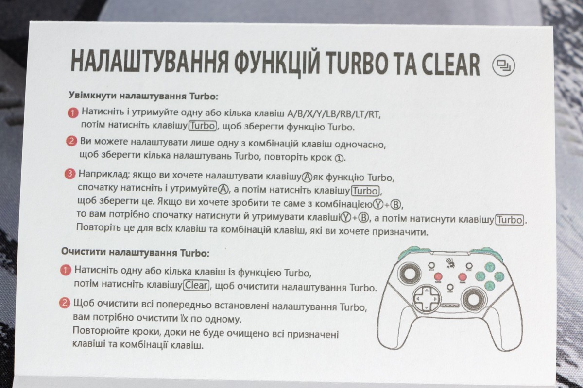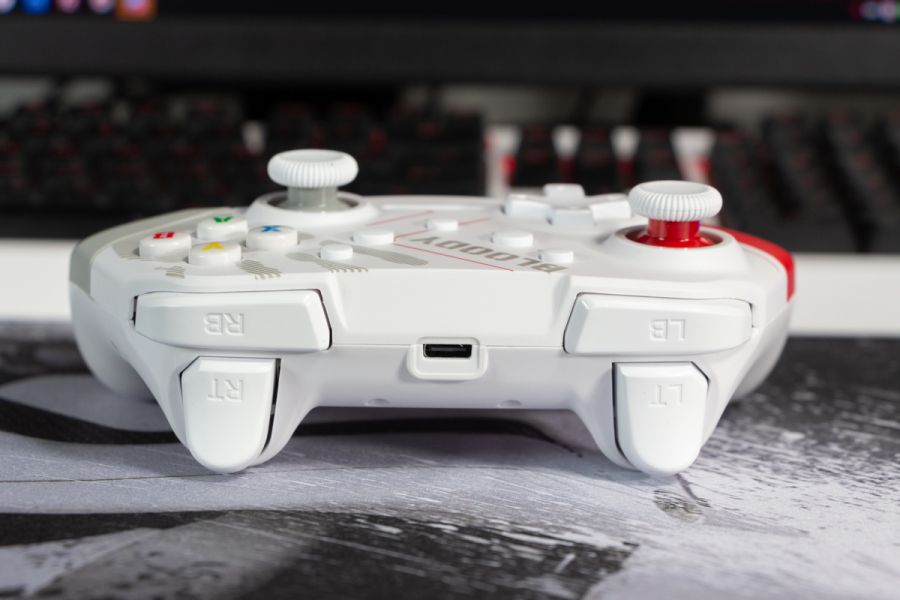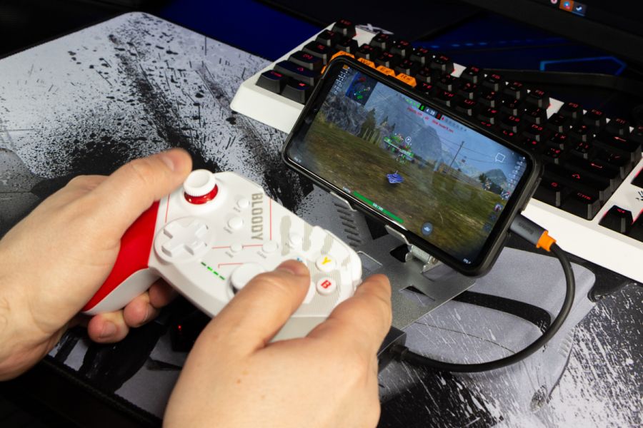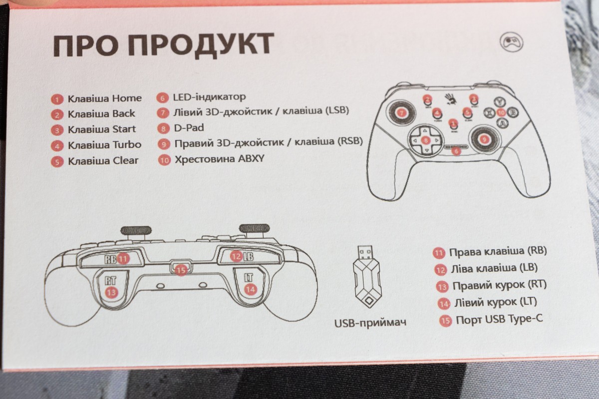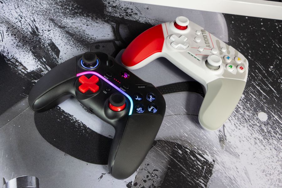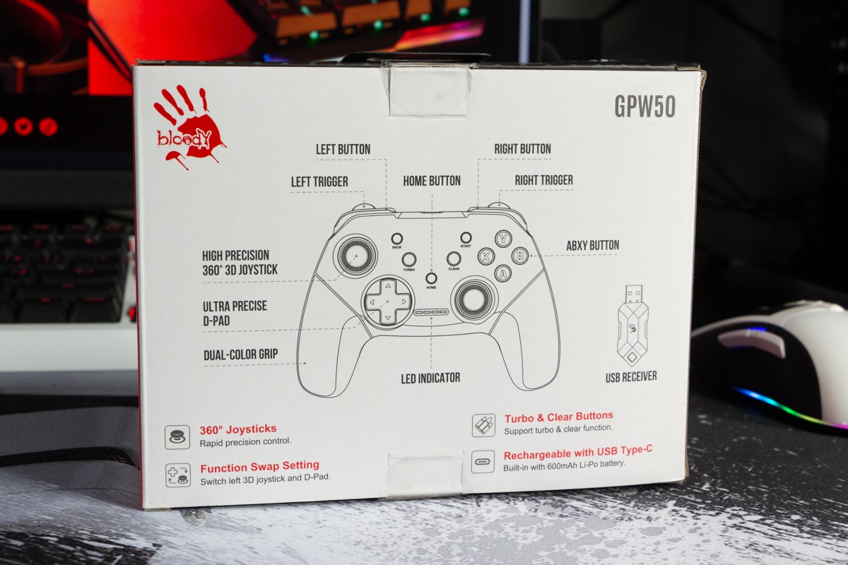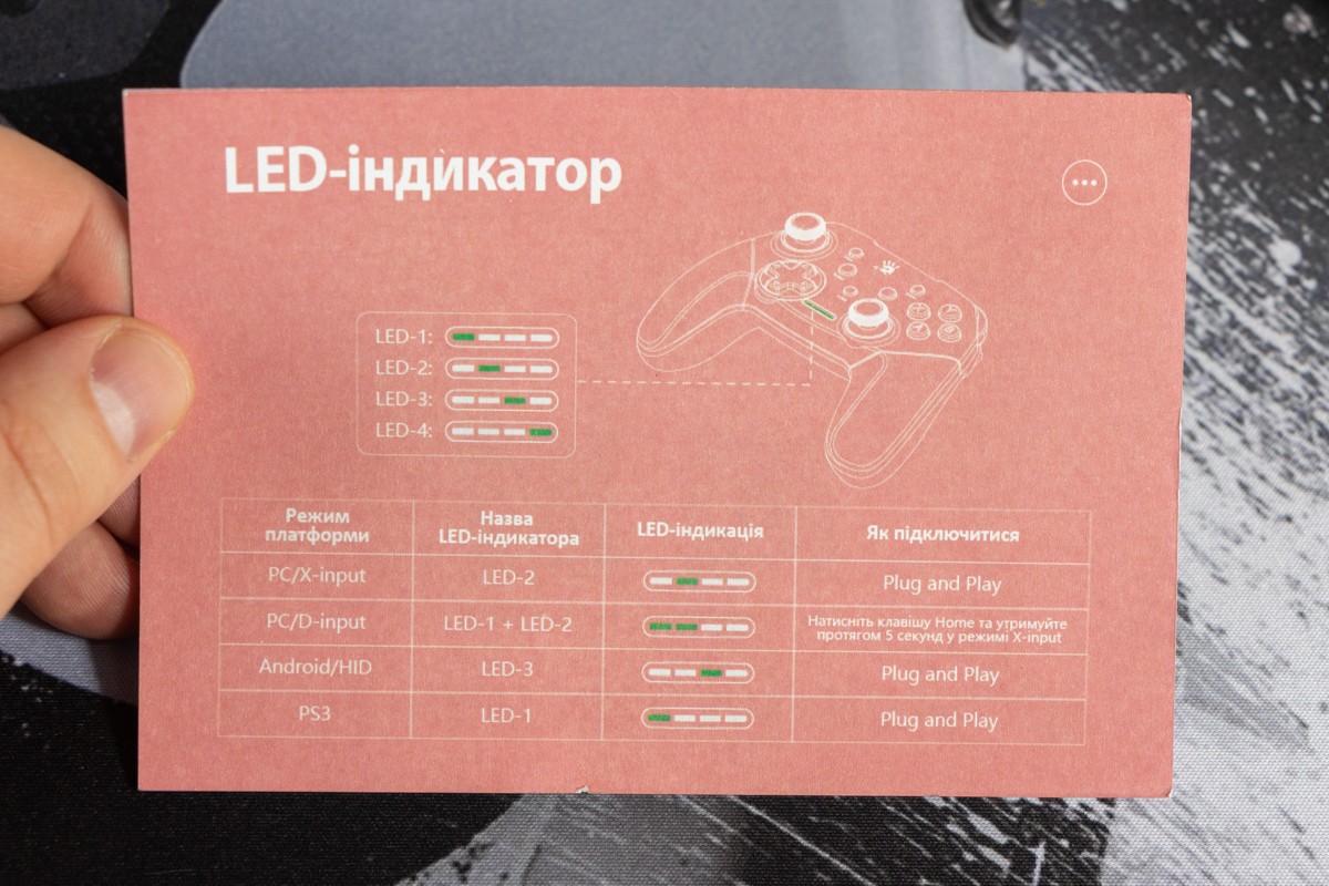 Огляд геймпада Bloody GPW50: яскравий корпус і підключення без дротівУ асортименті виробника ігрових аксесуарів Bloody є не лише клавіатури та мишки, а й спеціалізовані ігрові маніпулятори – геймпади. Найкрутішу модель GPW70, яка має більш пафосний дизайн з прогумованими вставками та RGB підсвіткою, вже оглядав. Цього разу поділюсь враженнями та покажу в дії модель GPW50 в біло-червоному кольорі корпусу Sports White. Подробиці нижче. Комплектація Геймпад потрапляє до власника у картонному боксі з віконцем, завдяки якому можна візуально оцінити пристрій без розпаковки. На зворотному боці упаковки розміщена детальна схема з описом всіх кнопок ігрового контролера Bloody GPW50. В коробці надійно запаковано геймпад, приймач бездротового сигналу, метровий USB A - USB C кабель для підзарядки і дротового підключення, інструкція. Дизайн і Корпус Почну з першого враження, яке сформував одразу як побачив геймпад і тактильно познайомився з матеріалами. У Bloody GPW50 дуже приємний по формі корпус, який виконаний із щільного матового пластику. Пристрій виглядає привабливо завдяки яскравій накладці червоного кольору, органічно вмальованому логотипу та яскравим написам на кнопках. Геймпад оснащений аналоговими стіками, розташованими асиметрично. Схема розміщення кнопок XYAB повторює Xbox. Додатковий комфорт у використанні забезпечують навігаційні клавіші Back, Home і Start. На передній частині геймпада розміщені два тригери та два курки. Між ними місце входу кабелю в корпус. Нижня частина корпусу не містить додаткових кнопок на відміну від моделі GPW70. З одного боку хотілось би більше функцій, а з іншого на геймпаді немає елементів що потребують звикання. А значить маємо стандартне управління та універсальне розміщення перемикачів та кнопок. Пара білих аналогових стіків покриті прогумованим матеріалом, що додає зчеплення з пальцями та надійніший контроль ігрового процесу. Всі інші кнопки гладкі, але над корпусом достатньо виступають і натискаються з зусиллям, що має знизити кількість випадкових натискань. Навіть якщо будете намагатись сильно зкручувати корпус скрипу не почуєте. Тож упевнений, що навіть в руках дуже агресивного геймера GPW50 зможе протриматись дуже довго. Корпус добре справляється з діагональними навантаженнями, не скрипить і створює відчуття цілісності конструкції. В моїх руках геймпад лежить комфортно, пальці дотягуються до усіх кнопок та перемикачів, з над зусиллям ні до чого не доводиться тягнутися. Долоні не втомлюються навіть при тривалому використанні, а завдяки матовому покриттю геймпад не вислизає з рук. Враження та Використання Підключав геймпад до комп’ютера на Windows та Android смартфона, вони без нюансів розпізнали пристрій. При підключенні до ПК загоряється другий індикатор, що сигналізує про активний режим X-input – найпоширеніший і актуальний стандарт. Водночас виробник передбачив можливість перемикання на старіший D-input, який стане в пригоді для ігор з 90-х та емуляторів. Для зміни режиму достатньо утримувати кнопку Home протягом трьох секунд, після чого загоряється перший світлодіод. Геймпад без проблем розпізнається у всіх іграх на ПК, і жодних додаткових налаштувань не потрібно. Спробував і автомобільний симулятор і звичайно ж файтинги. Для обох цих стилів, та й для інших, зручним виявився режим Turbo/Clear, що дозволяє швидко користуватись складними