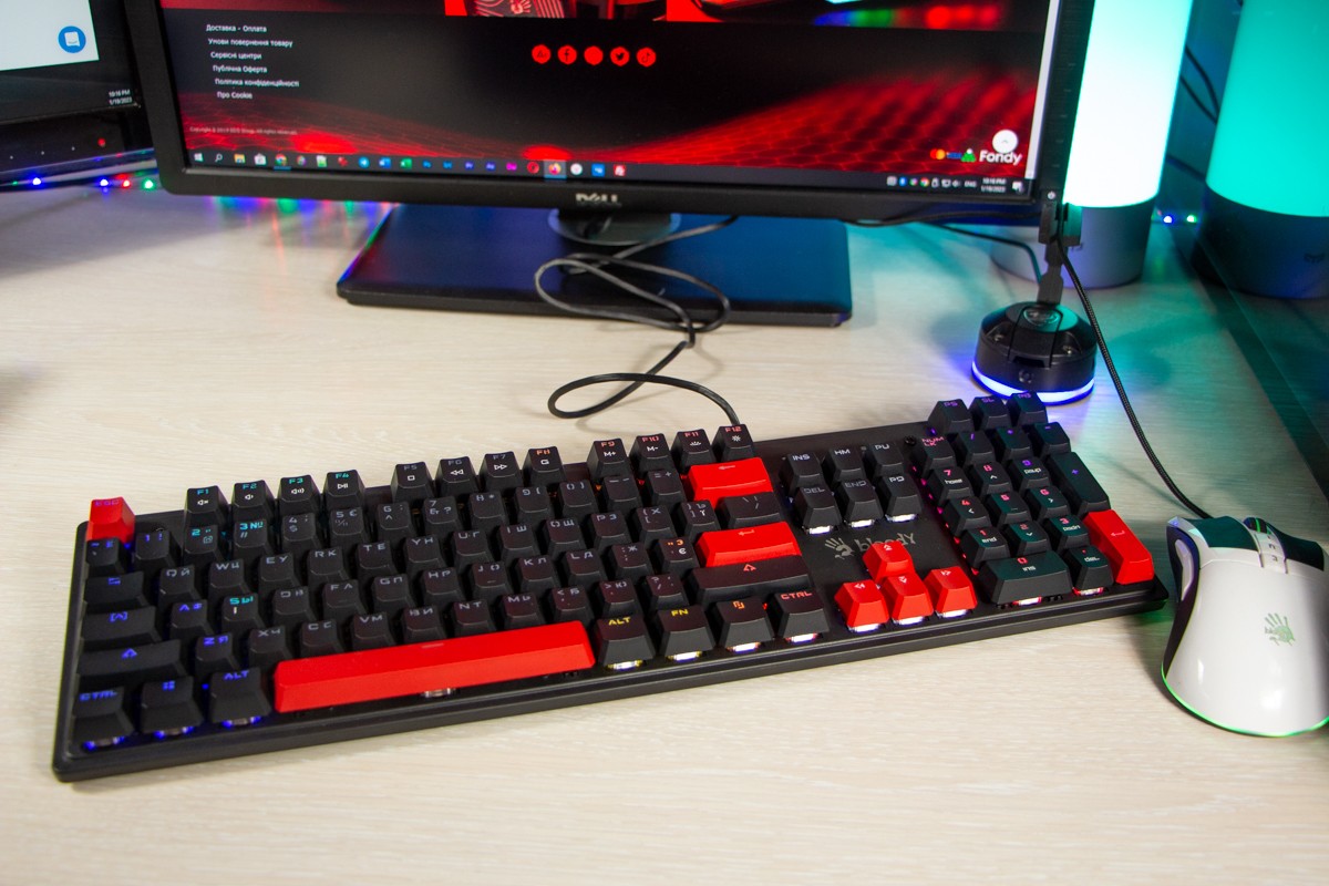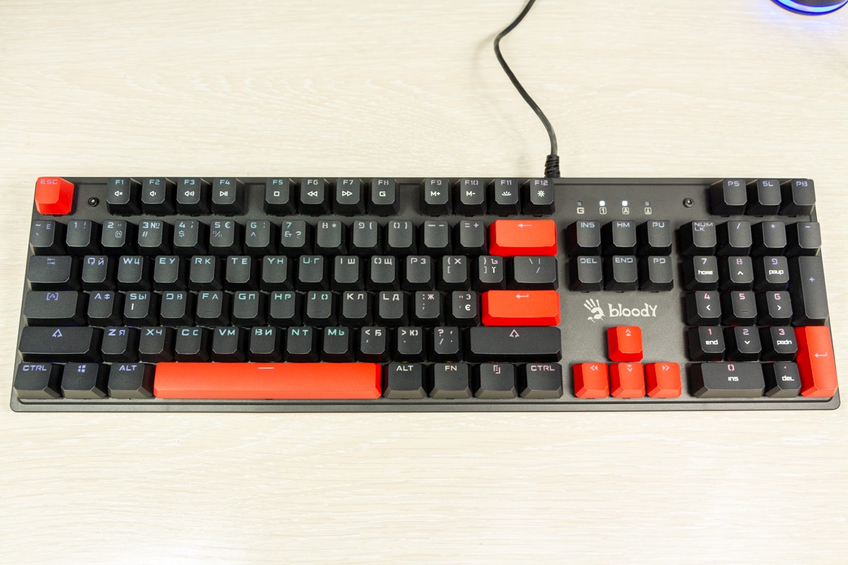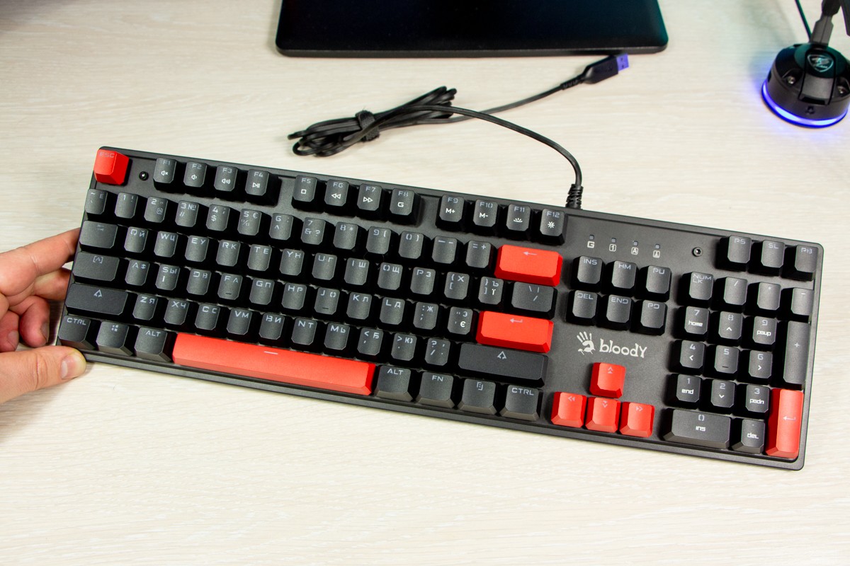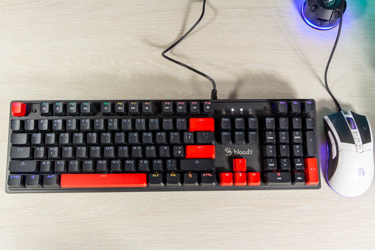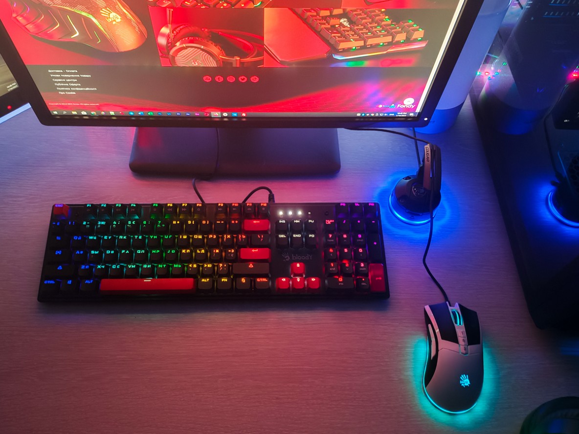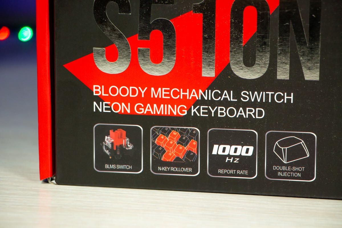 Огляд клавіатури Bloody S510N: механіка з неоновою підсвіткою, часом відгуку 1 мс і частотою опитування 1000 ГцBloody S510N - механічна ігрова клавіатура, що поповнила і так доволі широку лінійку ігрових аксесуарів бренду. Модель цікава тим, що має клавіші з відгуком в 1 мс, частоту опитування 1000 Гц і неонову підсвітку з 10 режимами роботи. Подробиці розповідаю в огляді. Комплектація Клавіатура Bloody S510N поставляється в класичній для бренду картонній коробці, де зображено пристрій і його характеристики, а також особливості перемикачів BLMS. Дизайн та Корпус Bloody S510 – повнорозмірна клавіатура, що має 104 стандартні клавіші. Частина з них мають яскраво-помаранчевий колір (майже червоний). Якщо для вас це занадто і бажаєте більш скромного дизайну, то виробник поклав у комплект аналогічні кейкапи чорного кольору. Клавіатура має похилу конструкцію клавіш з невеликими заглибленнями. Ця особливість знижує ймовірність випадкового натискання, що особливо корисно в іграх. Кнопки мають злегка округлену форму з кількома гранями в основі. Для пальців зручно, для дизайну клавіатури – додаткова відмінність від конкурентів. Варто зазначити, що при виготовленні кейкапів виробник використовував метод подвійного лиття задля забезпечення довговічності символів. Останні, окрім того, що розміщені в один ряд на обох мовах, так ще і виконані з дуже оригінального шрифту. Українська літера «і» присутня на звичному для неї місці. Тактильно клавіші приємні, набирати текст на клавіатурі довгий час – не проблема. Для мене навіть 3-4 години роботи без перерви були комфортними. Клавіші мають витримати до 50 млн. натискань. Це легко помітити навіть по пробілу, якому додали подвійні гвинти, подвійні пружини та компенсуючу планку. На нижній частині клавіатури чотири прогумовані ніжки, які запобігають ковзанню навіть по слизьким та похилим поверхням. Додаткова пара ніжок відкидається набік та піднімає віддалену частину корпусу для зручності роботи. Ніжки самовільно не закриваються навіть при суттєвому надавлюванні на корпус. Ще на кришці по периметру та в основі є дренажні отвори та канали на випадок, якщо на клавіатуру випадково проллють каву, чай, воду або щось солодке. Для підключення до комп’ютеру використовується кабель USB довжиною 1.8 метрів. Обплетення з тканини відсутнє, але прогумований захист є. Загалом враження від корпусу Bloody S510N, збірки та підбору матеріалів тільки позитивні. Посилює позитивне враження наявність змінних клавіш чорного кольору та підсвічування. Перемикачі На основі кейкапів – червоні механічні перемикачі BLMS (Bloody Mechanical Switch). Їх налаштували під високу швидкість натискання: довжина ходу становить 4 мм, а точка спрацьовування 2 мм. Швидкість відгуку складає всього 1 мс, а це майже миттєво. В іграх клавіатура поводить себе «зразково». Реалізоване 100% N-клавішне натискання, а значить клавіатурою реєструється кожне натискання на клавішу, незалежно від того, скільки кнопок утримується або одночасно натиснуто. Підсвітка Можливості по підсвічуванню Bloody S510N краще одразу переглянути на фото нижче. Підсвічування неонове - переходить від синього до фіолетового. Через функціональну клавішу його можна змінювати наступним чином: