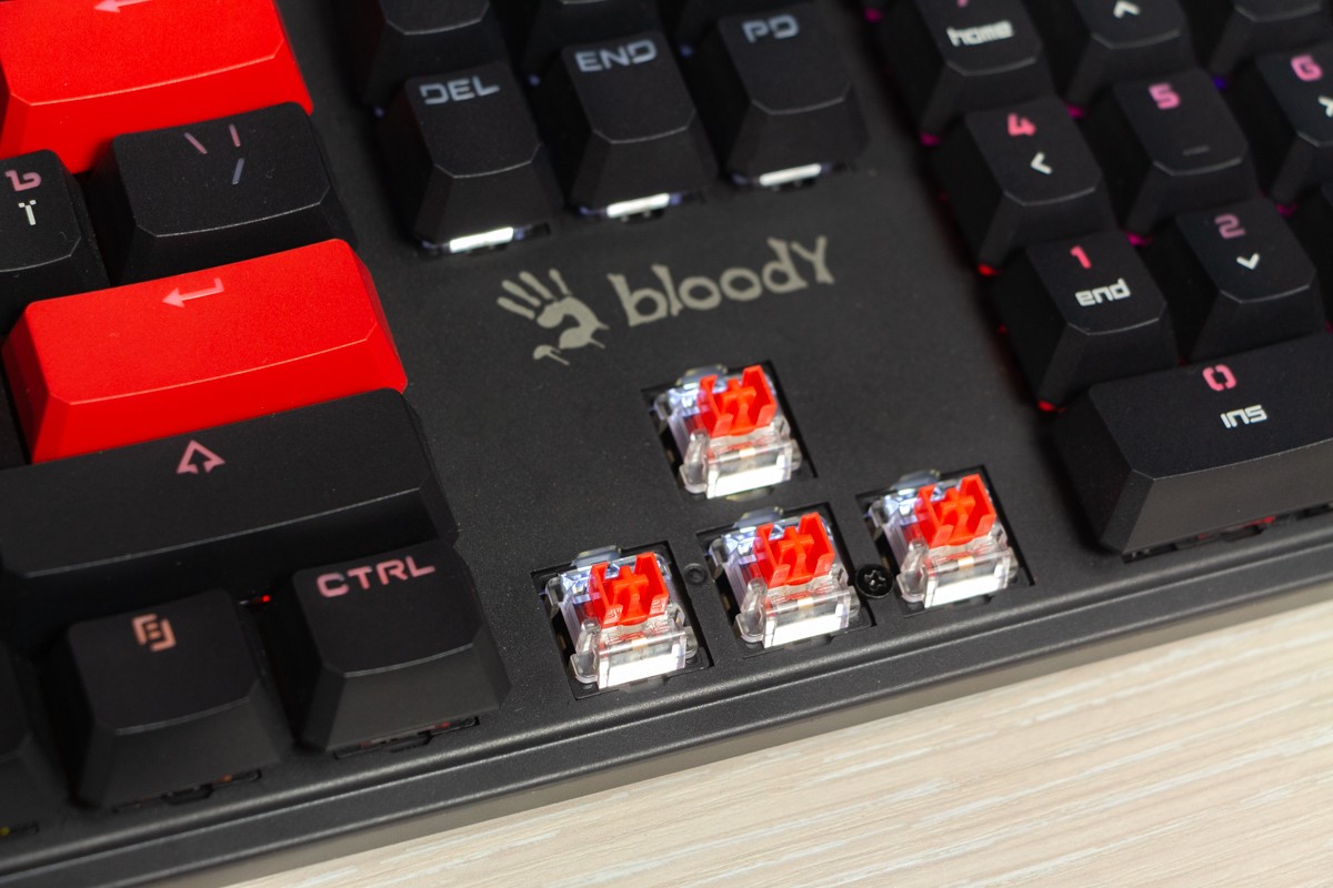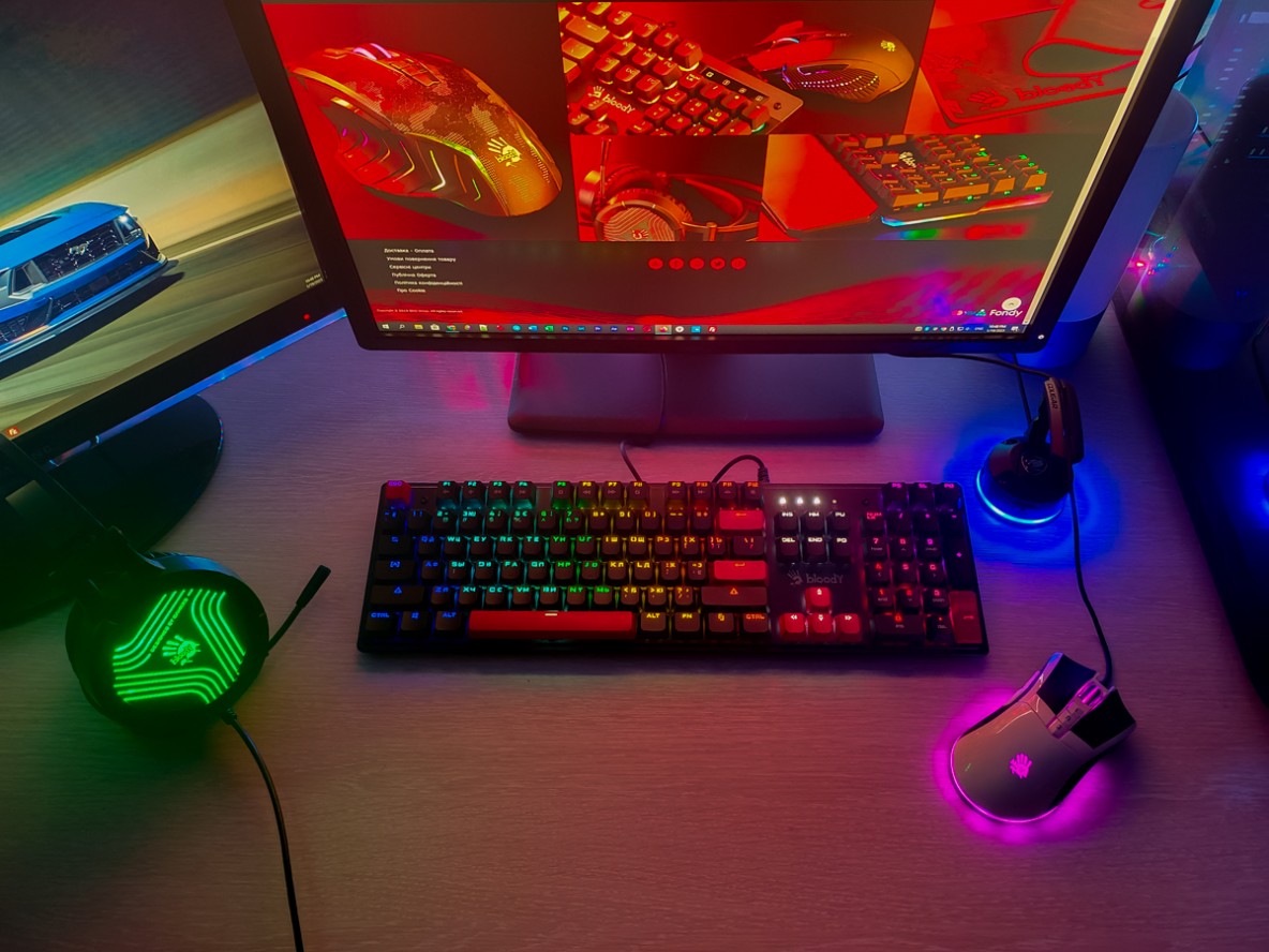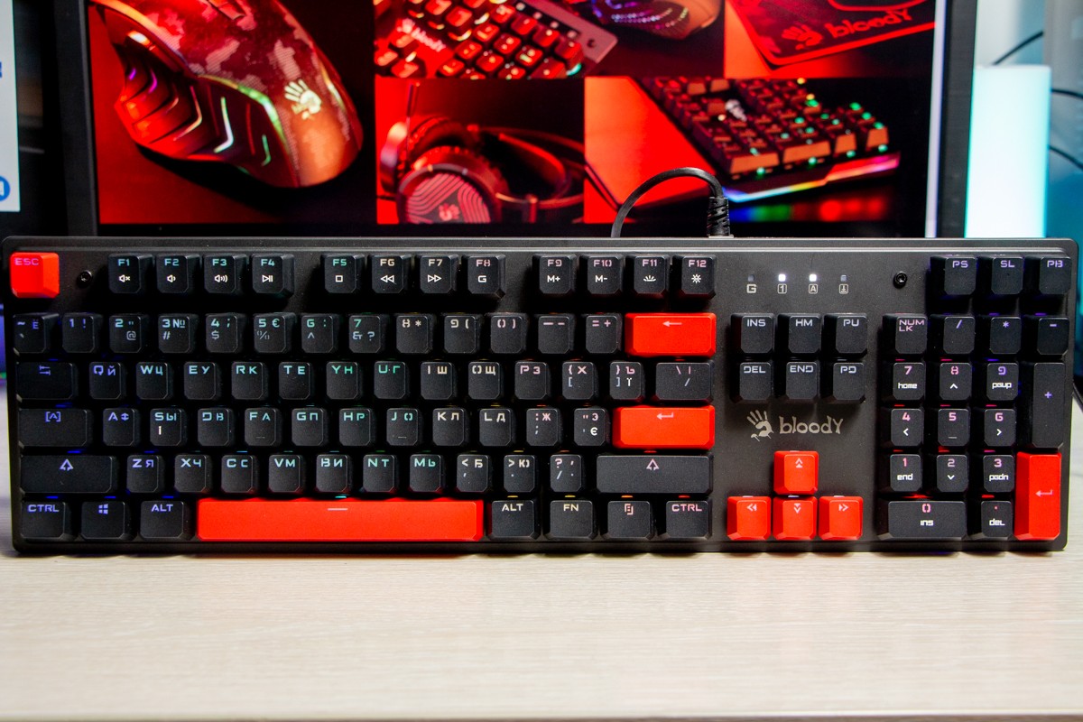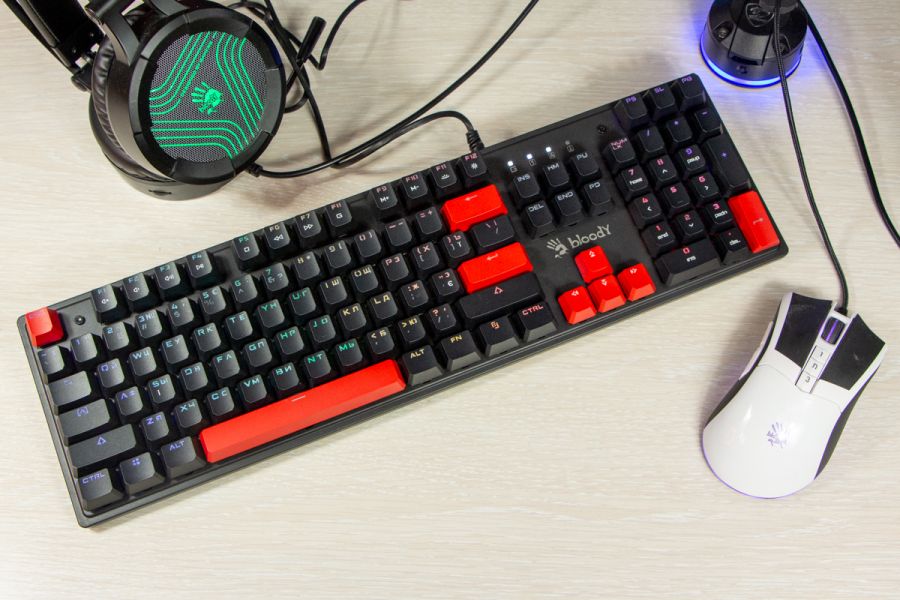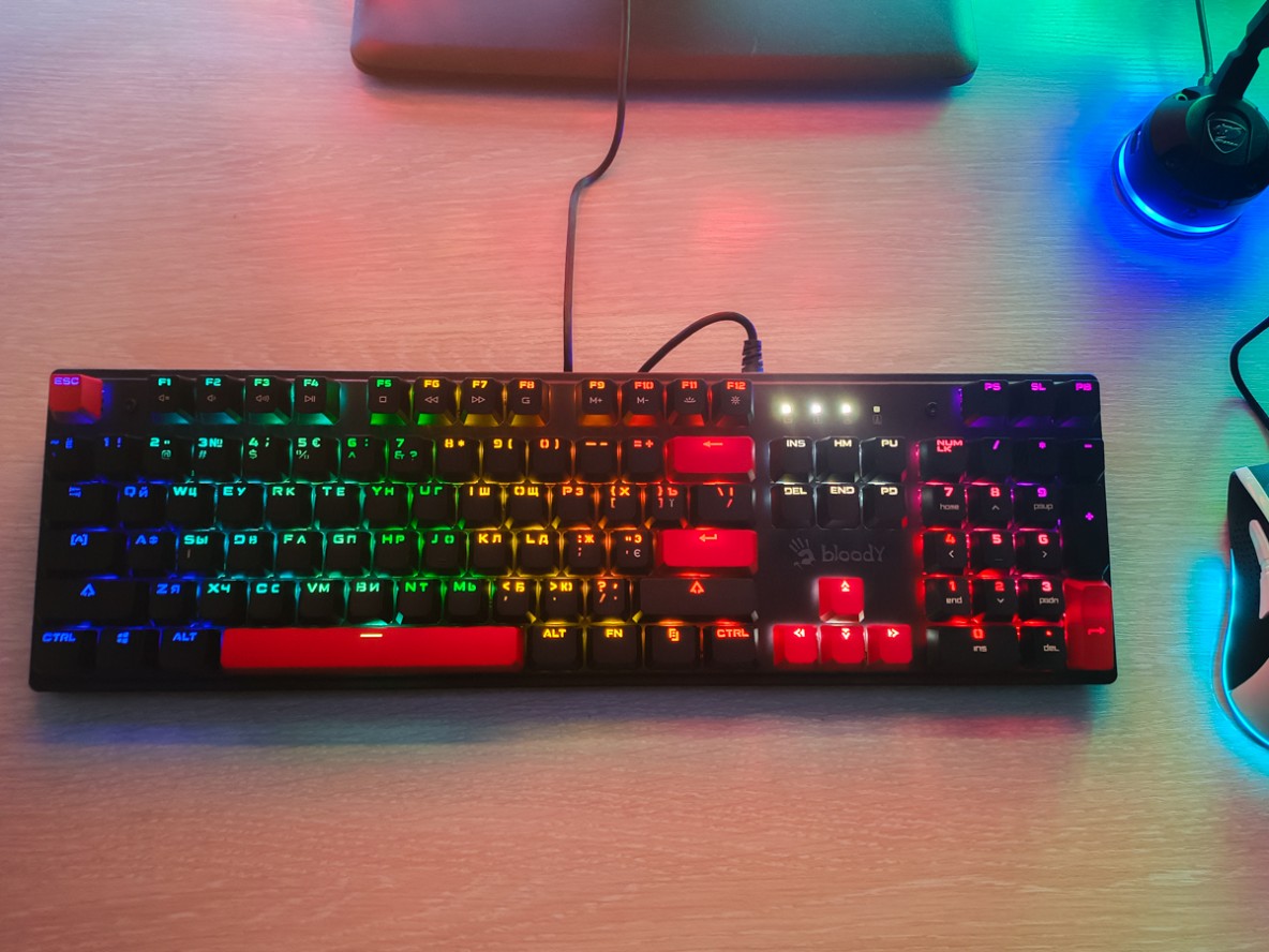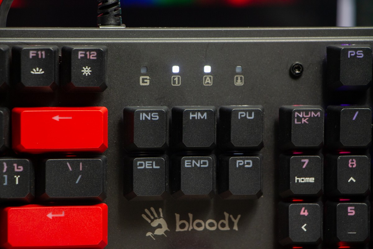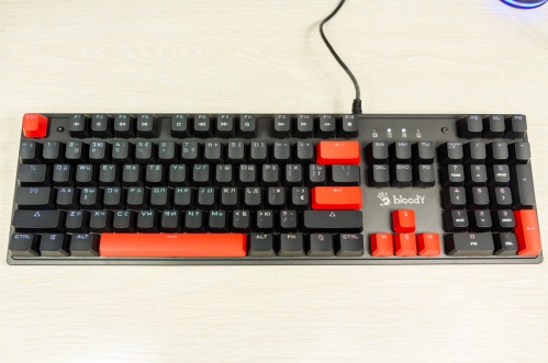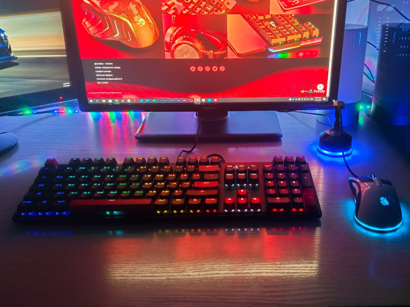Огляд клавіатури Bloody S510N: механіка з неоновою підсвіткою, часом відгуку 1 мс і частотою опитування 1000 ГцBloody S510N - механічна ігрова клавіатура, що поповнила і так доволі широку лінійку ігрових аксесуарів бренду. Модель цікава тим, що має клавіші з відгуком в 1 мс, частоту опитування 1000 Гц і неонову підсвітку з 10 режимами роботи. Подробиці розповідаю в огляді. Комплектація Клавіатура Bloody S510N поставляється в класичній для бренду картонній коробці, де зображено пристрій і його характеристики, а також особливості перемикачів BLMS. Дизайн та Корпус Bloody S510 – повнорозмірна клавіатура, що має 104 стандартні клавіші. Частина з них мають яскраво-помаранчевий колір (майже червоний). Якщо для вас це занадто і бажаєте більш скромного дизайну, то виробник поклав у комплект аналогічні кейкапи чорного кольору. Клавіатура має похилу конструкцію клавіш з невеликими заглибленнями. Ця особливість знижує ймовірність випадкового натискання, що особливо корисно в іграх. Кнопки мають злегка округлену форму з кількома гранями в основі. Для пальців зручно, для дизайну клавіатури – додаткова відмінність від конкурентів. Варто зазначити, що при виготовленні кейкапів виробник використовував метод подвійного лиття задля забезпечення довговічності символів. Останні, окрім того, що розміщені в один ряд на обох мовах, так ще і виконані з дуже оригінального шрифту. Українська літера «і» присутня на звичному для неї місці. Тактильно клавіші приємні, набирати текст на клавіатурі довгий час – не проблема. Для мене навіть 3-4 години роботи без перерви були комфортними. Клавіші мають витримати до 50 млн. натискань. Це легко помітити навіть по пробілу, якому додали подвійні гвинти, подвійні пружини та компенсуючу планку. На нижній частині клавіатури чотири прогумовані ніжки, які запобігають ковзанню навіть по слизьким та похилим поверхням. Додаткова пара ніжок відкидається набік та піднімає віддалену частину корпусу для зручності роботи. Ніжки самовільно не закриваються навіть при суттєвому надавлюванні на корпус. Ще на кришці по периметру та в основі є дренажні отвори та канали на випадок, якщо на клавіатуру випадково проллють каву, чай, воду або щось солодке. Для підключення до комп’ютеру використовується кабель USB довжиною 1.8 метрів. Обплетення з тканини відсутнє, але прогумований захист є. Загалом враження від корпусу Bloody S510N, збірки та підбору матеріалів тільки позитивні. Посилює позитивне враження наявність змінних клавіш чорного кольору та підсвічування. Перемикачі На основі кейкапів – червоні механічні перемикачі BLMS (Bloody Mechanical Switch). Їх налаштували під високу швидкість натискання: довжина ходу становить 4 мм, а точка спрацьовування 2 мм. Швидкість відгуку складає всього 1 мс, а це майже миттєво. В іграх клавіатура поводить себе «зразково». Реалізоване 100% N-клавішне натискання, а значить клавіатурою реєструється кожне натискання на клавішу, незалежно від того, скільки кнопок утримується або одночасно натиснуто. Підсвітка Можливості по підсвічуванню Bloody S510N краще одразу переглянути на фото нижче. Підсвічування неонове - переходить від синього до фіолетового. Через функціональну клавішу його можна змінювати наступним чином: