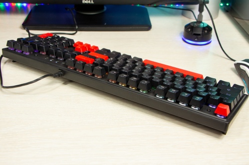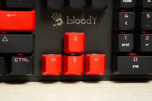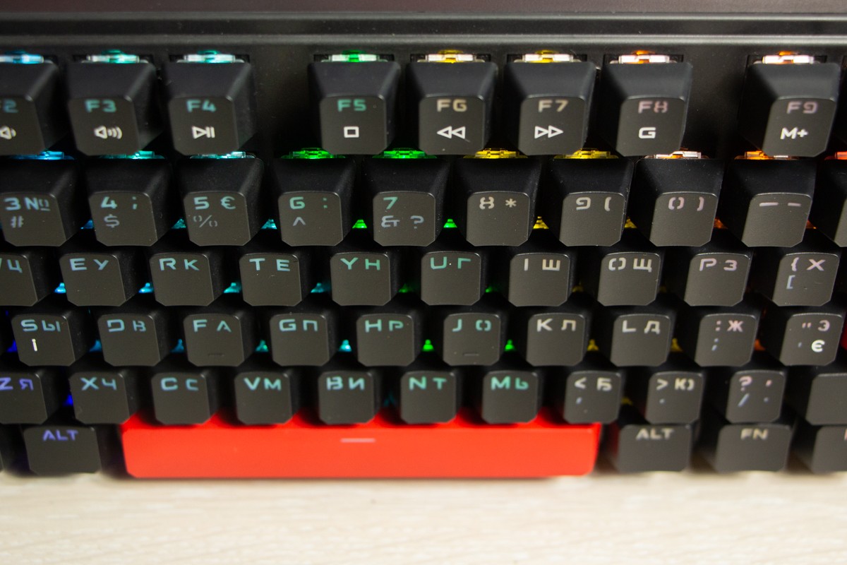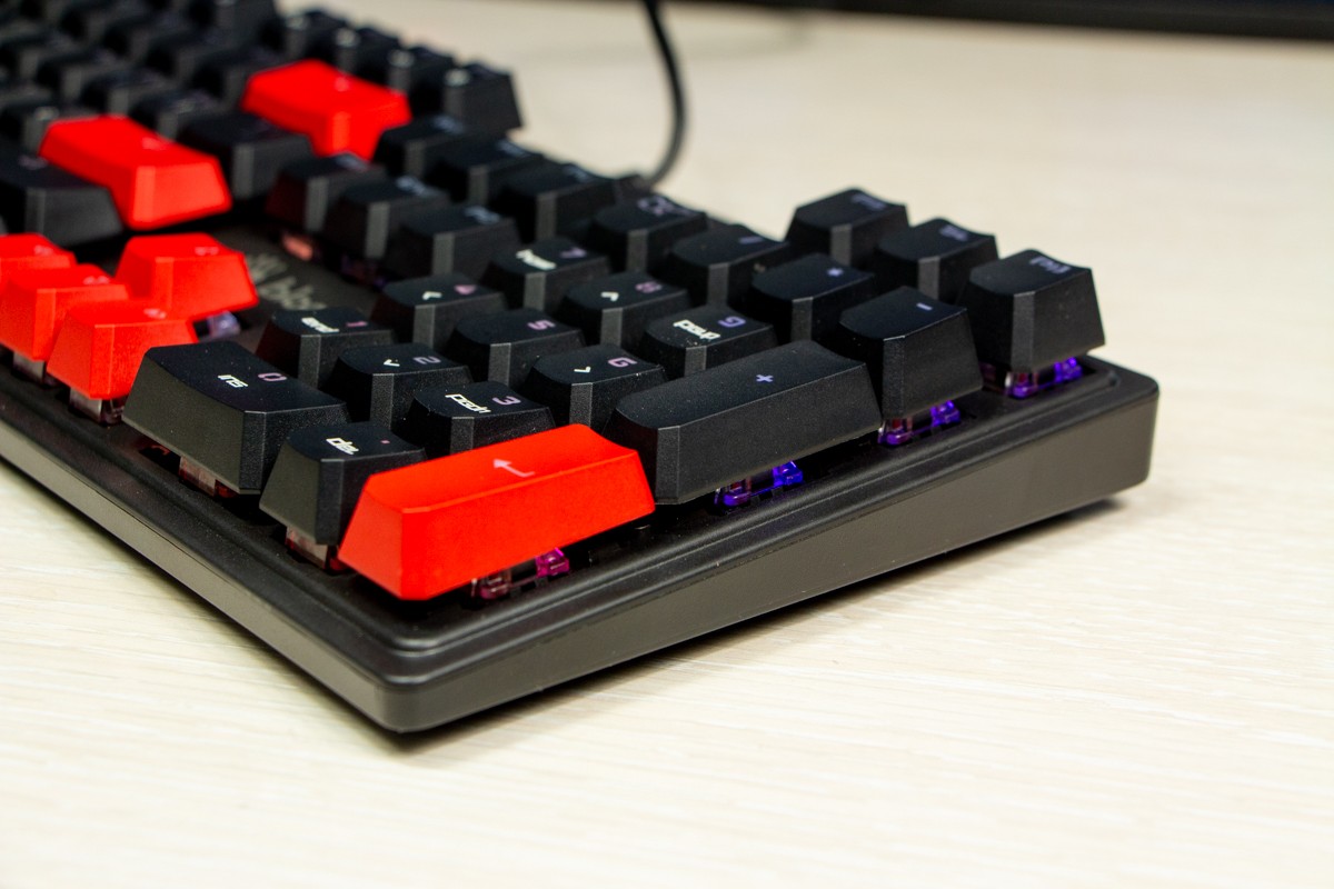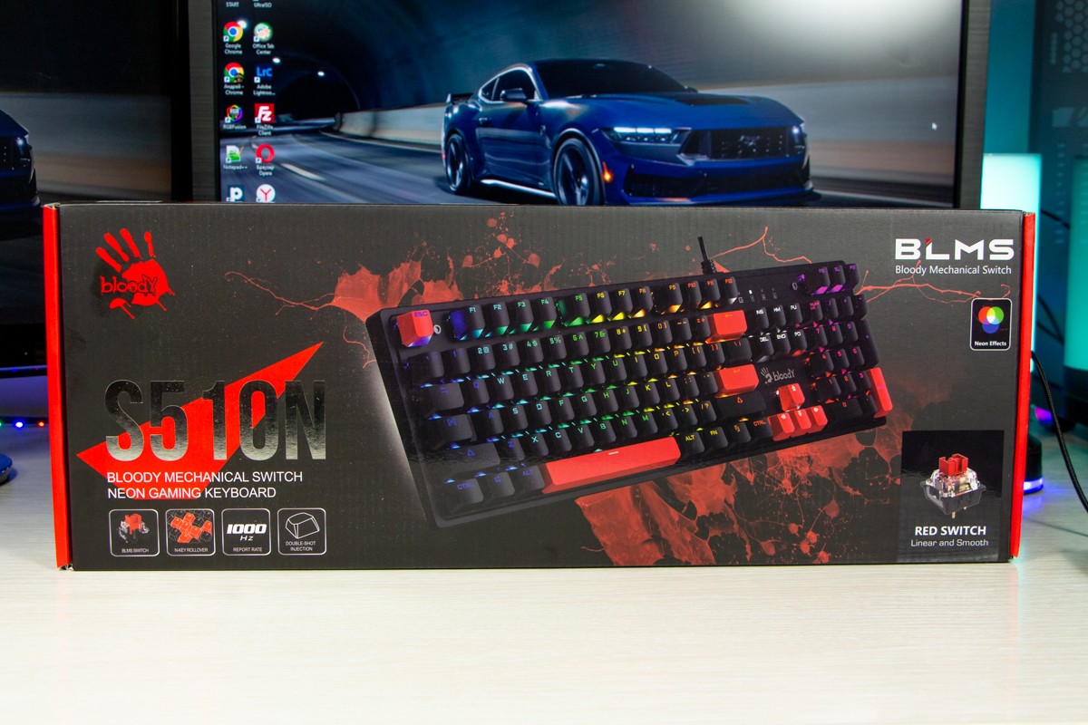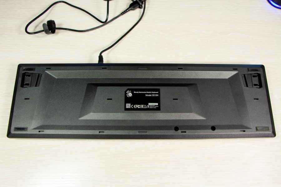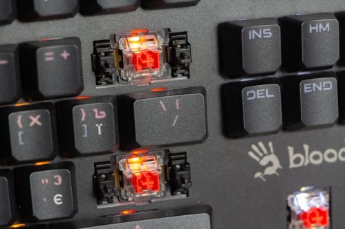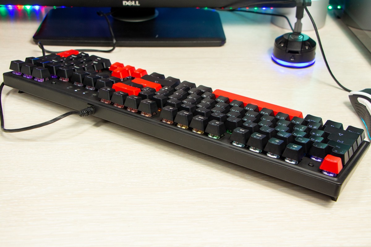 Огляд клавіатури Bloody S510N: механіка з неоновою підсвіткою, часом відгуку 1 мс і частотою опитування 1000 ГцBloody S510N - механічна ігрова клавіатура, що поповнила і так доволі широку лінійку ігрових аксесуарів бренду. Модель цікава тим, що має клавіші з відгуком в 1 мс, частоту опитування 1000 Гц і неонову підсвітку з 10 режимами роботи. Подробиці розповідаю в огляді. Комплектація Клавіатура Bloody S510N поставляється в класичній для бренду картонній коробці, де зображено пристрій і його характеристики, а також особливості перемикачів BLMS. Дизайн та Корпус Bloody S510 – повнорозмірна клавіатура, що має 104 стандартні клавіші. Частина з них мають яскраво-помаранчевий колір (майже червоний). Якщо для вас це занадто і бажаєте більш скромного дизайну, то виробник поклав у комплект аналогічні кейкапи чорного кольору. Клавіатура має похилу конструкцію клавіш з невеликими заглибленнями. Ця особливість знижує ймовірність випадкового натискання, що особливо корисно в іграх. Кнопки мають злегка округлену форму з кількома гранями в основі. Для пальців зручно, для дизайну клавіатури – додаткова відмінність від конкурентів. Варто зазначити, що при виготовленні кейкапів виробник використовував метод подвійного лиття задля забезпечення довговічності символів. Останні, окрім того, що розміщені в один ряд на обох мовах, так ще і виконані з дуже оригінального шрифту. Українська літера «і» присутня на звичному для неї місці. Тактильно клавіші приємні, набирати текст на клавіатурі довгий час – не проблема. Для мене навіть 3-4 години роботи без перерви були комфортними. Клавіші мають витримати до 50 млн. натискань. Це легко помітити навіть по пробілу, якому додали подвійні гвинти, подвійні пружини та компенсуючу планку. На нижній частині клавіатури чотири прогумовані ніжки, які запобігають ковзанню навіть по слизьким та похилим поверхням. Додаткова пара ніжок відкидається набік та піднімає віддалену частину корпусу для зручності роботи. Ніжки самовільно не закриваються навіть при суттєвому надавлюванні на корпус. Ще на кришці по периметру та в основі є дренажні отвори та канали на випадок, якщо на клавіатуру випадково проллють каву, чай, воду або щось солодке. Для підключення до комп’ютеру використовується кабель USB довжиною 1.8 метрів. Обплетення з тканини відсутнє, але прогумований захист є. Загалом враження від корпусу Bloody S510N, збірки та підбору матеріалів тільки позитивні. Посилює позитивне враження наявність змінних клавіш чорного кольору та підсвічування. Перемикачі На основі кейкапів – червоні механічні перемикачі BLMS (Bloody Mechanical Switch). Їх налаштували під високу швидкість натискання: довжина ходу становить 4 мм, а точка спрацьовування 2 мм. Швидкість відгуку складає всього 1 мс, а це майже миттєво. В іграх клавіатура поводить себе «зразково». Реалізоване 100% N-клавішне натискання, а значить клавіатурою реєструється кожне натискання на клавішу, незалежно від того, скільки кнопок утримується або одночасно натиснуто. Підсвітка Можливості по підсвічуванню Bloody S510N краще одразу переглянути на фото нижче. Підсвічування неонове - переходить від синього до фіолетового. Через функціональну клавішу його можна змінювати наступним чином: