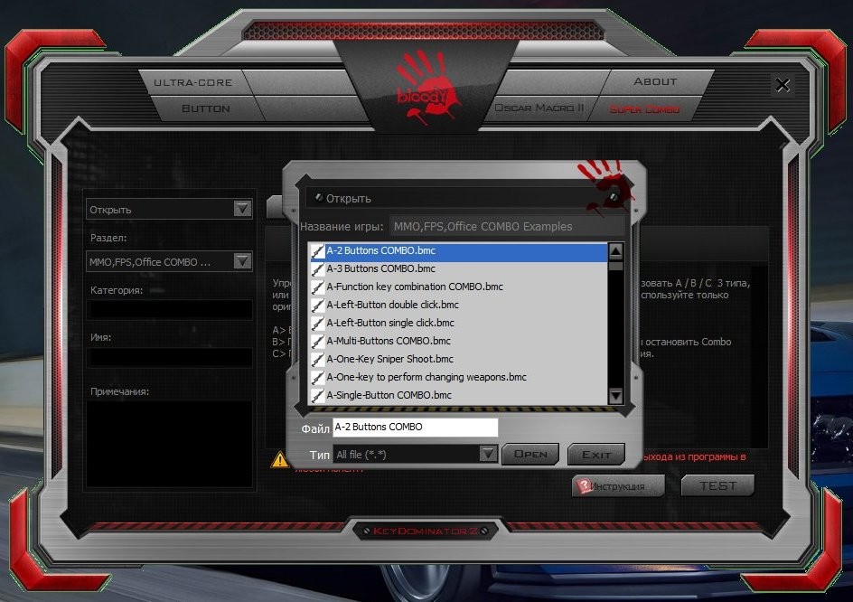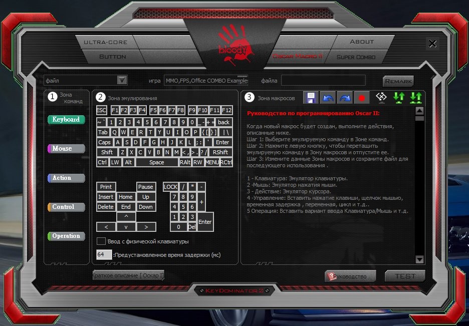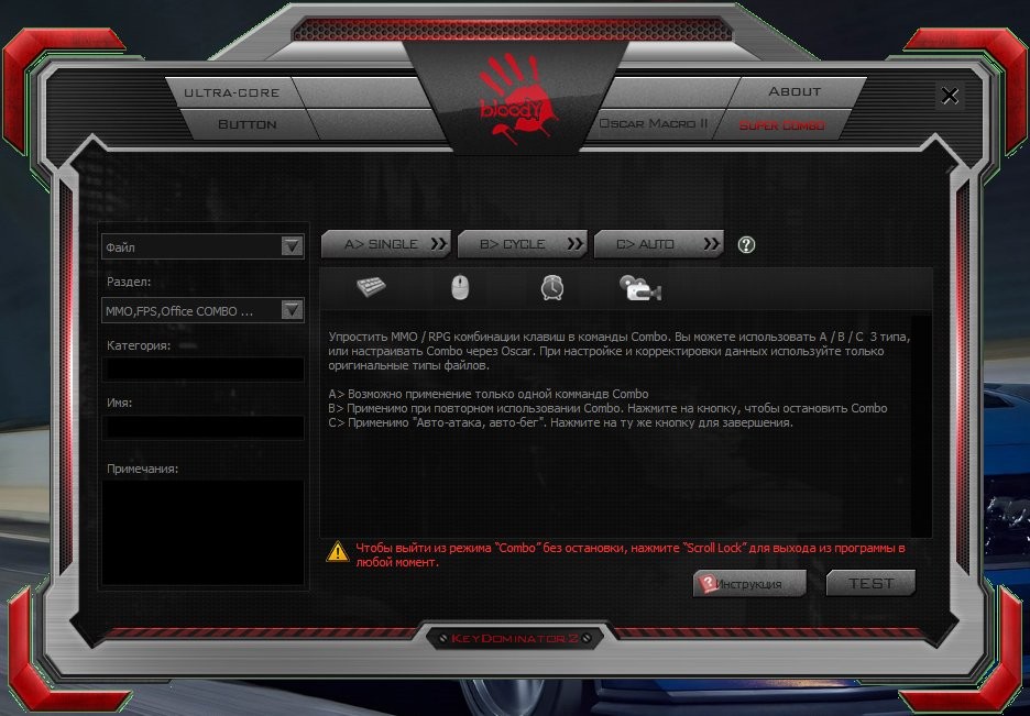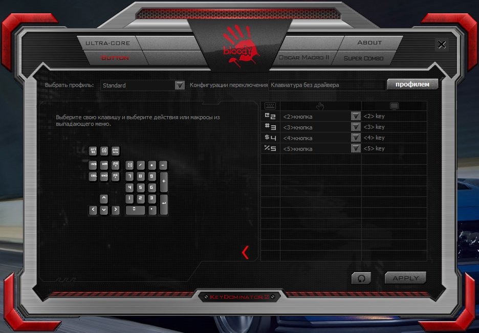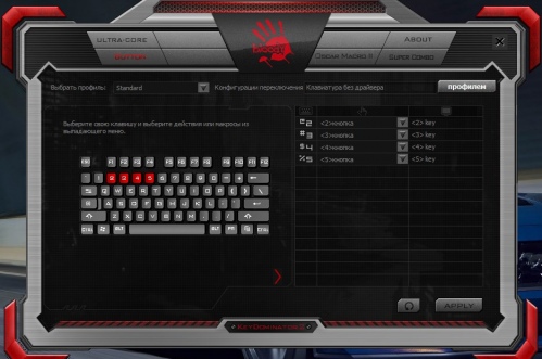 ПО Key Dominator 2 – програма для детального налаштування Bloody S510N. Після встановлення софт моментально розпізнає пристрій. Для роботи доступні три розділи програми: