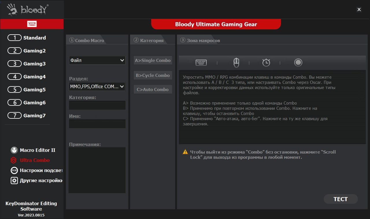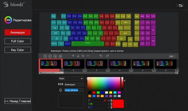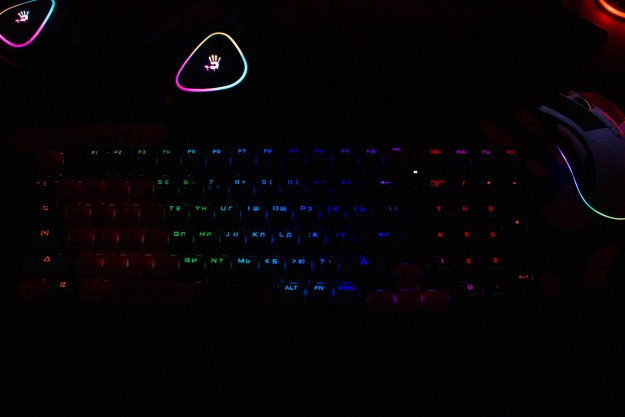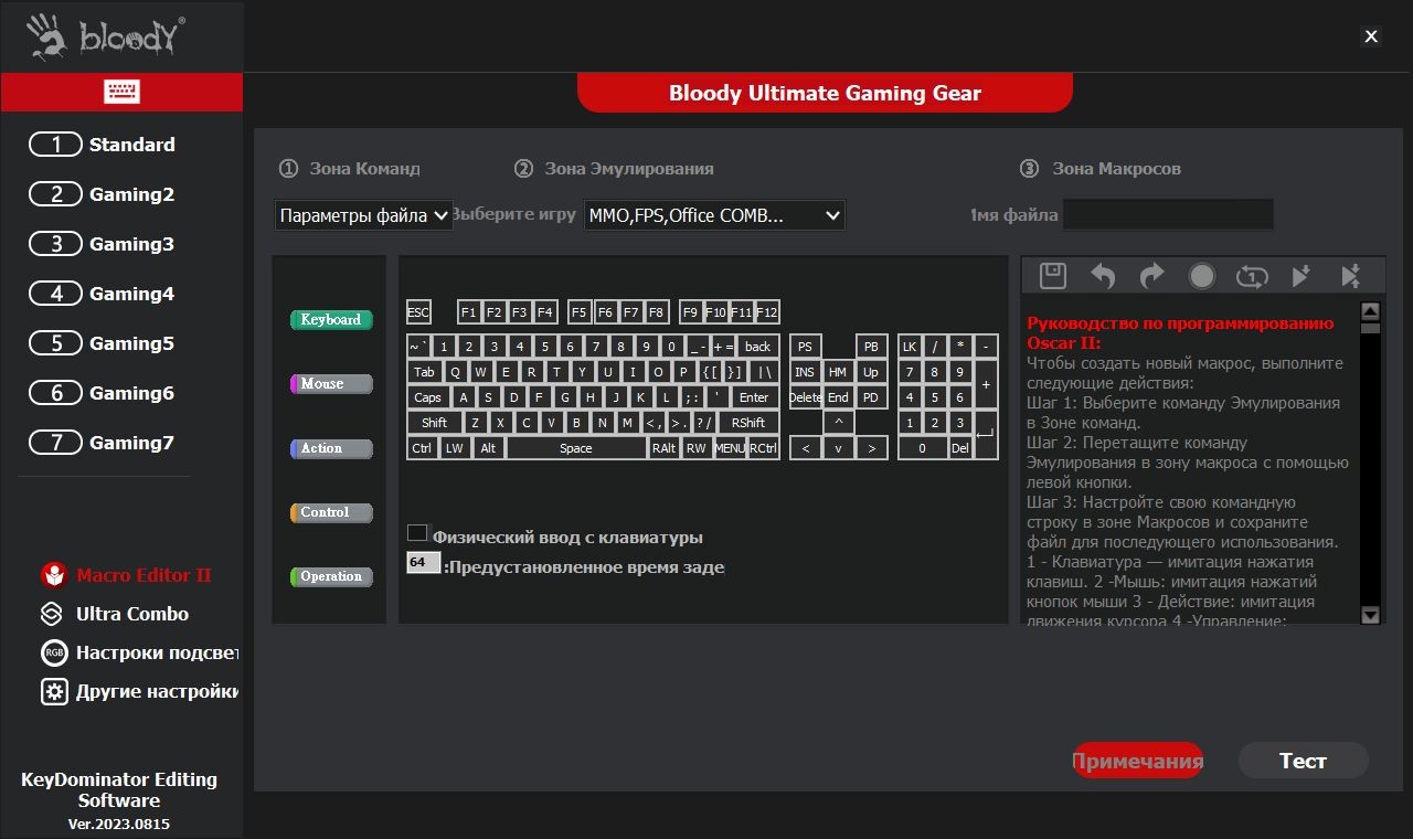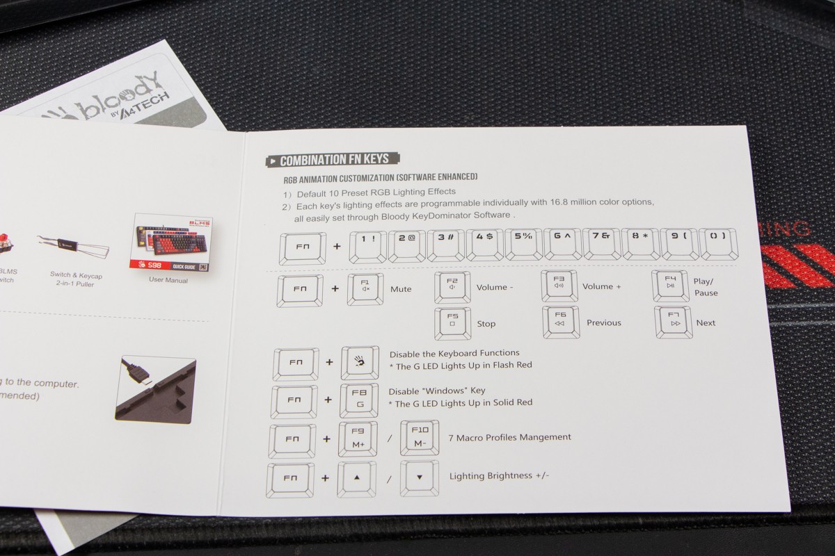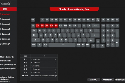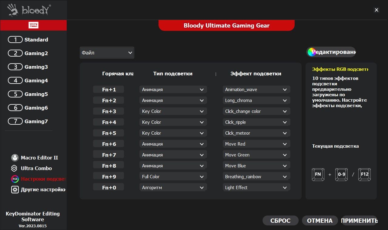 Можливості Позиціювання клавіатури Bloody S98 без «фізичних» особливостей її перемикачів Bloody BLMS Red повністю не розкрити. В нашому випадку червоний колір реалізує потрібну геймеру швидку реакцію на натискання та однакову силу, необхідну для натискання клавіші, на всьому її шляху до кліку. Останній тут приглушений, як я вже згадував, завдяки силіконовим накладкам. По ресурсу натискань зазначена цифра у 50 млн., тож не впевнений, що зможете вичерпати його навіть за 3-5 років. Хіба що закуповуєте Bloody S98 для комп’ютерного клубу, який працюватиме 24/7. Для довідки, підтримка функції Anti-Ghosting гарантує, що при одночасному натисканні буде розпізнано всі потрібні клавіші. Навіть якщо натиснути їх всі. Підсвітка регулюється по яскравості і перемикається в режимах безпосередньо з клавіатури. 10 режимів запрограмовані по замовчуванню, знайти їх можна на комбінації «FN + 0-9». Більше можливостей і форматів підсвітки реалізується через фірмове ПО. Яскравість підсвітки налаштовується комбінацією «FN + стрілка вверх/стрілка вниз». Нижче на скріншотах бачите деталі.
