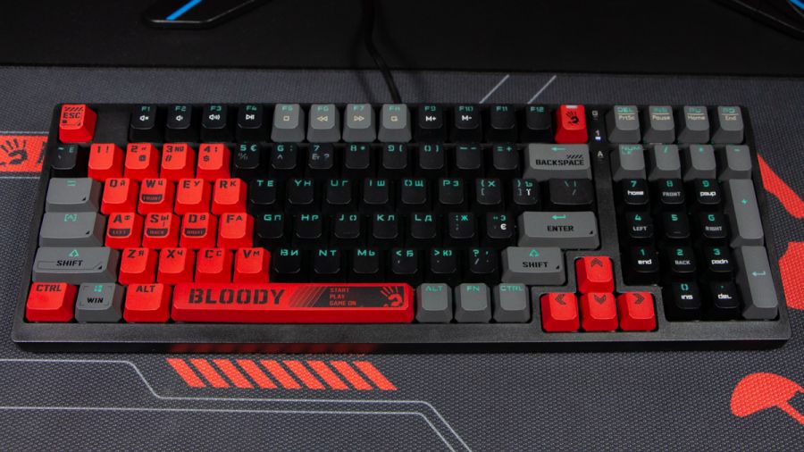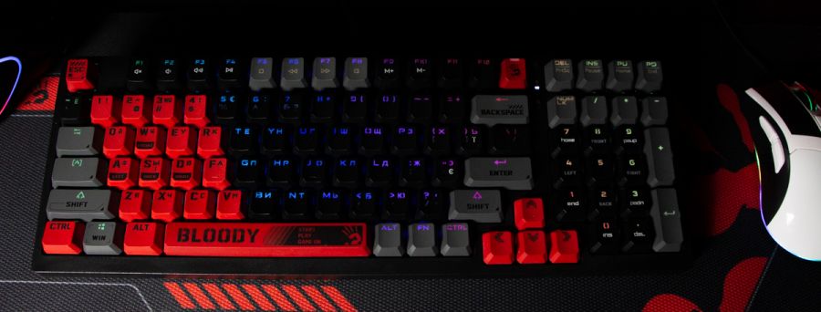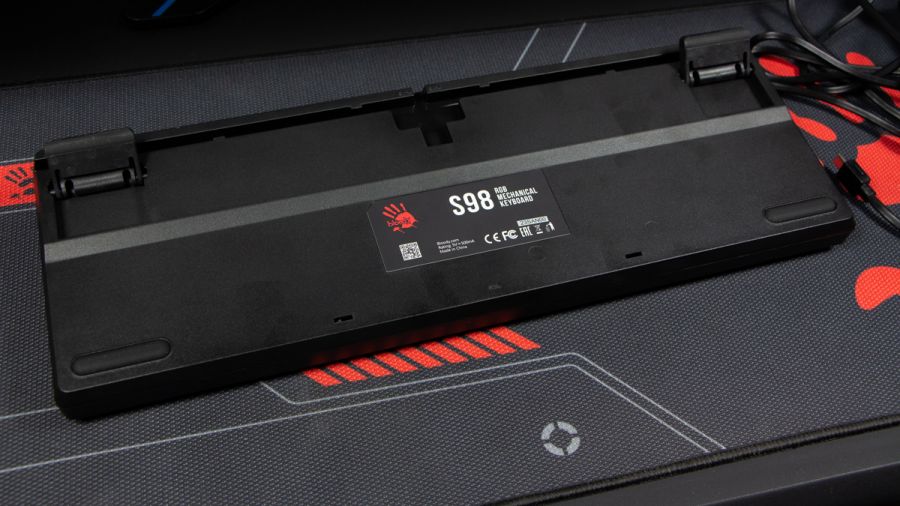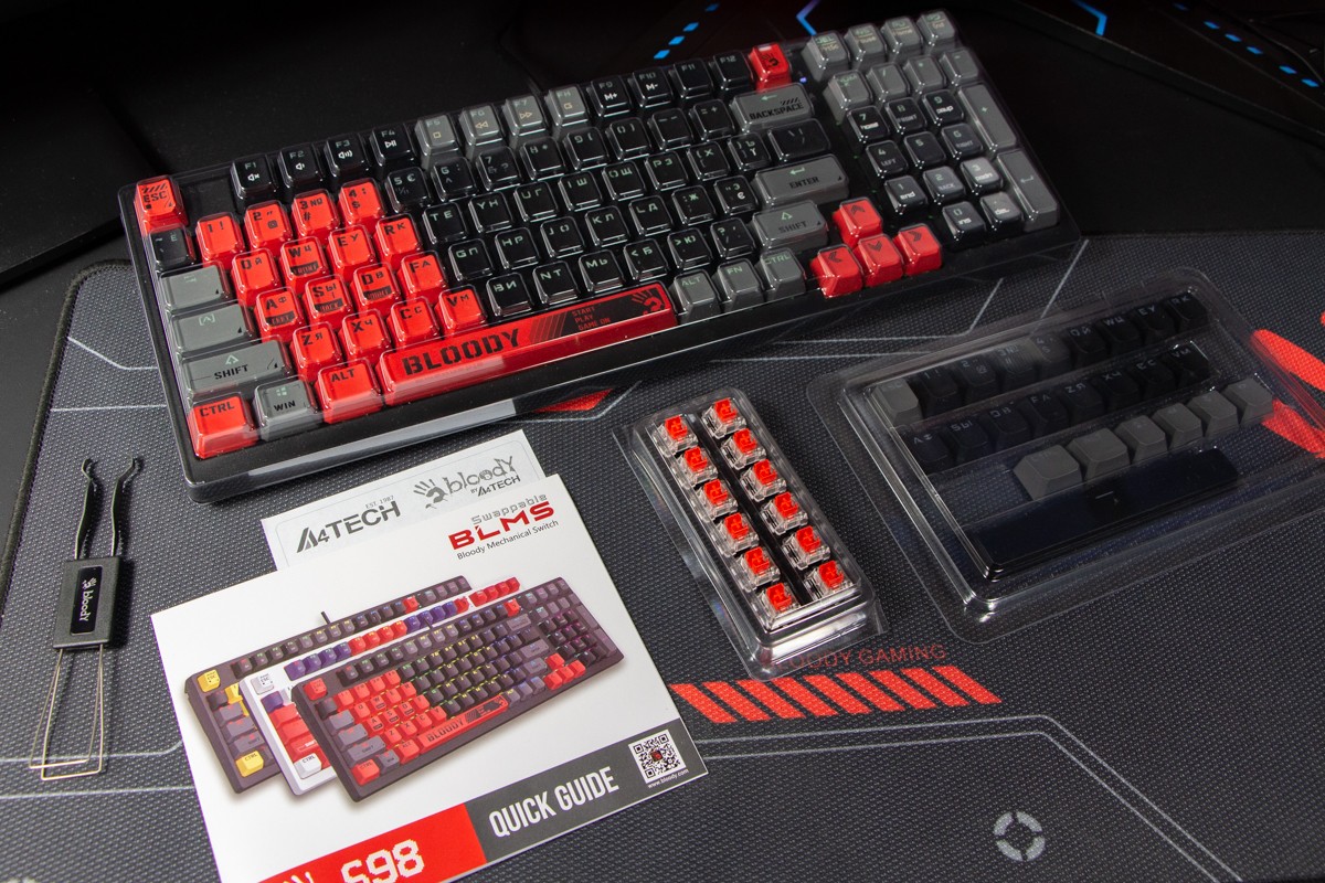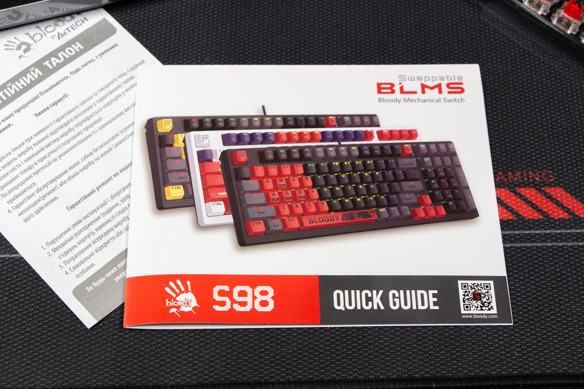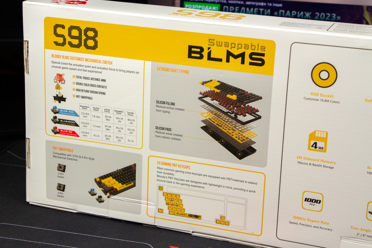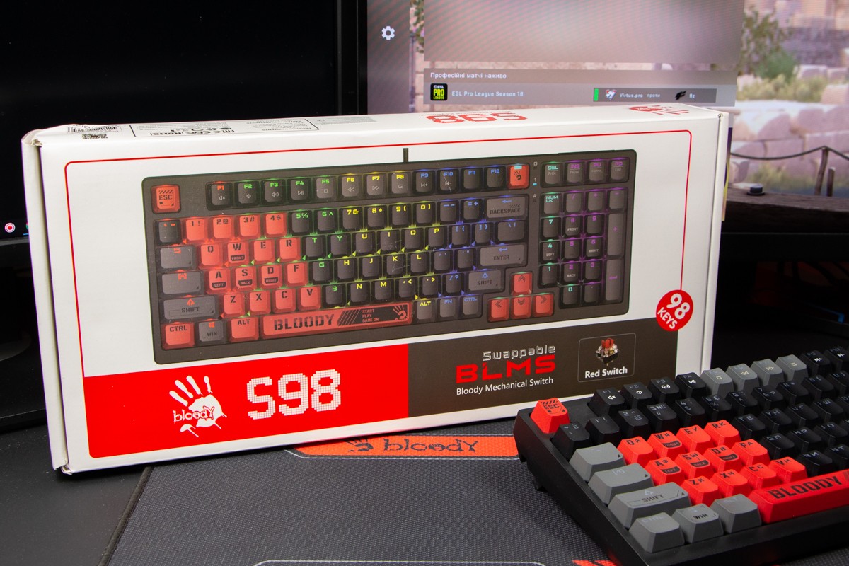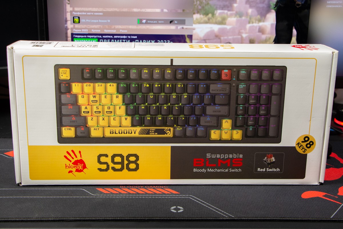 Огляд клавіатури Bloody S98: реально ігрова, яскрава, компактна і надійнаМеханічна ігрова клавіатура Bloody S98 з перемикачами BLMS Red ні в чому не обмежує свого власника, хоч виробник і поставив собі за мету зробити її компактною без втрати окремого цифрового блоку. Налаштування підсвітки, 98 клавіш, регульовані ніжки і зручний кабель менеджмент, пам’ять для зберігання ігрових режимів – це більшість, але не всі особливості клавіатури. Враження від експлуатації, особливості перемикачів і деталі по варіантах підсвічування розповім далі у огляді. Комплектація Вже звик, що всі клавіатури Bloody пропонуються у червоно-чорних кольорах? Так от Bloody S98 навіть коробкою відрізняється від інших моделей виробника, бо має переважаючий білий колір. Технічні характеристики та фото пристрою на пакуванні присутні. Всередині коробки знаходимо клавіатуру з прозорою кришкою, зрозумілий і інформативний посібник користувача, 12 додаткових червоних BLMS перемикачів, клавіші чорного та сірого кольору на заміну червоним, інструмент для зняття кейкапів та перемикачів, і кабель USB C – USB A для підключення до ПК або ноутбуку. Відмічу якісне прогумоване покриття кабелю, довжина якого 1,8 м, а також можливість його виводу з-під корпусу клавіатури на три сторони. Дизайн і Корпус Bloody S98 – компактна клавіатура з габаритами 385х138х41 мм. Нижче можете бачити її фото поруч з клавіатурою Bloody B810RC, яку можна вважати «класичним» форматом. Зменшення габаритів моделі Bloody S98 відбулось шляхом розташування клавіш у дві секції. Основний лівий блок максимально наблизили до клавіш-цифр, причому місця між ними вистачило лише для індикаторів. На стику секцій розмістили стрілки, а більшість того, що прибрали над ними, розмістили над цифровим блоком. Навіть для PrtScr там знайшлось місце. Щоправда, пару звичних клавіш натискаються в парі з кнопкою FN. Форма корпусу клавіатури – прямокутник, що максимально компактно. Трішки заокруглені лише краї в місцях зустрічі торців. Відстань від клавіш до краю корпусу мінімальна. Основний колір корпусу – чорний, червоного додають лише 25 кейкапів у моделі S98 Sports Red. У моделі S98 Sports Lime ці клавіші жовті. Особисто я обрав би червоний, але і жовтий виглядає яскраво, якщо вдало підібрали килимок. Завдяки грі кольорів клавіатура може виглядати яскраво, але власник може при бажанні все «затемнити» змінними кейкапами з комплектації. 24 зі згаданих червоних кейкапів зроблені з PBT (полібутилентерефталату). Це більш довговічний пластик, який потрібен «агресивним» ігроманам. Ці кейпаки виготовлені методом подвійного лиття, завдяки чому написи на кнопках стерти майже неможливо. Звертаю увагу на форму клавіш. Зверху вони скошені зліва і праворуч аби поліпшити тактильний контакт. На червоних та жовтих клавішах принт більший, а пробіл прикрасили логотипом і слоганом бренду Bloody. Натискаючи на клавішу не почуєте дзвінкий клік, бо конструктивно передбачені силіконові накладки. А це значить, що граючи або набираючи тексти будете по мінімуму заважати оточуючим. По столі клавіатура також «бити» не буде, бо тилова сторона опирається на чотири прогумовані ніжки. Відкидні ніжки для зручності можуть підіймати корпус трішки більше ніж на 1 см, а це змінює кут нахилу майже на 7 градусів. Десь близько десяти клавіатур Bloody пройшли через мої руки і по якості збірки до них питання не виникали, д
