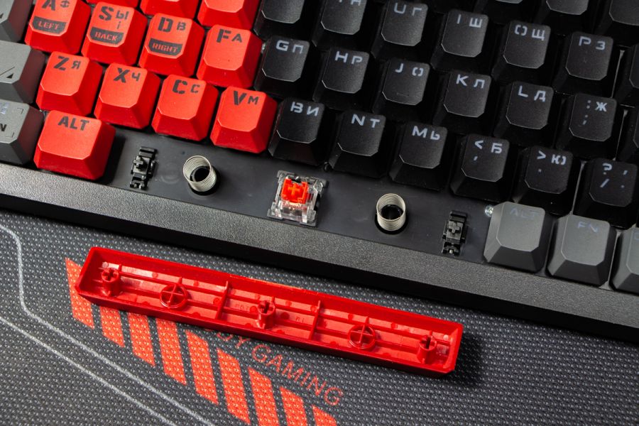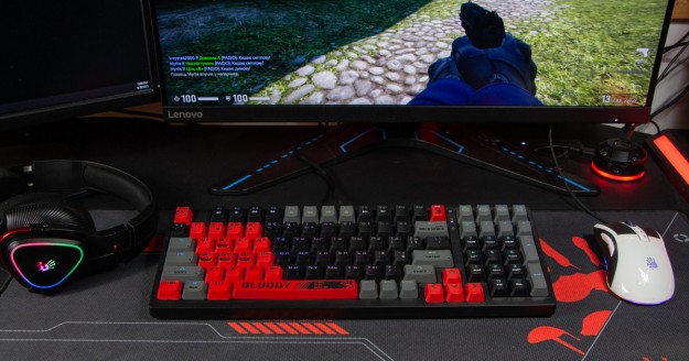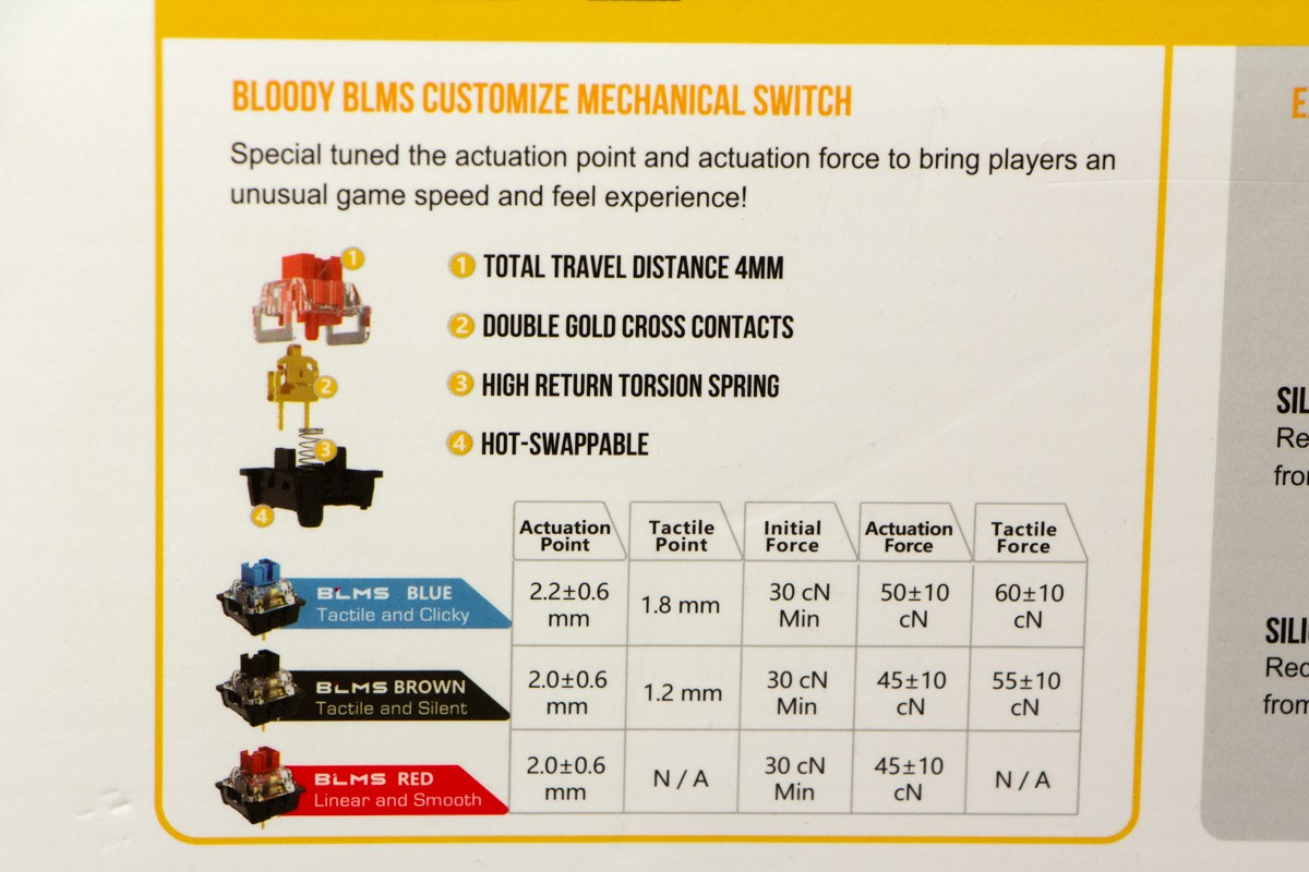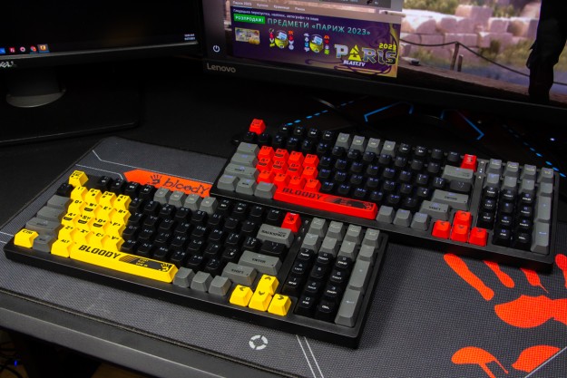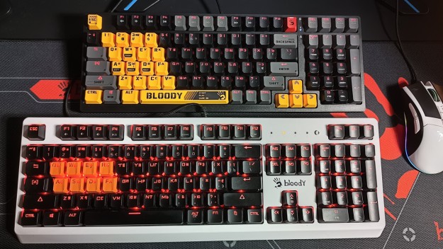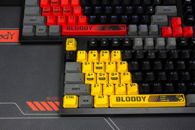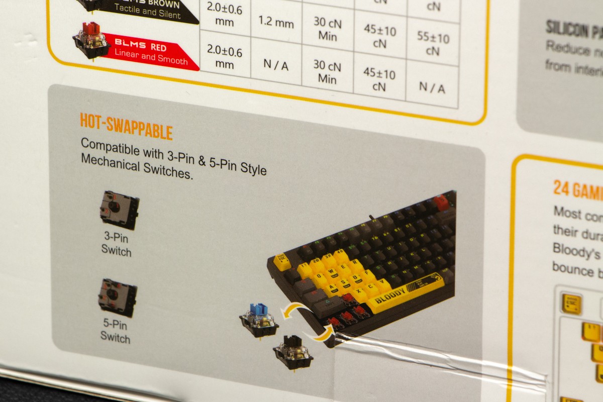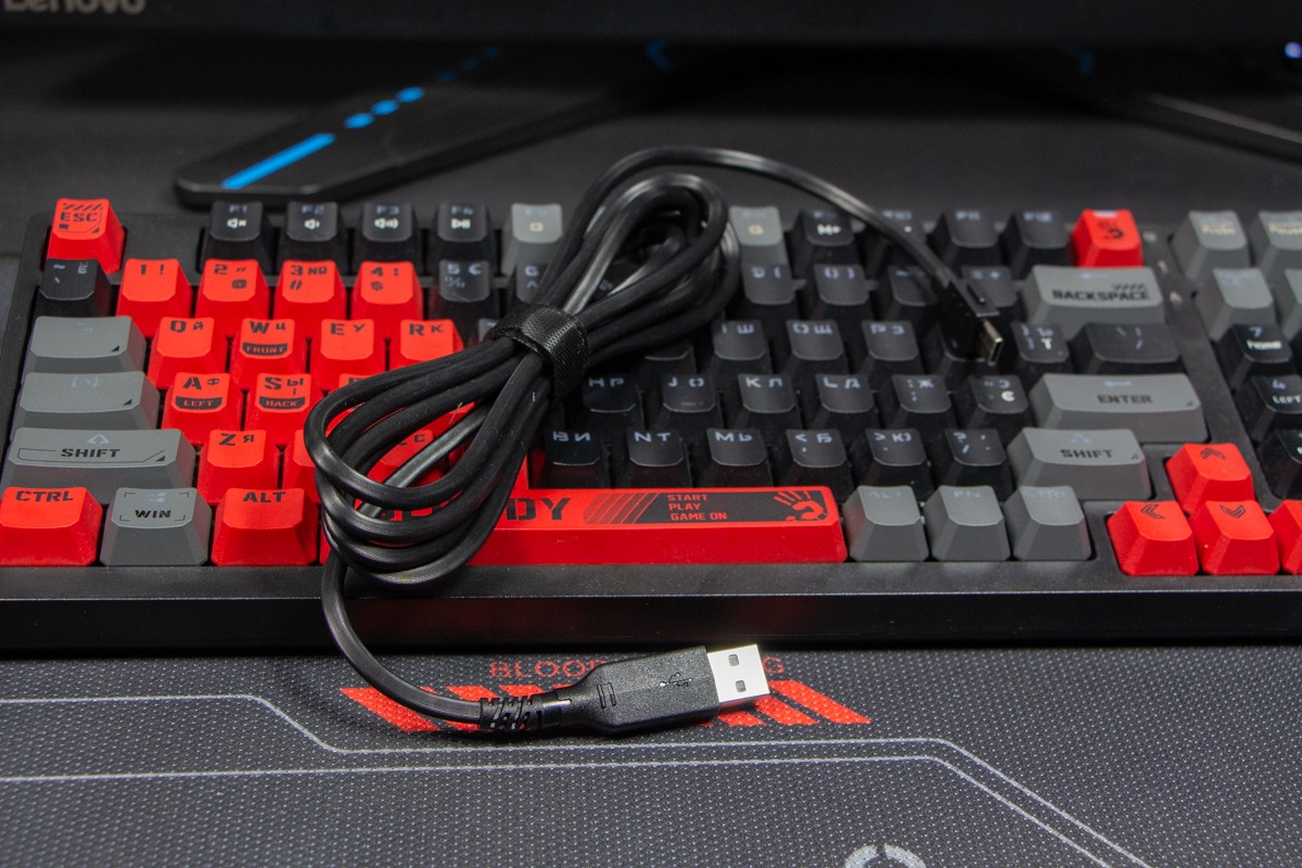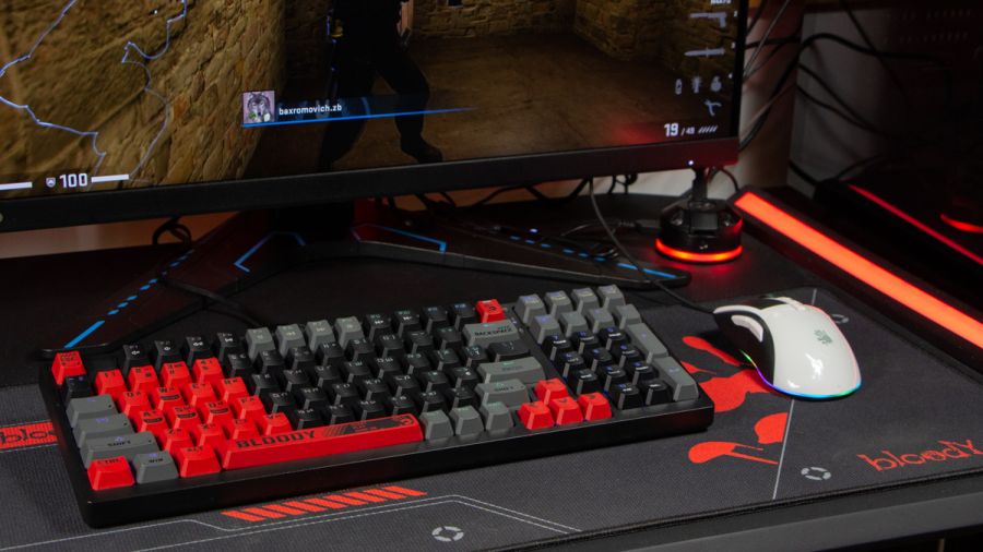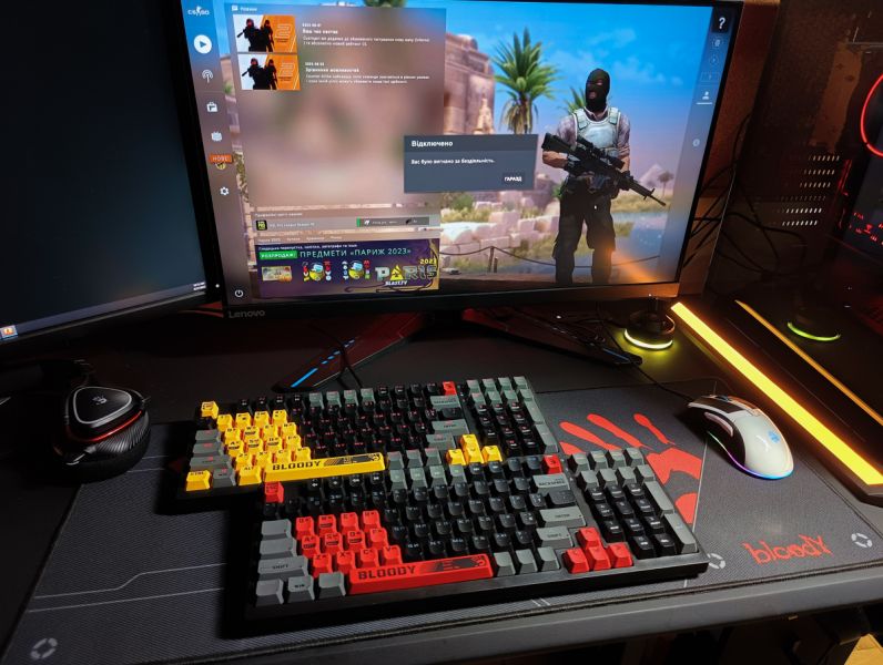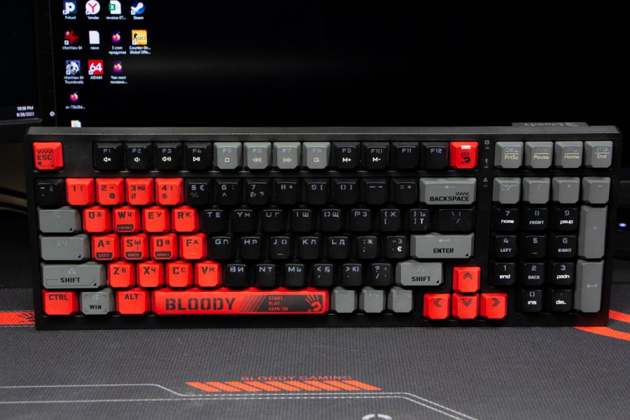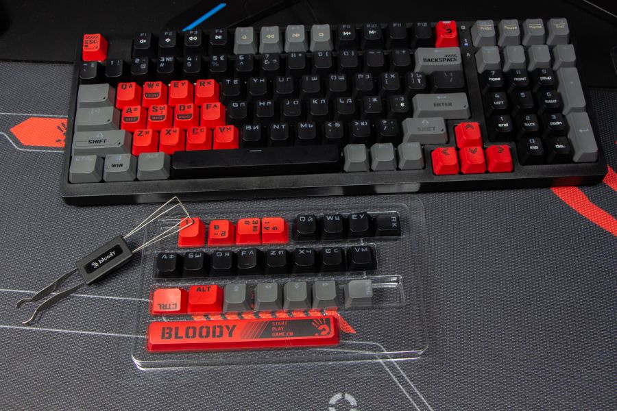 Огляд клавіатури Bloody S98: реально ігрова, яскрава, компактна і надійнаМеханічна ігрова клавіатура Bloody S98 з перемикачами BLMS Red ні в чому не обмежує свого власника, хоч виробник і поставив собі за мету зробити її компактною без втрати окремого цифрового блоку. Налаштування підсвітки, 98 клавіш, регульовані ніжки і зручний кабель менеджмент, пам’ять для зберігання ігрових режимів – це більшість, але не всі особливості клавіатури. Враження від експлуатації, особливості перемикачів і деталі по варіантах підсвічування розповім далі у огляді. Комплектація Вже звик, що всі клавіатури Bloody пропонуються у червоно-чорних кольорах? Так от Bloody S98 навіть коробкою відрізняється від інших моделей виробника, бо має переважаючий білий колір. Технічні характеристики та фото пристрою на пакуванні присутні. Всередині коробки знаходимо клавіатуру з прозорою кришкою, зрозумілий і інформативний посібник користувача, 12 додаткових червоних BLMS перемикачів, клавіші чорного та сірого кольору на заміну червоним, інструмент для зняття кейкапів та перемикачів, і кабель USB C – USB A для підключення до ПК або ноутбуку. Відмічу якісне прогумоване покриття кабелю, довжина якого 1,8 м, а також можливість його виводу з-під корпусу клавіатури на три сторони. Дизайн і Корпус Bloody S98 – компактна клавіатура з габаритами 385х138х41 мм. Нижче можете бачити її фото поруч з клавіатурою Bloody B810RC, яку можна вважати «класичним» форматом. Зменшення габаритів моделі Bloody S98 відбулось шляхом розташування клавіш у дві секції. Основний лівий блок максимально наблизили до клавіш-цифр, причому місця між ними вистачило лише для індикаторів. На стику секцій розмістили стрілки, а більшість того, що прибрали над ними, розмістили над цифровим блоком. Навіть для PrtScr там знайшлось місце. Щоправда, пару звичних клавіш натискаються в парі з кнопкою FN. Форма корпусу клавіатури – прямокутник, що максимально компактно. Трішки заокруглені лише краї в місцях зустрічі торців. Відстань від клавіш до краю корпусу мінімальна. Основний колір корпусу – чорний, червоного додають лише 25 кейкапів у моделі S98 Sports Red. У моделі S98 Sports Lime ці клавіші жовті. Особисто я обрав би червоний, але і жовтий виглядає яскраво, якщо вдало підібрали килимок. Завдяки грі кольорів клавіатура може виглядати яскраво, але власник може при бажанні все «затемнити» змінними кейкапами з комплектації. 24 зі згаданих червоних кейкапів зроблені з PBT (полібутилентерефталату). Це більш довговічний пластик, який потрібен «агресивним» ігроманам. Ці кейпаки виготовлені методом подвійного лиття, завдяки чому написи на кнопках стерти майже неможливо. Звертаю увагу на форму клавіш. Зверху вони скошені зліва і праворуч аби поліпшити тактильний контакт. На червоних та жовтих клавішах принт більший, а пробіл прикрасили логотипом і слоганом бренду Bloody. Натискаючи на клавішу не почуєте дзвінкий клік, бо конструктивно передбачені силіконові накладки. А це значить, що граючи або набираючи тексти будете по мінімуму заважати оточуючим. По столі клавіатура також «бити» не буде, бо тилова сторона опирається на чотири прогумовані ніжки. Відкидні ніжки для зручності можуть підіймати корпус трішки більше ніж на 1 см, а це змінює кут нахилу майже на 7 градусів. Десь близько десяти клавіатур Bloody пройшли через мої руки і по якості збірки до них питання не виникали, д