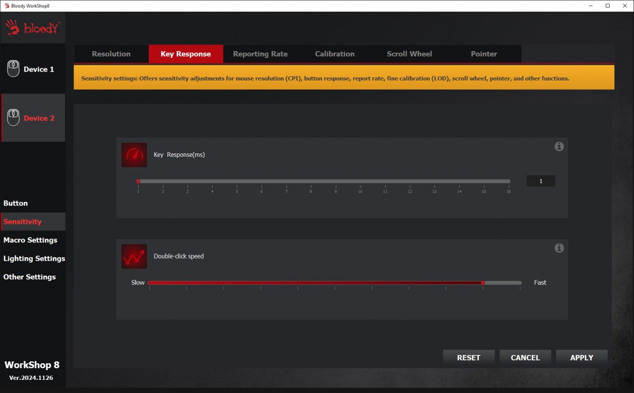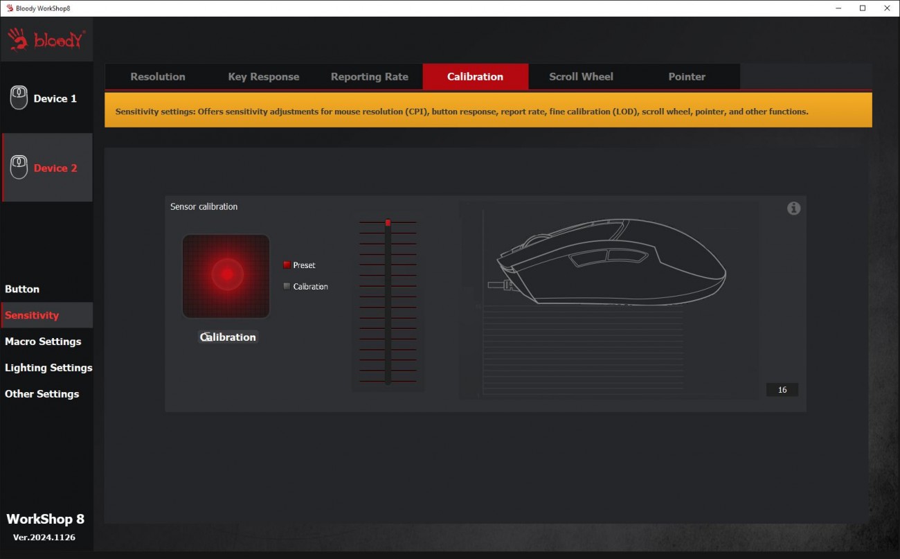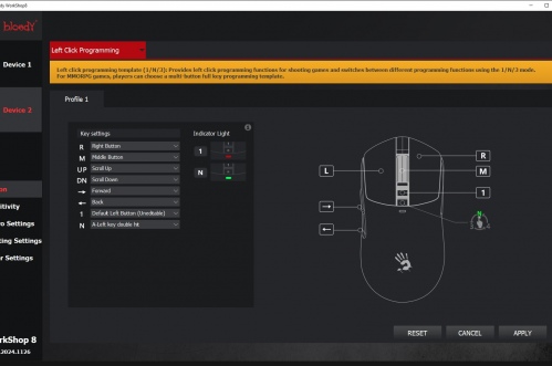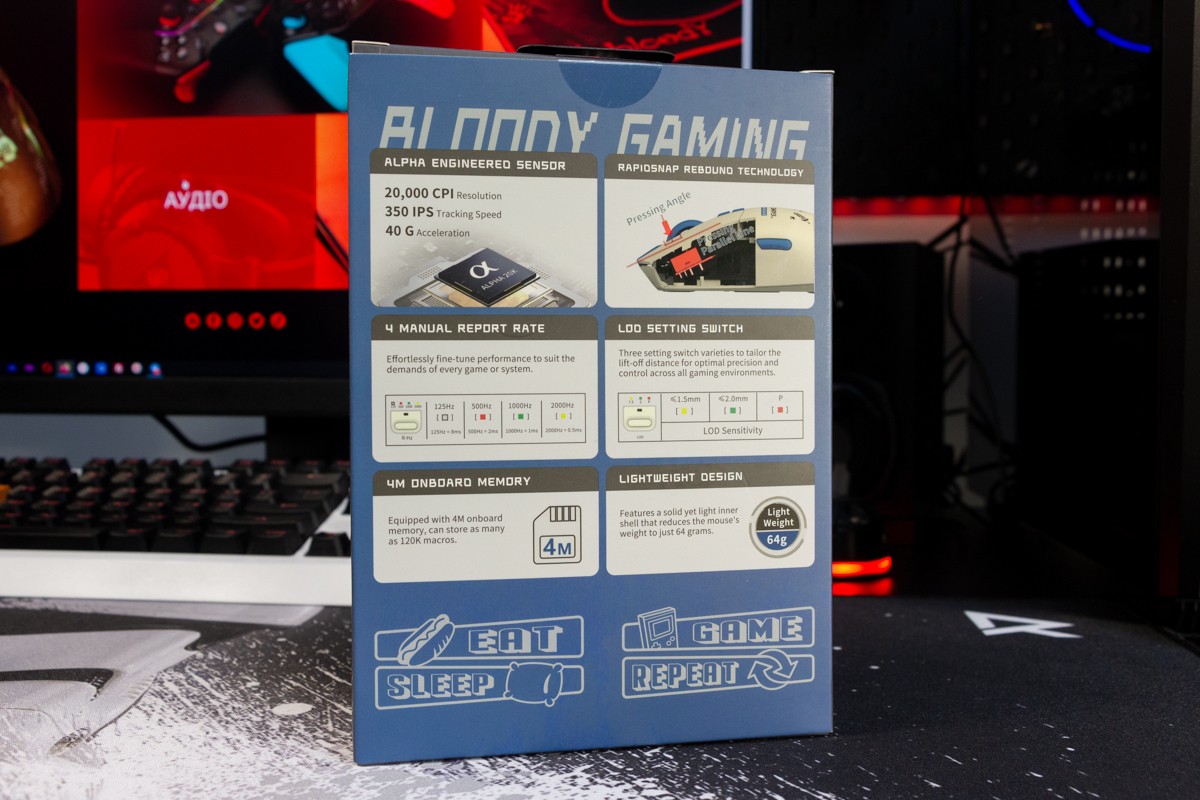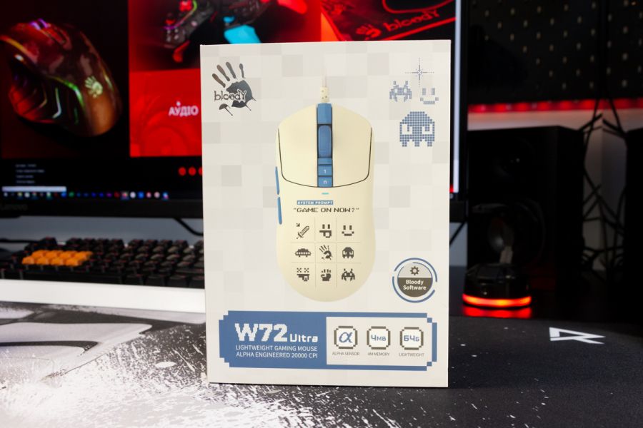 Огляд ігрової миші Bloody W72 Ultra: легка модель у «ретро» стилі з професійним сенсоромГеймер, який правильно вибрав собі мишу, вже може вважати, що половину шляху до перемоги він пройшов. Новачкам та професіоналам в ігрових світах бренд Bloody пропонує достатній асортимент моделей ігрових мишей. В цьому огляді пропоную розібрати Bloody W72 Ultra в кольорі Pixels Blue, яка зовні хоч і виглядає трішки “ретро”, але всередині максимально сучасна. Про її сенсор, ергономіку, програмне забезпечення та мої враження дізнаєшся з огляду. Комплектація Bloody W72 Ultra потрапляє до власника не у звичній для бренду чорно-червоній коробці, а в “піксельній” сіро-блакитній з бічним відкриттям верхньої частини. Відкриваючи коробку як книжку, можна оглянути мишку та оцінити її розміри, не виймаючи з упаковки. Усередині знаходяться сама миша, гарантійний талон та набір прогумованих наклейок. Останні будуть потрібні, якщо захочете покращити щеплення з парою великих верхніх клавіш і боками. Миша з дротовим підключенням, кабель під’єднується по центру. Оплітка м’яка з тканини, довжина кабелю 1.9 метри. Дизайн і Корпус Миша Bloody W72 Ultra має обтічну форму, яка підходить під обидві руки. Вага невелика - всього 64 г. Габарити миші 125 х 63 х 41 мм. Корпус з матового пластику молочного кольору. Яскравим блакитним кольором виділили бічні кнопки, колесо і пару маленьких кнопок поруч з ним. Компонування кнопок є типовим для ігрових мишей. Збоку клавіші з базовими функціями навігації вперед і назад, розташовані під великий палець. Зверху кнопки для перемикання DPI. Коліщатко миші має прогумоване покриття з чітким тактильним відгуком і ледь чутними клацаннями. Маю уточнити, що й інші кнопки на миші не надто “голосні”. Ресурс колеса - понад 800000 прокручувань. Основні кнопки (ЛКМ і ПКМ) не інтегровані в корпус та конструктивно зроблені по технології RapidSnap Rebound, що гарантує збереження чутливості при відскоку кнопки на весь ресурс - понад 30 мільйонів натискань. Нижче на картинці від виробника бачите архітектуру миші всередині. Знизу на корпусі чотири тефлонові ніжки для плавного ковзання, віконце оптичного сенсора та пара кнопок для перемикання частоти відгуку і LOD (відстань відриву). Останні два параметри додають зручності тим, хто точно знає, як оптимально налаштувати мишу для своїх потреб. Збірка хороша, матеріали мені сподобались. Сенсор Графіка на корпусі переносить нас у світ “стародавніх” піксельних ігор, саме тому в заголовку до цієї статті я використав слово “ретро”. От якби ще знизу замість віконця сенсора була куля, то схожість з механічними мишами мого дитинства була б майже 100%. Але Bloody W72 Ultra - це сучасна миша в якій задіяно новий та дуже продуктивний сенсор Alpha 20K Gaming Engine, який забезпечує швидкість відгуку всього 1 мілісекунду та роздільну здатність до 20000 CPI. Повний діапазон - 50-20000 CPI. Він гарантує точність і бажану плавність переміщення курсора, що особливо важливо для прицілювання та управління в іграх. Ще однією перевагою цієї моделі є можливість вибору одного з чотирьох рівнів частоти опитування 125-500-1000-2000 Гц, що дозволяє налаштувати мишу під конкретні вимоги гри або системи. Це забезпечує максимальну продуктивність і чутливість у різних ігрових сценаріях. З корисних цифр по сенсору варто знати, що швидкість відстеження - 350 lPS, а максимальне прискорення - 40G. Тести Високоточний сенсор 