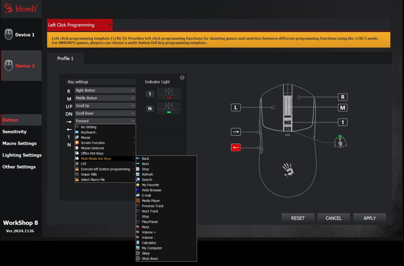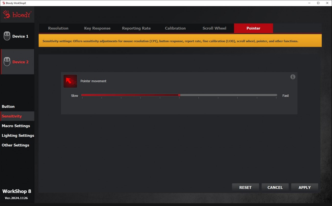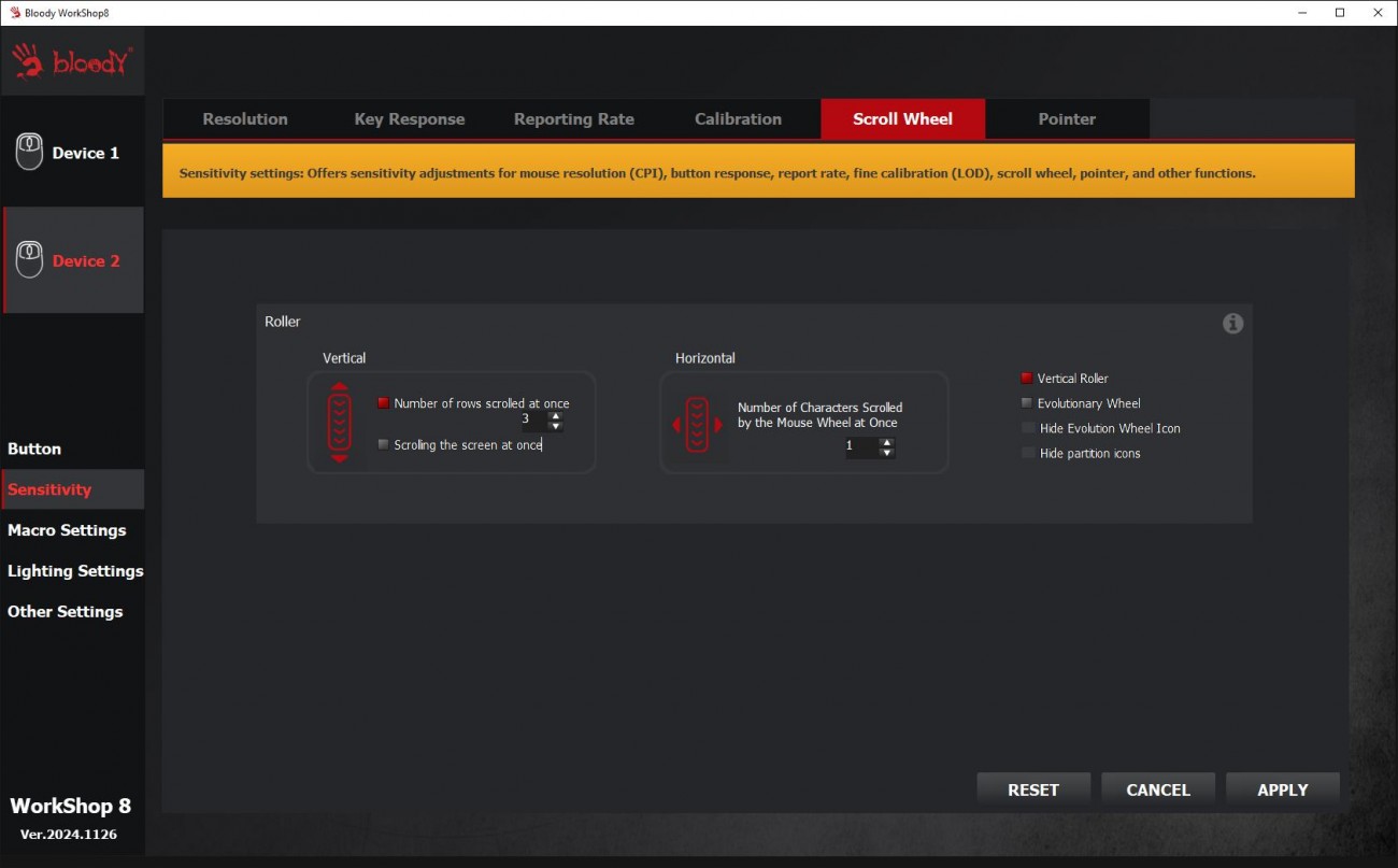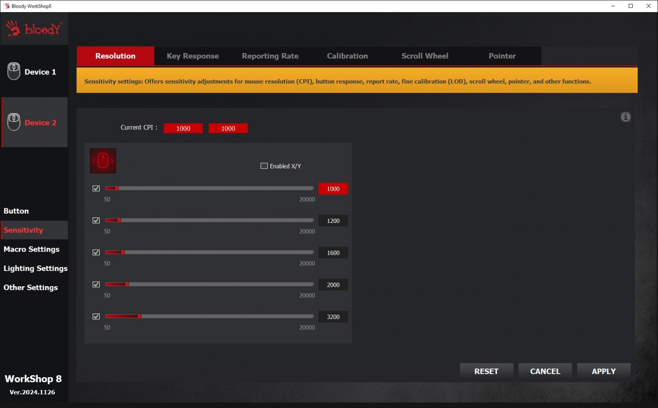 Огляд ігрової миші Bloody W72 Ultra: легка модель у «ретро» стилі з професійним сенсоромГеймер, який правильно вибрав собі мишу, вже може вважати, що половину шляху до перемоги він пройшов. Новачкам та професіоналам в ігрових світах бренд Bloody пропонує достатній асортимент моделей ігрових мишей. В цьому огляді пропоную розібрати Bloody W72 Ultra в кольорі Pixels Blue, яка зовні хоч і виглядає трішки “ретро”, але всередині максимально сучасна. Про її сенсор, ергономіку, програмне забезпечення та мої враження дізнаєшся з огляду. Комплектація Bloody W72 Ultra потрапляє до власника не у звичній для бренду чорно-червоній коробці, а в “піксельній” сіро-блакитній з бічним відкриттям верхньої частини. Відкриваючи коробку як книжку, можна оглянути мишку та оцінити її розміри, не виймаючи з упаковки. Усередині знаходяться сама миша, гарантійний талон та набір прогумованих наклейок. Останні будуть потрібні, якщо захочете покращити щеплення з парою великих верхніх клавіш і боками. Миша з дротовим підключенням, кабель під’єднується по центру. Оплітка м’яка з тканини, довжина кабелю 1.9 метри. Дизайн і Корпус Миша Bloody W72 Ultra має обтічну форму, яка підходить під обидві руки. Вага невелика - всього 64 г. Габарити миші 125 х 63 х 41 мм. Корпус з матового пластику молочного кольору. Яскравим блакитним кольором виділили бічні кнопки, колесо і пару маленьких кнопок поруч з ним. Компонування кнопок є типовим для ігрових мишей. Збоку клавіші з базовими функціями навігації вперед і назад, розташовані під великий палець. Зверху кнопки для перемикання DPI. Коліщатко миші має прогумоване покриття з чітким тактильним відгуком і ледь чутними клацаннями. Маю уточнити, що й інші кнопки на миші не надто “голосні”. Ресурс колеса - понад 800000 прокручувань. Основні кнопки (ЛКМ і ПКМ) не інтегровані в корпус та конструктивно зроблені по технології RapidSnap Rebound, що гарантує збереження чутливості при відскоку кнопки на весь ресурс - понад 30 мільйонів натискань. Нижче на картинці від виробника бачите архітектуру миші всередині. Знизу на корпусі чотири тефлонові ніжки для плавного ковзання, віконце оптичного сенсора та пара кнопок для перемикання частоти відгуку і LOD (відстань відриву). Останні два параметри додають зручності тим, хто точно знає, як оптимально налаштувати мишу для своїх потреб. Збірка хороша, матеріали мені сподобались. Сенсор Графіка на корпусі переносить нас у світ “стародавніх” піксельних ігор, саме тому в заголовку до цієї статті я використав слово “ретро”. От якби ще знизу замість віконця сенсора була куля, то схожість з механічними мишами мого дитинства була б майже 100%. Але Bloody W72 Ultra - це сучасна миша в якій задіяно новий та дуже продуктивний сенсор Alpha 20K Gaming Engine, який забезпечує швидкість відгуку всього 1 мілісекунду та роздільну здатність до 20000 CPI. Повний діапазон - 50-20000 CPI. Він гарантує точність і бажану плавність переміщення курсора, що особливо важливо для прицілювання та управління в іграх. Ще однією перевагою цієї моделі є можливість вибору одного з чотирьох рівнів частоти опитування 125-500-1000-2000 Гц, що дозволяє налаштувати мишу під конкретні вимоги гри або системи. Це забезпечує максимальну продуктивність і чутливість у різних ігрових сценаріях. З корисних цифр по сенсору варто знати, що швидкість відстеження - 350 lPS, а максимальне прискорення - 40G. Тести Високоточний сенсор 