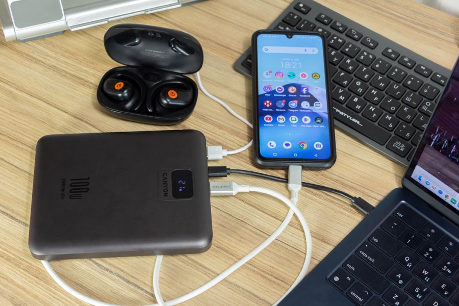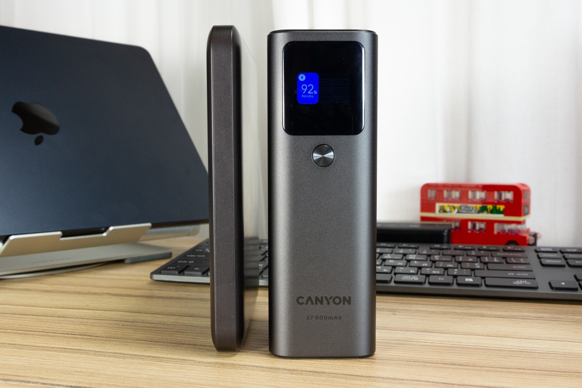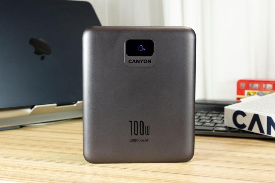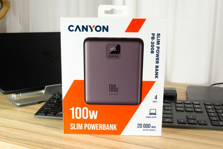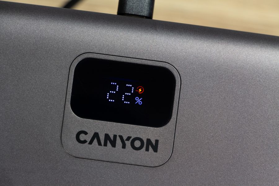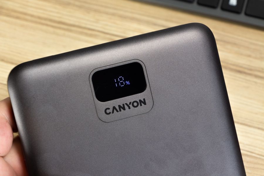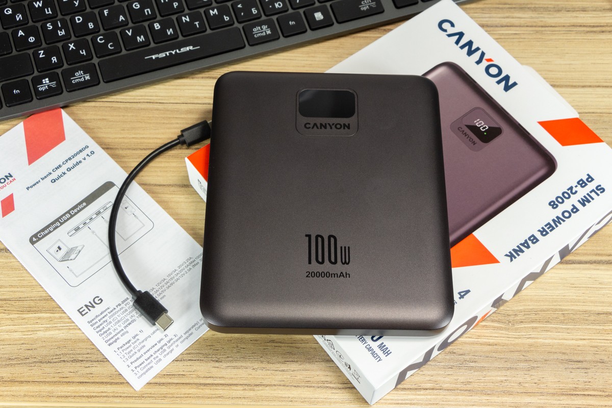 Огляд павербанка Canyon PB-2008 на 20000 мАг: 4 порти, потужність 100 Вт і дисплейCanyon PB-2008 — це павербанк з двома портами Type-C, двома класичними USB портами, батареєю на 20 000 мАг та потужністю 100 Вт, у зручному пласкому корпусі. Звучить ідеально, адже до всього цього на цифровому дисплеї можна побачити залишок заряду. Як модель PB-2008 проявила себе в реальному використанні та які обмеження по потужності має при одночасному підключенні 2-х, 3-х та 4-х пристроїв — читайте в огляді. Дизайн і Корпус Павербанки з самого початку створювалися, щоб носити їх з собою у якості додаткової батареї до гаджету. Canyon PB-2008 продовжує “класичні” традиції і тому створений, як на мене, щоб бути максимально зручним в дорозі. Причина перша - компактні розміри (159x130x16.8 мм) і вага всього 480 г. Причина друга — корпус з пластику, що зменшує вагу. Матовий пластик робить корпус стійким до подряпин і приємним на дотик. Колір корпусу — темно-сірий, майже чорний. Причина третя - чотири порти для зарядки. Їх розмістили на верхньому торці: два USB-C із потужністю до 100 Вт і 30 Вт, і два USB-A на 30 Вт. Порти USB-C також можуть використовуватися для зарядки самого пристрою з максимальною потужністю 65 Вт. На лицьовій пласкій частині корпусу розташований LCD дисплей, вказано ємність павербанка, його потужність і лого виробника. Порти підписані на зворотному боці корпусу. Окремим блоком прописані потужності на портів на виході при одночасному підключенні до них 2-х, 3-х та 4-х пристроїв. Для мене така інформація корисна, а звичайному покупцю варто запам’ятати одне - найпотужнійший свій гаджет, наприклад, ноутбук, підключайте заряджатись через USB-C1. І сам павербанк заряджайте через нього - там буде найшвидше. З правої сторони від портів розміщена кнопка живлення, яка підсвічує дисплей і показує залишок заряду батареї. До збірки Canyon PB-2008 нарікань не маю. Якщо корпус прижати по центру або потрясти то ніяких сторонніх звуків не почуєте. Можливості Canyon PB-2008 отримав акумулятор ємністю 20000 мАг. Ця ємність є актуальною для власника повного набору мобільних гаджетів: ноутбука, смартфона, планшета, бездротових навушників і смарт-годинника. Зазначена ємність у 74 Вт·год дозволяє використовувати його всюди, навіть у літаку. Canyon PB-2008 працює за принципом "підключив і використовуй". Ви під’єднуєте пристрій для зарядки, і павербанк одразу показує залишок заряду у відсотках на екрані. Якщо підключити пристрій, що підтримує швидку зарядку, поруч із відсотками з’являється помаранчевий символ блискавки. Це актуально і тоді, коли ви заряджаєтесь швидко. Однак інформація про те, скільки часу залишилося до повного розрядження батареї (під час заряджання пристроїв) або до її повного відновлення заряду (коли ви заряджаєте павербанк), не відображається. Протягом тижня активного тестування моделі PB-2008 я заряджав різні пристрої, і результати залежали від того, чи підтримують вони швидку зарядку. Детально про порти: