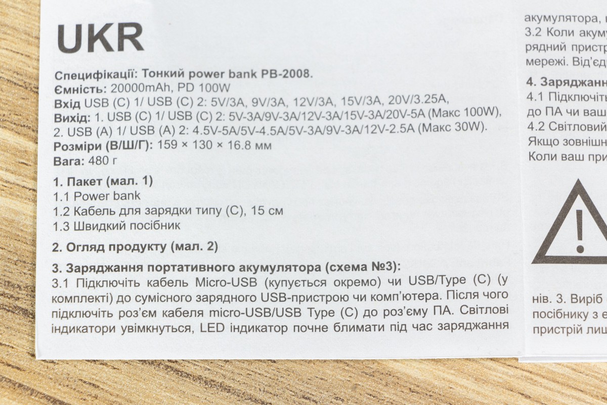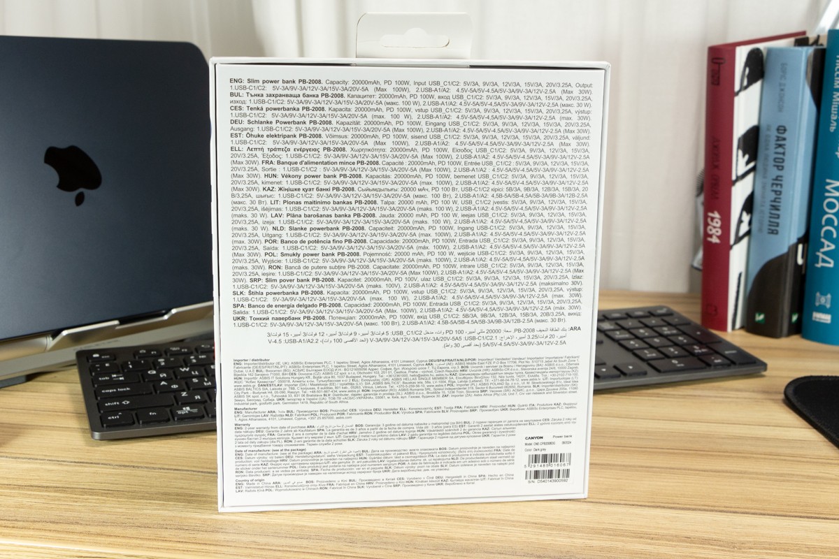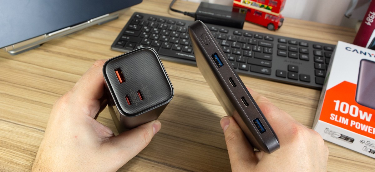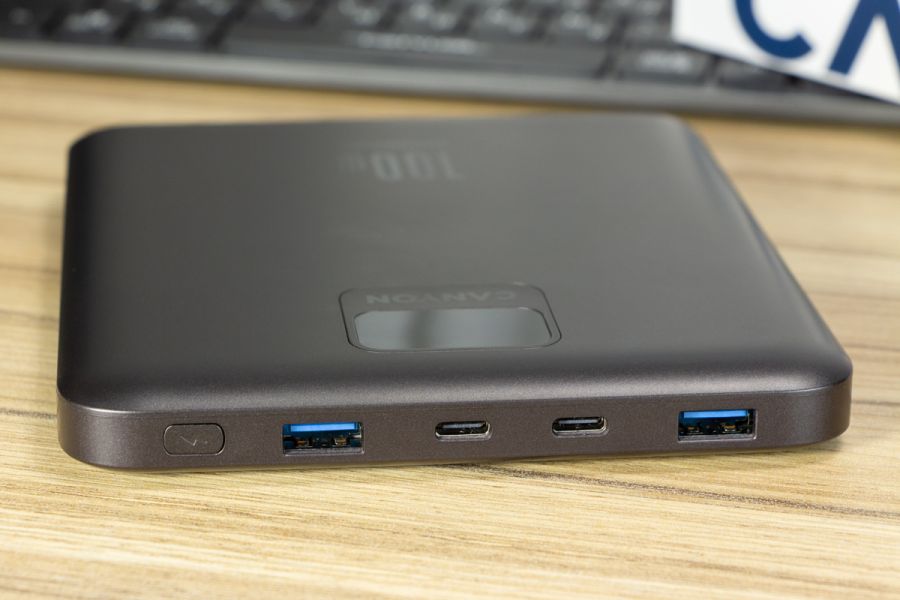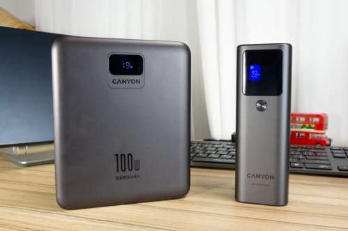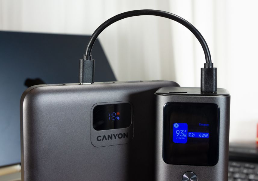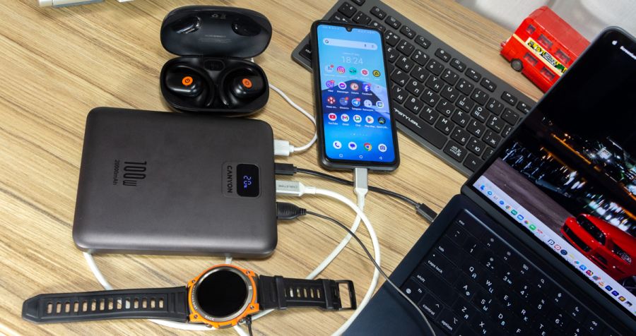 Огляд павербанка Canyon PB-2008 на 20000 мАг: 4 порти, потужність 100 Вт і дисплейCanyon PB-2008 — це павербанк з двома портами Type-C, двома класичними USB портами, батареєю на 20 000 мАг та потужністю 100 Вт, у зручному пласкому корпусі. Звучить ідеально, адже до всього цього на цифровому дисплеї можна побачити залишок заряду. Як модель PB-2008 проявила себе в реальному використанні та які обмеження по потужності має при одночасному підключенні 2-х, 3-х та 4-х пристроїв — читайте в огляді. Дизайн і Корпус Павербанки з самого початку створювалися, щоб носити їх з собою у якості додаткової батареї до гаджету. Canyon PB-2008 продовжує “класичні” традиції і тому створений, як на мене, щоб бути максимально зручним в дорозі. Причина перша - компактні розміри (159x130x16.8 мм) і вага всього 480 г. Причина друга — корпус з пластику, що зменшує вагу. Матовий пластик робить корпус стійким до подряпин і приємним на дотик. Колір корпусу — темно-сірий, майже чорний. Причина третя - чотири порти для зарядки. Їх розмістили на верхньому торці: два USB-C із потужністю до 100 Вт і 30 Вт, і два USB-A на 30 Вт. Порти USB-C також можуть використовуватися для зарядки самого пристрою з максимальною потужністю 65 Вт. На лицьовій пласкій частині корпусу розташований LCD дисплей, вказано ємність павербанка, його потужність і лого виробника. Порти підписані на зворотному боці корпусу. Окремим блоком прописані потужності на портів на виході при одночасному підключенні до них 2-х, 3-х та 4-х пристроїв. Для мене така інформація корисна, а звичайному покупцю варто запам’ятати одне - найпотужнійший свій гаджет, наприклад, ноутбук, підключайте заряджатись через USB-C1. І сам павербанк заряджайте через нього - там буде найшвидше. З правої сторони від портів розміщена кнопка живлення, яка підсвічує дисплей і показує залишок заряду батареї. До збірки Canyon PB-2008 нарікань не маю. Якщо корпус прижати по центру або потрясти то ніяких сторонніх звуків не почуєте. Можливості Canyon PB-2008 отримав акумулятор ємністю 20000 мАг. Ця ємність є актуальною для власника повного набору мобільних гаджетів: ноутбука, смартфона, планшета, бездротових навушників і смарт-годинника. Зазначена ємність у 74 Вт·год дозволяє використовувати його всюди, навіть у літаку. Canyon PB-2008 працює за принципом "підключив і використовуй". Ви під’єднуєте пристрій для зарядки, і павербанк одразу показує залишок заряду у відсотках на екрані. Якщо підключити пристрій, що підтримує швидку зарядку, поруч із відсотками з’являється помаранчевий символ блискавки. Це актуально і тоді, коли ви заряджаєтесь швидко. Однак інформація про те, скільки часу залишилося до повного розрядження батареї (під час заряджання пристроїв) або до її повного відновлення заряду (коли ви заряджаєте павербанк), не відображається. Протягом тижня активного тестування моделі PB-2008 я заряджав різні пристрої, і результати залежали від того, чи підтримують вони швидку зарядку. Детально про порти: