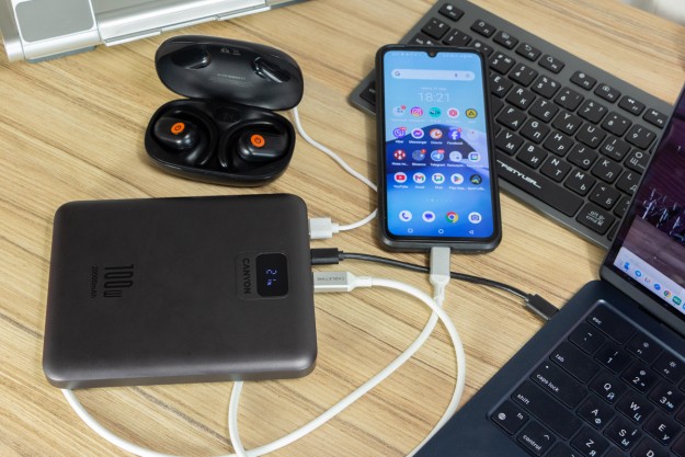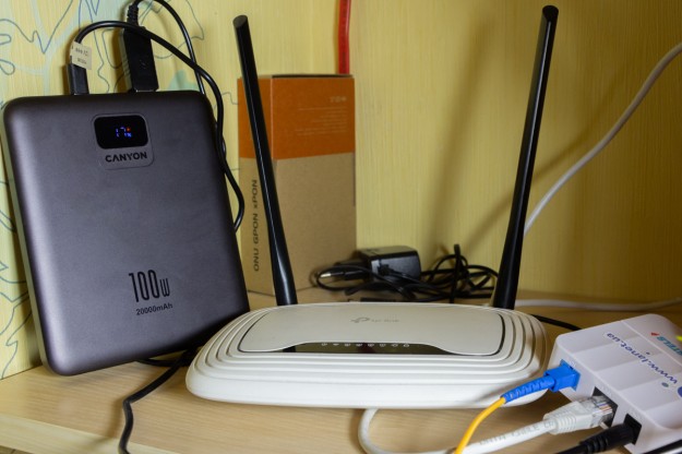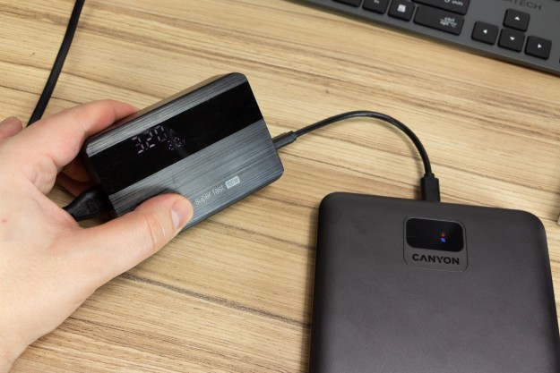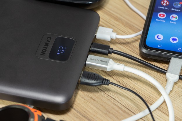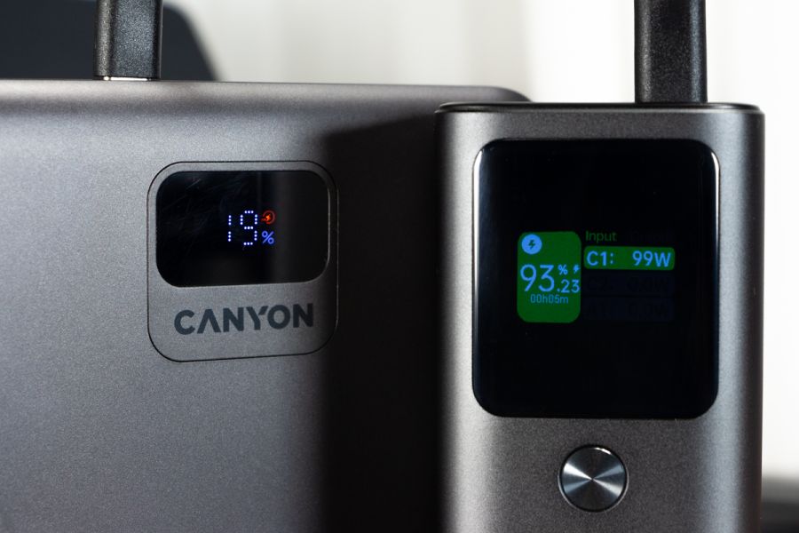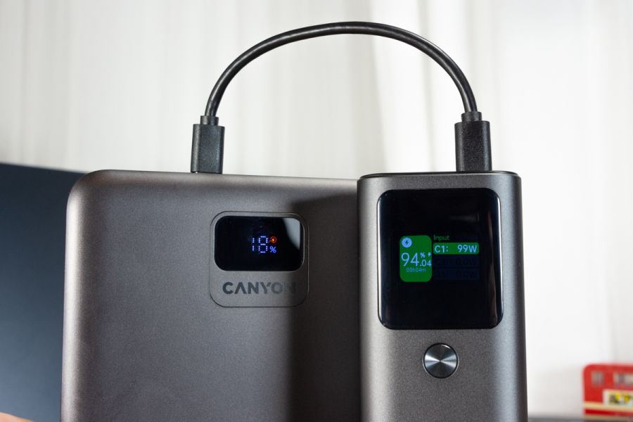 Найефективніше я можу продемонструвати роботу павербанка при зарядці MacBook. За допомогою кабелю USB-C - USB-C довжиною 15 см з комплекту портативний акумулятор Canyon PB-2008 може заряджати 13-дюймовий MacBook Air M2 потужністю до 50 Вт, віддаючи близько 15% заряду за 15 хвилин на ноутбук, який під час зарядки використовувався для роботи з офісними додатками. При цьому на екрані павербанка показано зменшення залишку заряду на 19%. Якщо б ноутбук не був активним під час заряджання, результати могли б бути ще кращими. Варто враховувати, що різні пристрої споживають різну кількість енергії від PB-2008 залежно від рівня їхнього заряду. Наприклад, підключення ще одного пристрою до порту USB-A може суттєво знизити швидкість зарядки. Canyon PB-2008 віддає заряд Звичайні бездротові навушники в боксі з акумулятором ємністю 450 мАг за 30 хвилин набрали заряду з 0 до 40%. Швидку зарядку вони не підтримують, і максимум, що приймають, - це 5 Вт. При цьому потужність на порту, до якого підключено ноутбук, знижується з 100 Вт до 20 Вт для обох портів (USB-C1 + USB-A1). Але якщо обрати пару USB-C1 + USB-A2, то максимум на виході на два порти буде 95 Вт. Це важливо! На корпусі ці нюанси розписані. Уточню, що в процесі зарядки та віддачі енергії пристроям із підтримкою "швидкої зарядки" корпус стає теплим, але не гарячим. Якщо вимкнули світло і зник мобільний інтернет, то, маючи кабель USB A - DC 5.5x2.1 мм 12В, ви можете живити від Canyon PB-2008 свій роутер і PON модуль (якщо у вас оптика). Залежно від потужності, він зможе працювати автономно до 8 годин. При цьому у вас немає обмежень щодо зарядки свого смартфона чи навушників від павербанку. Повного заряду Canyon PB-2008 загалом вистачає на те щоб не менше ніж 3-чі власник міг зарядити свій iPhone незалежно від його моделі. Якщо потрібно швидко зарядити сам Canyon PB-2008, вам знадобиться швидкий блок живлення, оскільки в комплекті його немає. В асортименті Canyon є ціла лінійка GaN зарядних пристроїв, від 20 Вт до 100 Вт, наприклад, Canyon H-100 або H-65. При зарядці з 0 до повного відновлення батареї адаптером на 65 Вт знадобиться лише близько 70 хвилин. Під час зарядки дисплей починає блимати, показуючи, що батарея заряджається. Canyon PB-2008 заряджається Реальні цифри по зарядці: