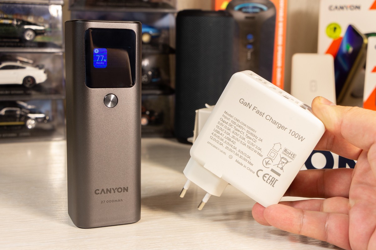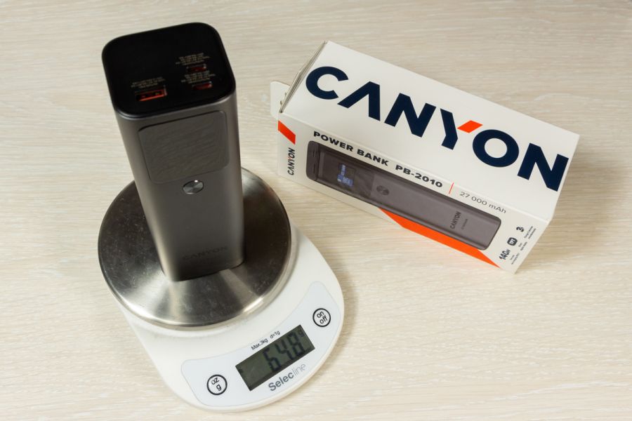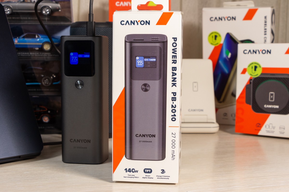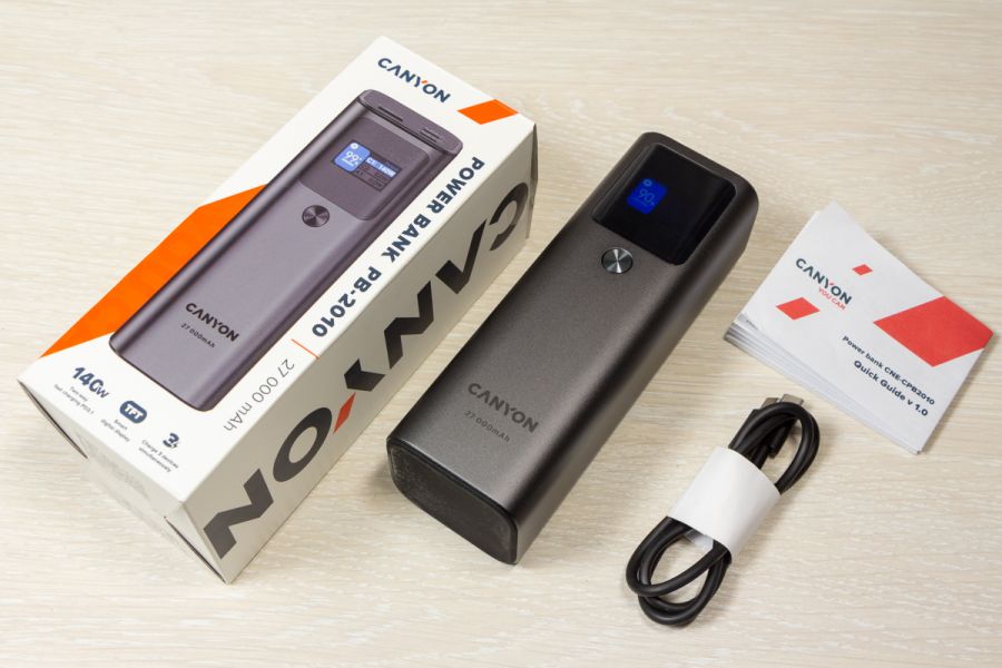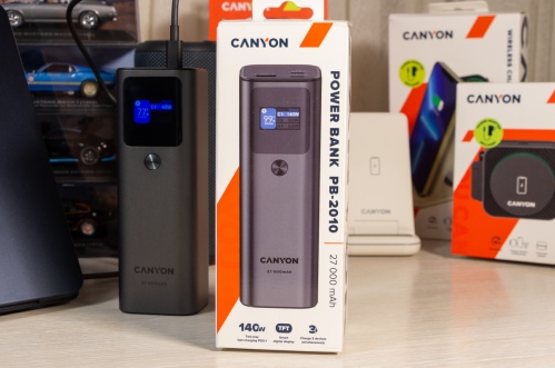 Огляд павербанка Canyon PB-2010: до 140 Вт на зарядку і ємність 27000 мАгПопит на потужні портативні зарядки для смарт-пристроїв зростає разом з можливостями цих пристроїв, включаючи ноутбуки і смартфони, швидко заряджатись. Цей запит від користувачів змусив виробників розробити двонаправлені швидко зарядні зовнішні акумулятори. У цьому огляді розглядаю павербанк Canyon PB-2010 (CNE-CPB2010DG) , який має два порти USB-C і один порт USB-A, підтримує максимальну вихідну та вхідну потужність 140 Вт, а тому сам швидко заряджається і так само швидко може віддавати заряд. Мої враження від користування пристроєм і реальні заміри в цифрах дізнаєтесь з огляду. Дизайн і Корпус Зовні Canyon PB-2010 - це прямокутний паралелепіпед зі закругленими ребрами. Габарити 154 х 52 х 50 мм, вага 650 г. Металу в конструкції багато. Він темно-сірий і не тонкий, пальцем його не продавити. “Найкорисніша” сторона корпусу - бічна. Саме та, на якій розмістили три порти: два USB Type C і один USB Type A. Про їх можливості розповім пізніше. Не менш корисна бічна сторона з екраном. Це TFT панель, яка в реальному часі показує: