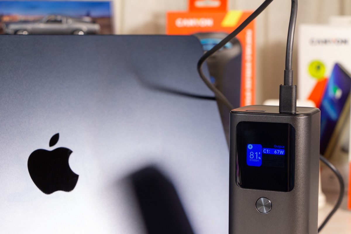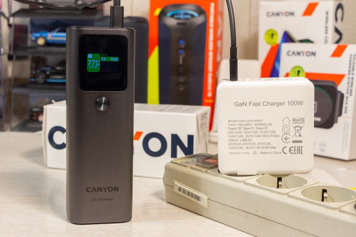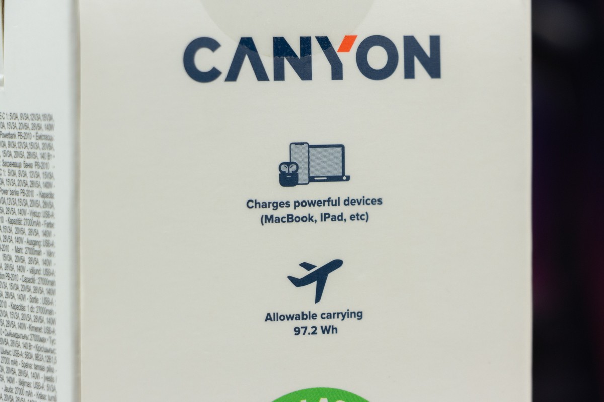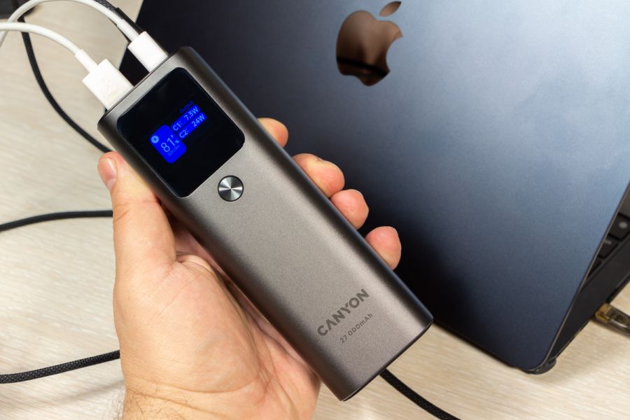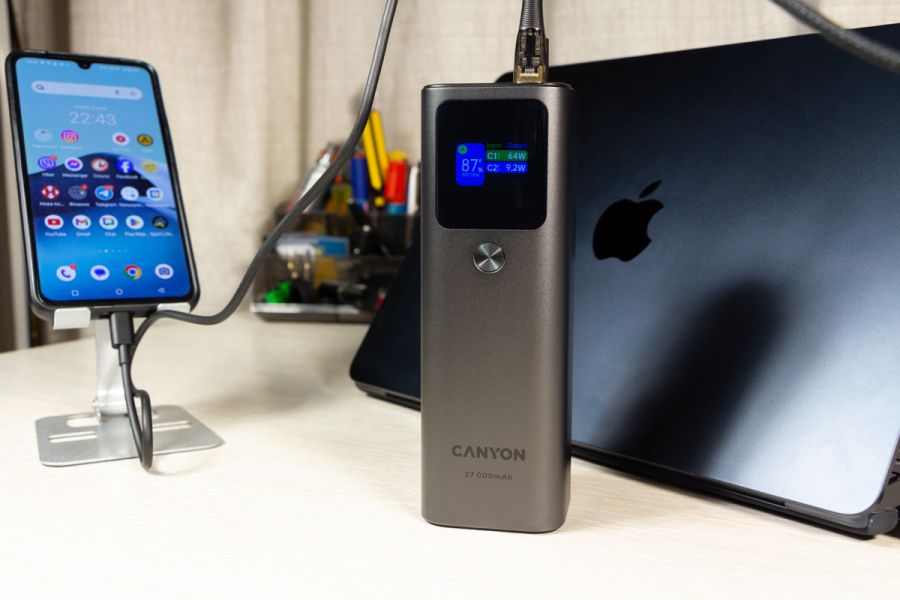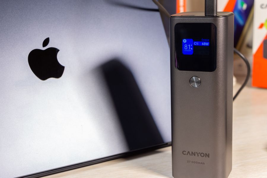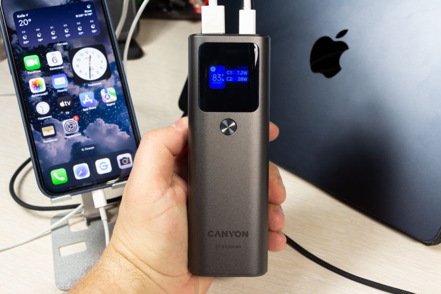 Наявна комбінація портів робить його універсальним для заряджання різноманітних пристроїв. За допомогою кабелю з комплекту портативний акумулятор Canyon PB-2010 може заряджати 13-дюймовий MacBook Air M2 потужністю до 50 Вт, віддаючи близько 15% заряду за 15 хвилин на ноутбук, який під час зарядки показує відео в Youtube на максимальній яскравості дисплея. При цьому заряд на екрані павербанка показав зменшення залишку заряду на 12%. Вже згадана мною підтримка технології Power Delivery 3.1 робить пристрій на огляді достатньо універсальним, щоб заряджати кілька смартфонів, планшетів або ноутбуків, гарантуючи задоволення потреб власника у зарядці. 1 павербанк замість 3-х Щоб дати приблизне уявлення про зарядну “витривалість” Canyon PB-2010, скажу лиш те, що він може повністю зарядити iPhone 14 Pro Max гарантовано 4 рази з 0 і до 100%. Якщо ж вимкнули світло і сидите без електроенергії, то маючи кабель USB A - DC 5.5x2.1 мм 12В можете заживити від Canyon PB-2010 свій роутер і він, залежно від потужності, зможе працювати автономно до 10 годин. Через спеціальні USB C перехідники, яких достатньо і Інтернеті, до павербанка можна підключати і іншу портативну техніку. Додаткова перевага пристрою на огляді в тому, що власник може одночасно підзаряджати павербанк через один USB C порт і віддавати заряд з нього через пару інших портів. Висновки Canyon PB-2010 - це на мою думку, next-level павербанк. Так вважаю, бо цей пристрій призначений не лише для зарядки класичного набору зі смартфона та бездротових навушників, але й ноутбук легко зарядить так само швидко, а іноді і швидше, ніж це роблять комплектні блоки живлення. Canyon PB-2010, хоч і не призначений для того, щоб носити його в кишені, та все ж поєднує в собі вражаючу ємність і потужність зарядки в компактному дизайні. За інформативний дисплей та метал в корпусі від мене окрема подяка виробнику. Та все ж головне, що завдяки підтримці Power Delivery 3.1 та двонаправленим портам USB C павербанк може швидко заряджатися сам та передавати до 140 Вт на підключені до нього пристрої. Нагадаю, що одночасно можна під’єднати 3 гаджети. Акумулятор ємністю 27000 мАг або 97,2 Вт*год обраний саме такої потужності, щоб його можна було брати до ручної поклажі в літак, так як по правилам можна брати в салон літака лише пристрої з акумулятором до 100 Вт*год. Потужності достатньо, щоб ваші мобільні пристрої працювали в дорозі у відрядженнях, подорожах, або в моменти, коли на тривалий час вимикають електроенергію.