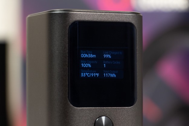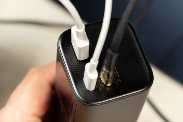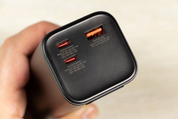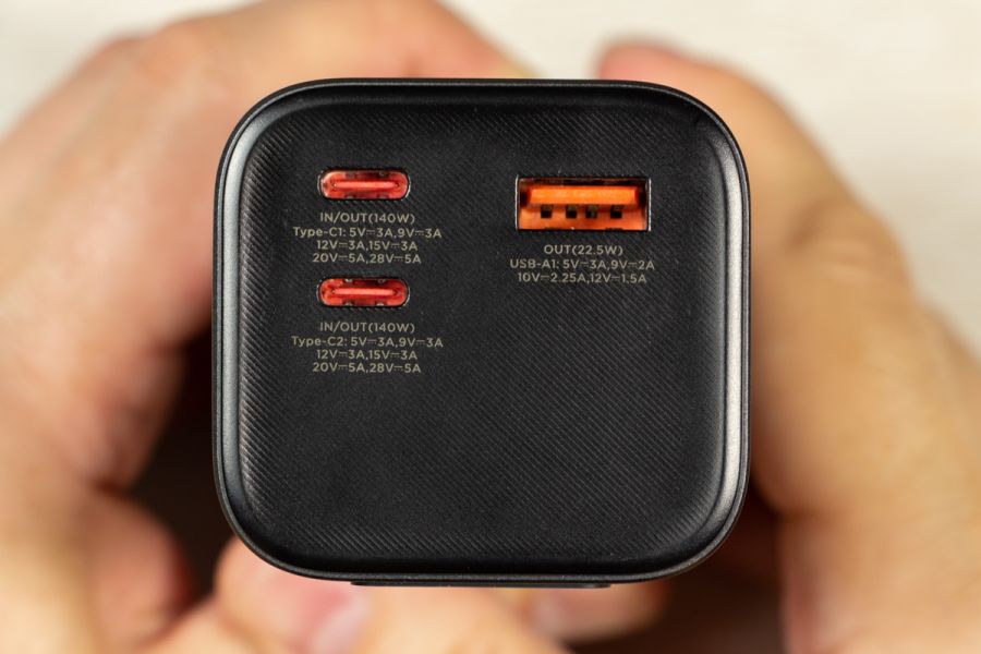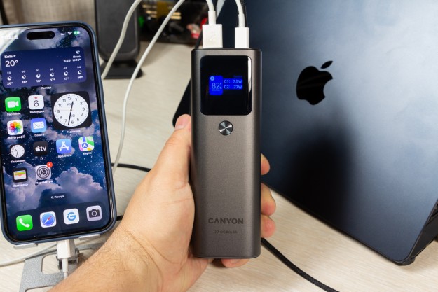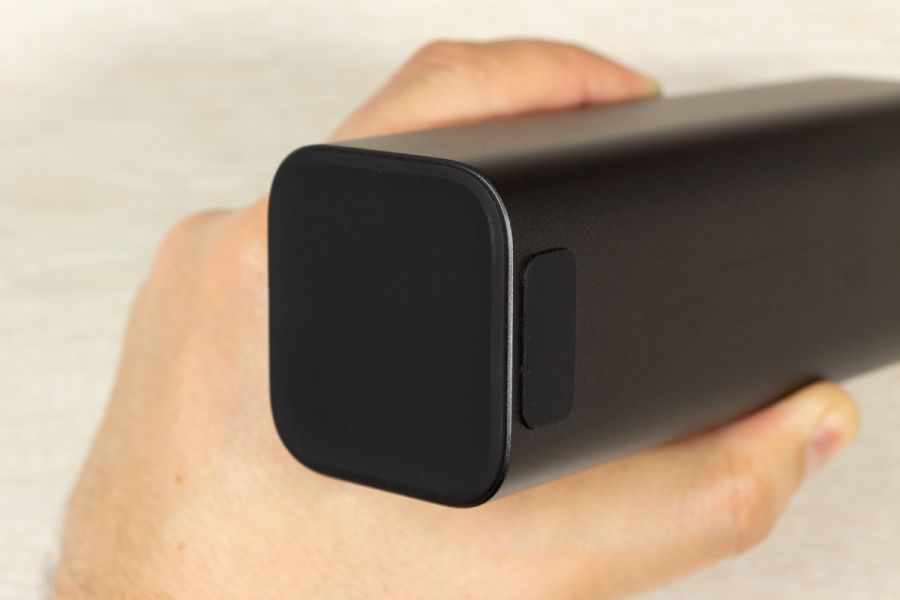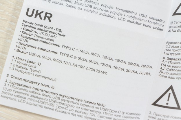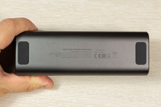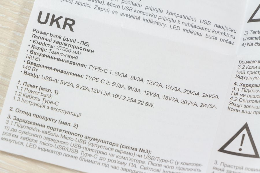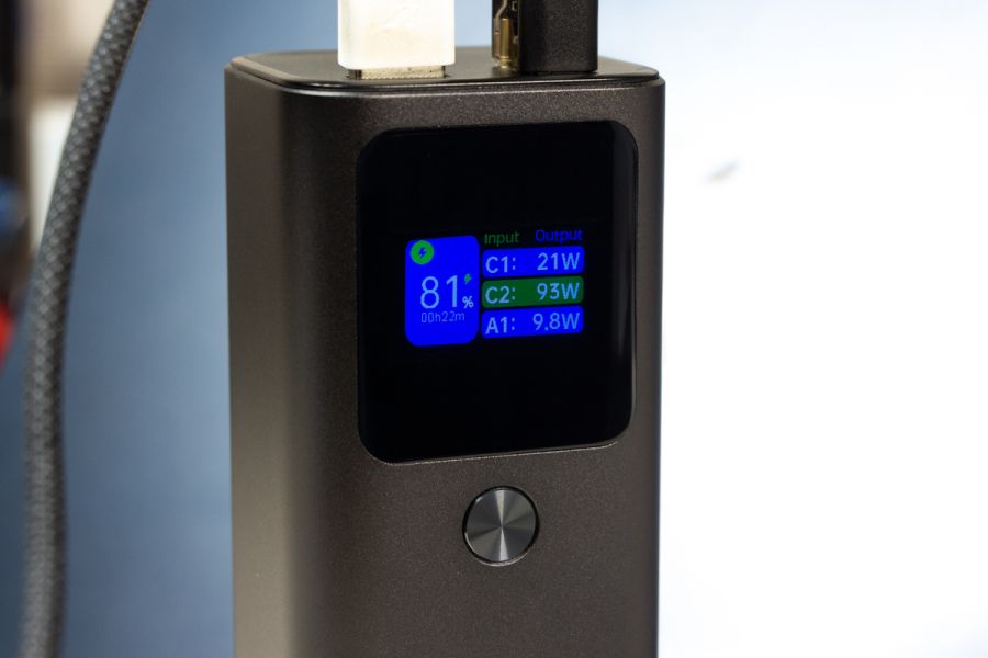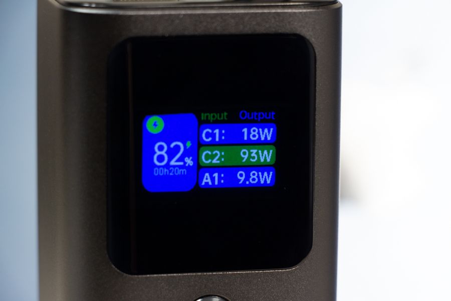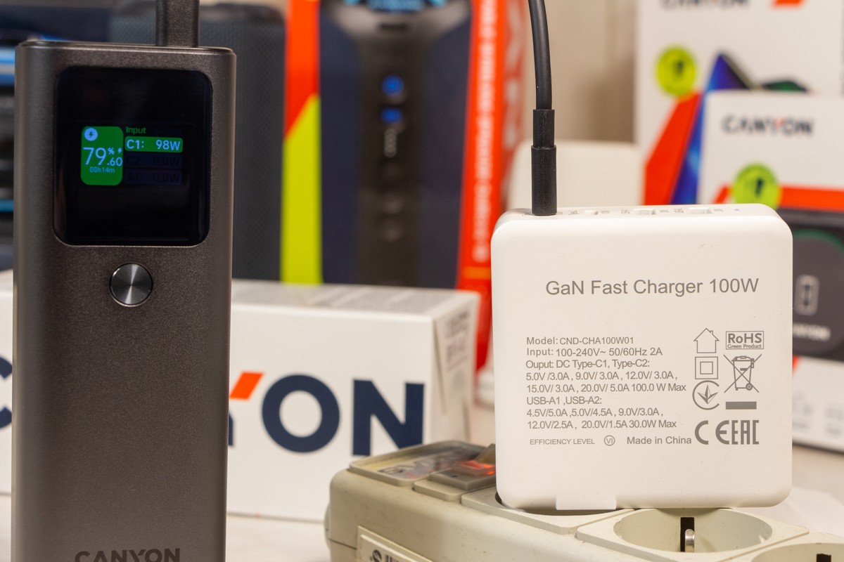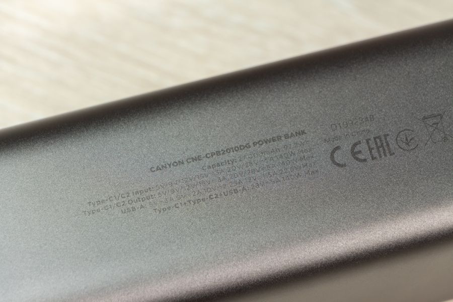 Натискаючи двічі на кнопку можете обрати режим підсвітки дисплея: увімкнений поки не вимкнете або активність 30 с і автоматичне вимикання. Важливі елементи корпусу відмітив, але ще є що додати. Прогумована панель знаходиться з протилежної від портів сторони, щоб чіплятися за поверхню при вертикальному розміщенні. Дві тонкі прогумовані ніжки передбачили і для горизонтальної «стійки». Між ніжками на корпусі розміщена повна інформація про характеристики портів. Зауважу, що під кожним портом також детально описані його можливості. Як висновок по дизайну відзначу вдалий вибір форми корпусу, зручне розміщення портів та інформативність дисплея. По збірці корпусу в мене претензії відсутні. Навіть якщо його сильно потрясти то сторонні звуки відсутні і всередині нічого не рухається. Можливості Стати власником павербанка Canyon PB-2010 - це означає отримати його разом з кабелем USB-C - USB-C довжиною 55 см і невеликою інструкцією, але без блоку живлення в комплекті. Що це означає на практиці? Ви або будете підзаряджати його зарядним, наприклад, від свого смартфона, що не дуже швидко. Або поцікавитесь, що таке GaN зарядки, і чому варто звернути увагу на них. Огляд потужних GaN від Canyon виходив на сайті, почитайте. В реальному тесті зарядне на 100 Вт підзаряджає Canyon PB-2010 за 10 хвилин з 0 до 15,4%, а вже за 20 хвилин маємо 30% заряду. В цьому пристрої всі цифри видно на екрані. Як на мене, то це зручно, адже дисплей не лише допомагає контролювати процес заряджання, а також надає оцінку часу, необхідного для повного заряджання і розряджання, що допомагає краще планувати та керувати своїми потребами в зарядці. Продемонстрована висока швидкість підзарядки можлива завдяки підтримці портами USB C технології Power Delivery 3.1. Під час тестування я заряджав від павербанка від одного до трьох пристроїв одночасно: MacBook Air 2022 M2, iPhone 14 Pro Max і realme 12 Pro через порт USB-A. Під час роботи завжди контролював температуру, павербанк залишався прохолодним і стабільно віддавав заряд відповідно до можливостей підключених пристроїв. Детально про порти на Canyon PB-2010: