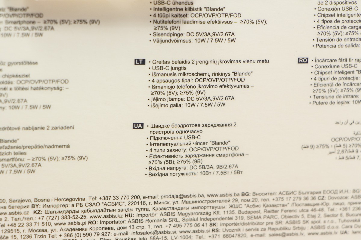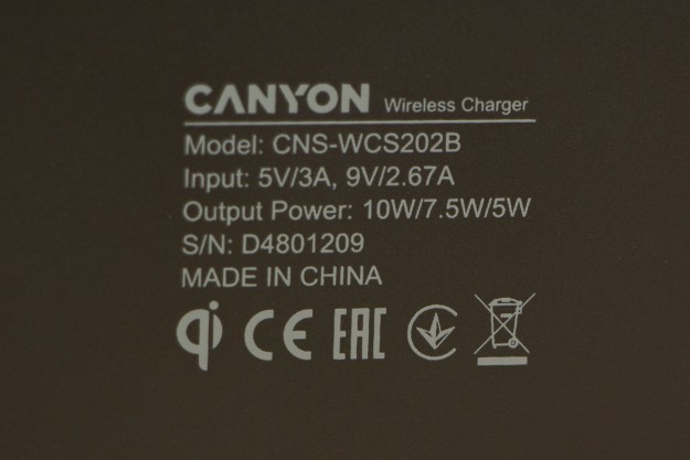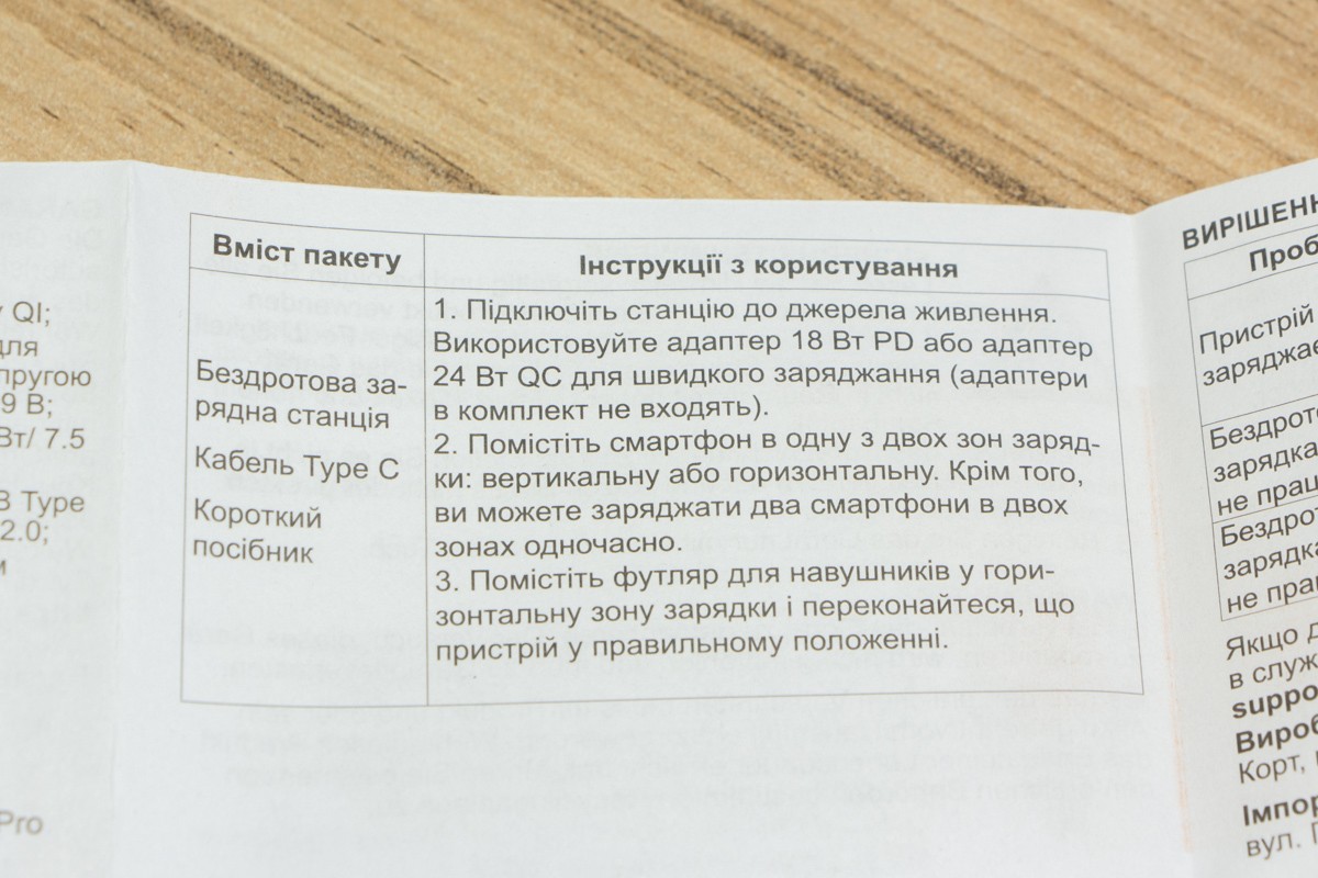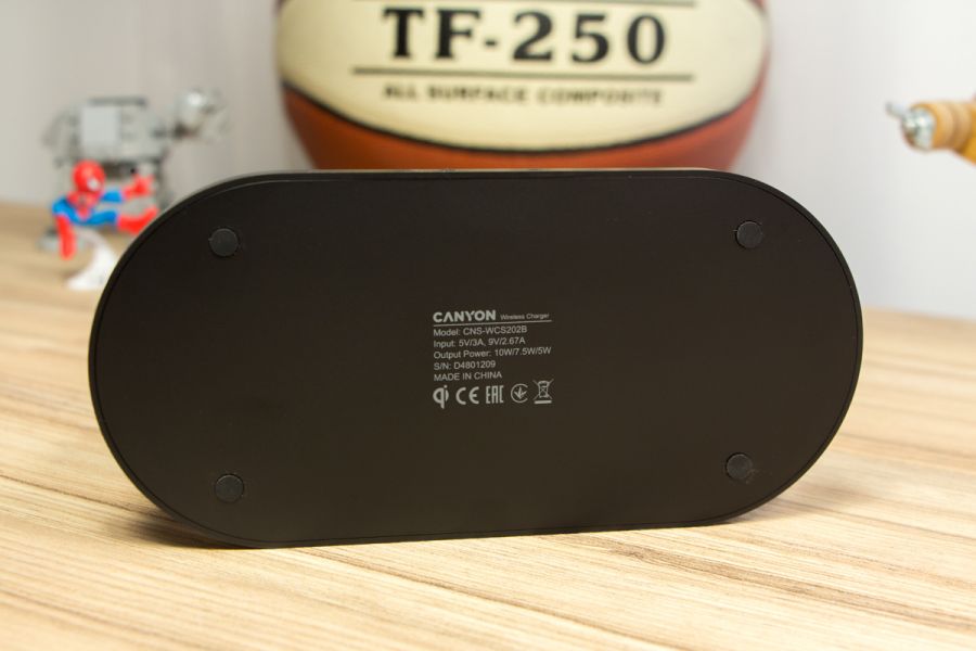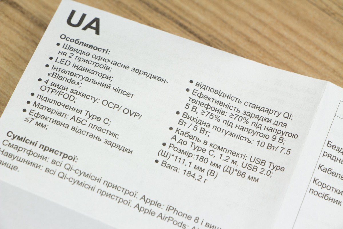 Габарити 180 x 86 x 111 мм, вага 185 г. Пристрій візуально поділено на дві функціональні частини. Перша – підставка під смартфон, яка розташована під кутом 65-70 градусів і покрита спереду дуже приємним на дотик матеріалом, який нагадує прогумовану тканину. На підставці можна розмістити та заряджати смартфон в альбомному або портретному режимі. Аби уникнути сповзання смартфону передбачили невеликий гумовий обмежувач. Друга – горизонтальна площина в основі станції, на якій візуально виділили місце для розміщення боксу для навушників. До речі, це можуть бути не лише навушники, а і ще один смартфон або мобільний пристрій з підтримкою бездротової зарядки стандарту Qi. На лицьовому торці передбачили пару блакитних світлодіодних індикаторів, які сповіщають вас, коли працює один з модулів зарядки. На протилежному торці зарядної станції – роз’єм Type-C для подачі живлення на пристрій. Виробник рекомендує використовувати зарядку потужністю не менше 18 Вт, а ще краще на 24 Вт. Від себе порекомендую обрати ЗУ з напругою від 9 Вольт. У нижній частині док-станції передбачили чотири гумові ніжки, щоб вона не ковзала по столу. Фіксація навіть на нерівних поверхнях достатня. Збірка корпусу не викликає нарікань. Досвід користування Налаштування пристрою неймовірно просте. По суті, просто потрібно підключити один кабель живлення та поставити Canyon CNS-WCS202 на стіл або тумбу. Якщо ваш смартфон підтримує бездротову зарядку, він почне отримувати заряд просто помістивши його на підставку для заряджання. Пристрій підходить для смартфонів від iPhone 8 та більш нових продуктів Apple, а також для інших телефонів, що підтримують Qi. Підставка складається з 2 котушок і віддає потужність 10 Вт. Це відносить станцію до початкового рівня. Можливо власникам Apple цього буде достатньо, але для сучасних флагманів Samsung, Xiaomi, Huawei, OPPO 10 Вт вже мало. Але зважте, що і прайс на станцію невисокий. Зарядний блок, який я випробував на своїх навушниках, зі своєю задачею також справився. Одночасна зарядка 2 пристроїв доступна в форматі 10Вт + 5Вт. Тобто на смартфон може віддаватись максимум 10 Вт, але може і 5 Вт або 7.5 Вт, а на навушники – 5 Вт. Якщо покласти на зарядну станцію відразу два смартфони, то краще це робити в форматі – перед сном і на всю ніч. Ефективна відстань заряджання не перевищує 7 мм, тож з телефону чохол можна не знімати. Ефективність заряджання смартфонів складає близько 70% при підключенні блоку живлення на 5 В і 75% при 9В. А значить швидкість заряду пристроїв буде не такою швидкою, якби ви заряджали їх по кабелю та в бездротовому форматі. За весь час користування пристроєм у мене не виникло нарікань на його роботу та «якість» заряджання інших пристроїв. Смартфони не перегрівались, ситуацій, коли гаджет втрачав зв’язок зі станцією також. Важливо уточнити, що виробник обрав для Canyon CNS-WCS202 чіп «Blande», який називають «розумним» через можливість обирати оптимальну потужність зарядки. Також зазначається про підтримку захисту: