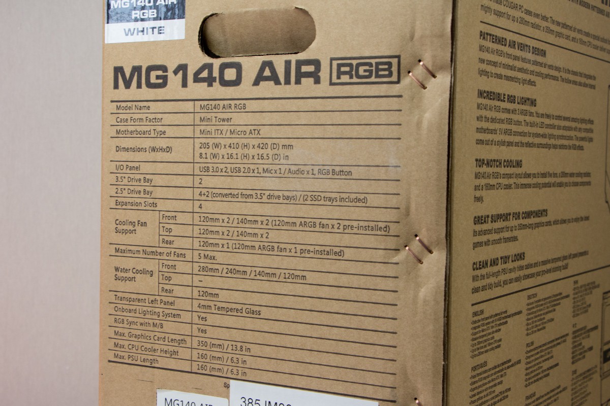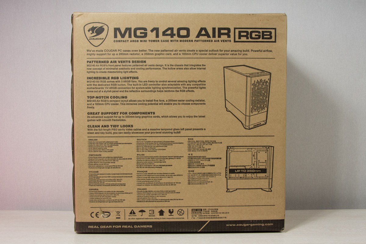Огляд корпусу Cougar MG140 AIR RGB: Mini Tower з трьома ARGB вентиляторами в комплектіНезважаючи на те, що корпус Cougar MG140 AIR RGB є Mini Tower для плат Mini ITX/Micro ATX, він пропонує майже ті ж функції, що і більші корпуси, включаючи три вентилятори зі змінним підсвічуванням, повноцінним контролером і традиційним компонуванням, яке не виключає встановлення рідинного охолодження. Докладніше про можливості та враження від корпусу дізнаєтеся з огляду. Комплектація Корпус поставляється в коробці із зображенням каркасу та таблицею характеристик. При транспортуванні він утримується двома пінопластовими вставками. Всередині корпусу розмістили пакет із гвинтами чорного кольору, кількома стяжками та інструкцією зі збирання. Дизайн та Корпус В основі конструкції Cougar MG140 AIR RGB метал. З пластику тільки передня знімна декоративна панель та пара ніжок. Візуальної складності дизайну задає лицьовий торець. Панель знімається з невеликим зусиллям і приховує за собою пиловловлюючу сітку і 2 вентилятори. Базово це два 120 мм устрою, але місця вистачає і для двох 140 мм. Покупець отримує два етапи фільтрації повітря, тому що сітка передбачена і за фігурними вирізами з’ємної панелі. Скляна прозора панель має невелику чорну рамку, тому ви зможете чітко бачити свої комплектуючі в зібраній системі. Брендінг практично непомітний. Cougar дуже скромно прописали на передній ніжці білим по білому. Забажаєте прикрасити корпус – проблемою не буде. На вентиляторах, звичайно ж, є логотипи бренду. На протилежному боці від скла – суцільна металева панель. Позаду відсік для блоку живлення та набір отворів для гвинтів, розміщених так, щоб вентилятор був направлений вниз. БЖ встановлюється при знятій бічній панелі. Під ним невеликі, але корисні подушечки із піноматеріалу. На одному рівні з БЖ – лоток для 3,5 дюймового диска. Над місцем під БЖ за суцільною непрозорою панеллю – 2 місця для встановлення 2.5 дюймових дисків. Знявши скляну панель товщиною 4 мм потрапляємо в основний відсік. Зліва зверху – третій 120-мм вентилятор ARGB. Він налаштований на виштовхування повітря. Прямо за курсом місце встановлення материнської плати. Праворуч пара "лицьових" вентиляторів. Зверху, як уже згадував, знаходиться магнітна сітки, під якою знаходяться монтажні отвори для двох 120- або 140-мм вентиляторів. Як варіант, сюди можна встановити радіатор до 280 мм. Через довгасту форму монтажних отворів встановлення такого блоку тут не повинно заважати материнській платі. Біля краю верхньої панелі зібрали порти та клавіші. Серед них два USB 3.0, USB 2.0 і звичайні аудіороз'єми, два діоди-індикатори, а також кнопка управління підсвічуванням, що працює від внутрішнього контролера ARGB, та клавіша живлення. Як на мене, USB 2.0 можна було б і відмовитися, замінивши його на USB Type-C. На нижній частині корпусу невеликий пиловий фільтр із металевої сітки для відсіку блока живлення. Ближче до передньої частини корпусу можете побачити систему кріплення корзини для жорстких дисків, яку можна трохи посунути назад або повністю зняти. Щоб отримати доступ до внутрішньої частини, просто викручуємо по два гвинти на кожній панелі. Внутрішнє компонування традиційне для баштового корпусу такого розміру. Всі дроти всередині корпусу Cougar MG140 AIR RGB мають чорне забарвлення, хоча колір корпусу міг припускати їх білий колір. Збірка дуже хороша. Габарити корпусу: 205 x 