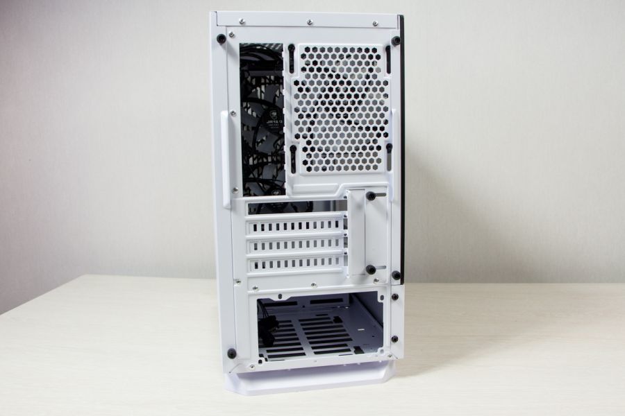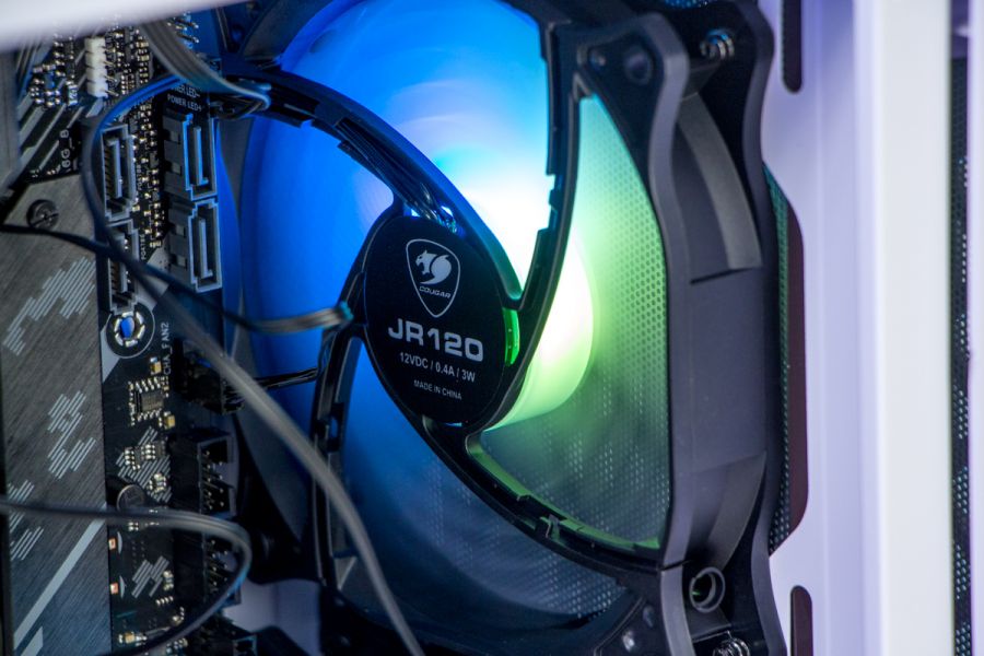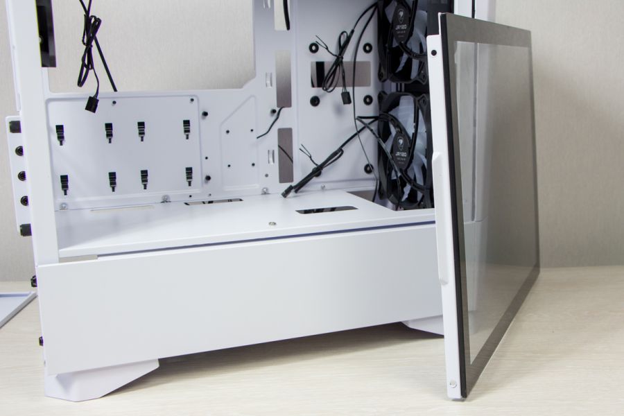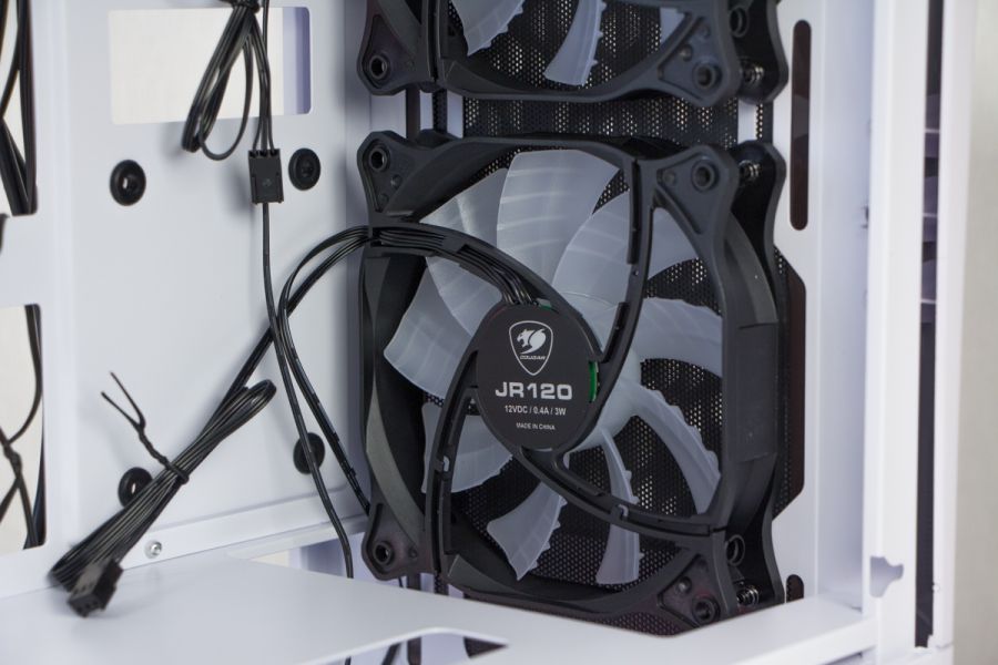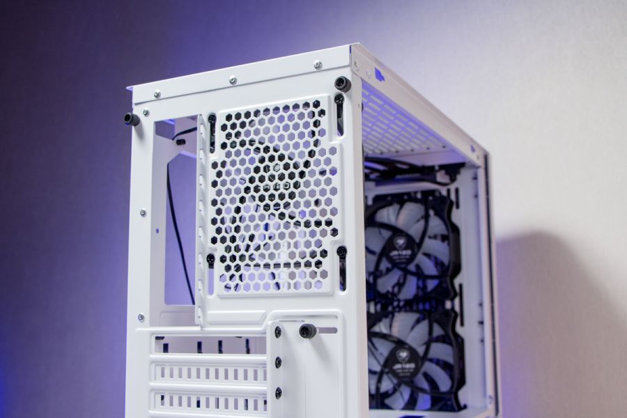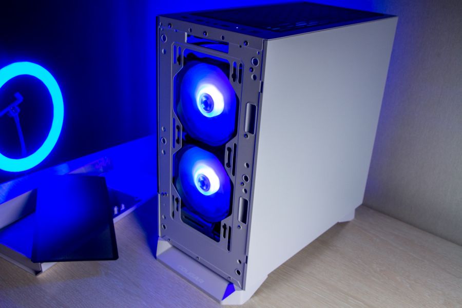 Позаду достатньо гачків для кріплення стяжок, тому, проявивши трохи творчості та терпіння, можна успішно уникнути безладу з кабелями. Після включення спалахують три встановлені вентилятори. Індикатор живлення зверху також повідомляє, що ваша система запущена та працює справно. Оскільки у верхній частині корпусу є клавіша перемикання підсвічування, можна швидко та зручно перемикатися між звичайним набором кольорів, а також кількома привабливими анімаціями. Під час підготовки тесту вимірював температуру всередині корпусу. Використовувалися штатні налаштування вентиляторів. Виходу показників за межі «розумних» не спостерігав. Висновки Cougar MG140 AIR RGB – цікавий корпус, який добре виглядає зовні та продуманий всередині. Погоджуся, що дизайн не для кожного та й колір не всім підійде. Але у Cougar є й чорний варіант. Однозначний плюс – три вентилятори ARGB на 120 мм вже в комплекті, а також контролер ARGB, до якого можна підключити додаткові елементи. Готову збірку можна зробити дуже яскравою. З точки зору ціни, модель MG140 AIR RGB не злякає і не здивує. На мою думку, за $100 покупець отримує достатньо: якість складання, прозору панель із загартованого скла та вентилятори з підсвічуванням, за які не потрібно доплачувати.