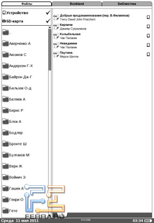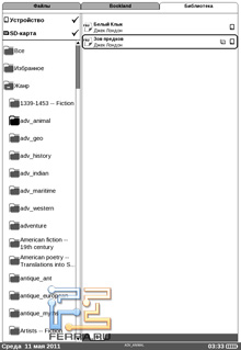 Синтезатор речи в PocketBook Pro 902 ничем не отличается от оного в Pro 602. Несколько голосов для разных языков (важно заранее выбрать верный, иначе получите карманного Мутко), изначально — только женские. Многих слов синтезатор не знает, а потому очень часто ошибается с ударением. Тем не менее, голова от такой речи кругом не идёт — просто ощущение, что слушаешь иностранца. Самое слабое место интерфейса — навигация по памяти. Ридер предоставляет два варианта: можно путешествовать по папкам файловой системы либо по структурированному каталогу, построенному на основе информации о жанрах произведений и форматов файлов. Оба варианта неудобные, путешествовать по огромным спискам с помощью одного навипада просто мучительно. Не хватает группировки книг по первой букве названия и по датам добавления в библиотеку.