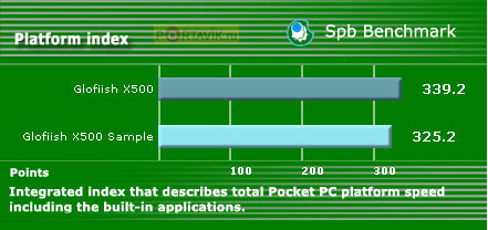 В ходе теста выяснилась одна крайне интересная деталь: результаты теста SBP Benchmark, проведенного на коммерческом и инженерном образце Glofiish X500, разительно отличаются друг от друга. Так CPU index коммерческого образца составляет 1573 пункта, против 540 у предкоммерческого!