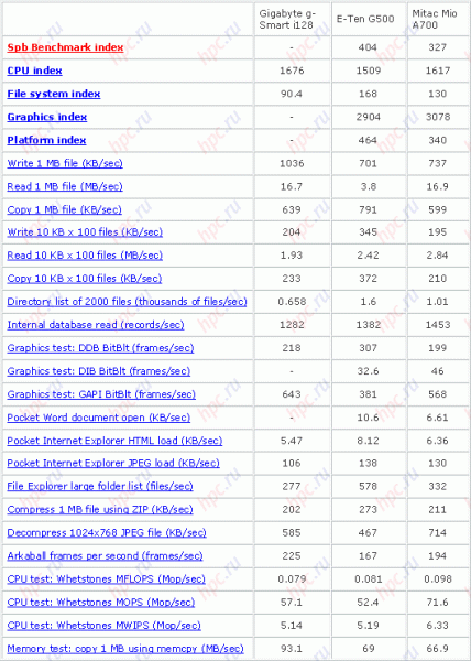 Впрочем, картинка все равно неслабо выцветает, хорошо хоть текст остается читабельным. В общем, жаль, что не предусмотрено побольше вариантов для настройки яркости. На наш взгляд, оптимальным вариантом было бы 8-10 шагов, пяти все-таки маловато. Если же сравнивать качество дисплея с ближайшими аналогами, то можно вспомнить недавний ASUS P525. Правда у него, как вы помните, диагональ была чуть больше – 2.8 дюйма. Быстродействие и памятьО процессоре Intel XScale PXA272 в наших обзорах говорилось немало. В случае с Gigabyte GSmart i128 он работает на частоте 416 МГц. Ну и прежде, чем перейти к тестированию, отметим, что ощутимых притормаживаний при обычном использовании не наблюдается. Под "обычным" следует понимать работу с документами MS Word, базой контактов, таблицами в Excel, чтением PDF-файлов, музыкой и видео. Как мы увидим ниже, с проигрыванием очень качественных роликов коммуникатор справляется слабовато, но в целом работает он довольно быстро. Приложения, позволяющего управлять тактовой частотой процессора здесь, к сожалению, нет, поэтому приходится полагаться на автоматический режим. Что ж, для тестирования общей производительности, как обычно, применялся тестовый пакет Spb Benchmark от компании Spb Software House. И в очередной раз мы вынуждены отметить, что из-за новой организации памяти в этой ОС бенчмарк некорректно рассчитывает быстродействие платформы и индекс файловой системы, а посему мы будем обращать внимание только на пункты Graphic Index и CPU Index. Однако тест прошел с несколькими ошибками, из-за которых сравнивать можно буквально пару пунктов. Трудно сказать, в чем причина, но Spb Benchmark упорно не хотел проходить без ошибок. Итак, давайте взглянем на результаты.